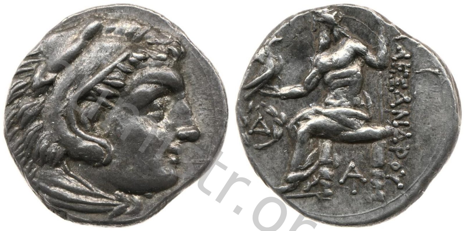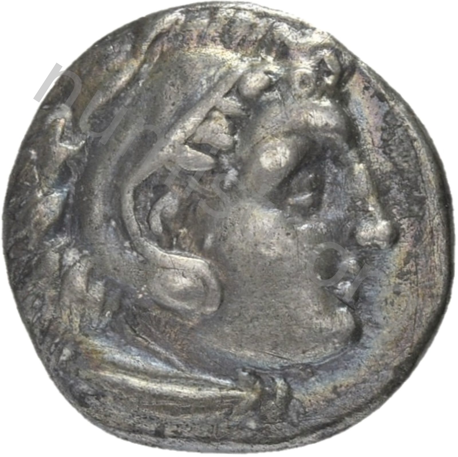 Head of beardless Heracles right wearing lion skin headdress -[en]