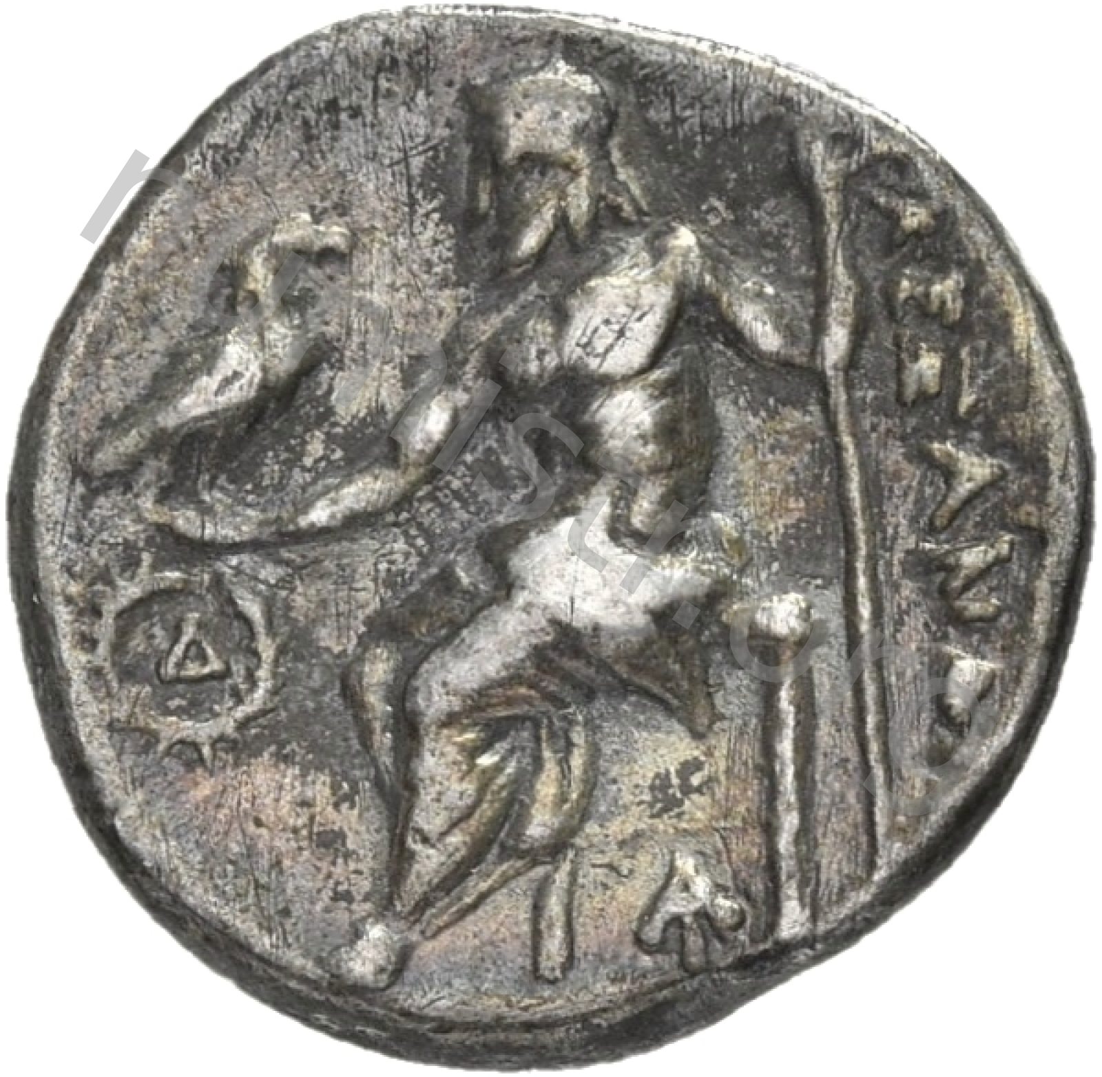 Zeus tabure-tahtta oturuyor sol elinde kartal sağ elinde asa var.