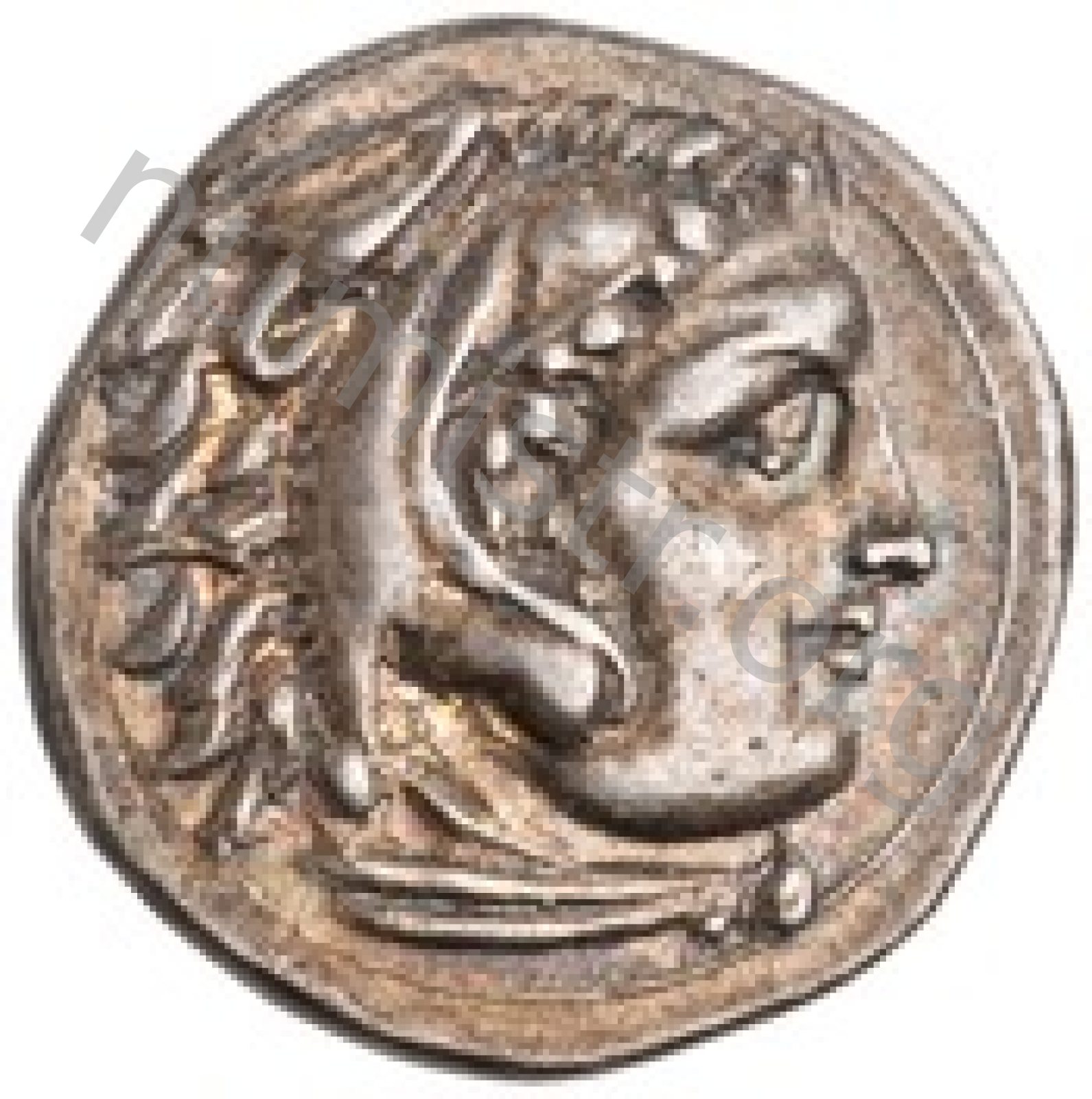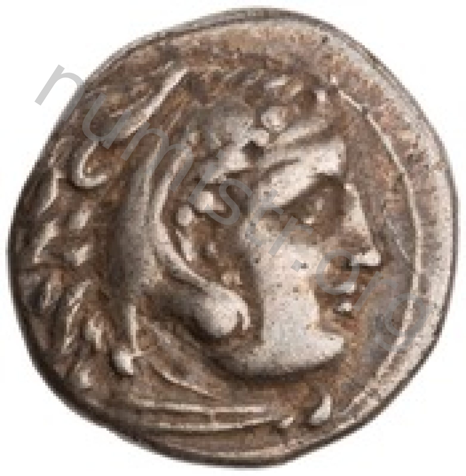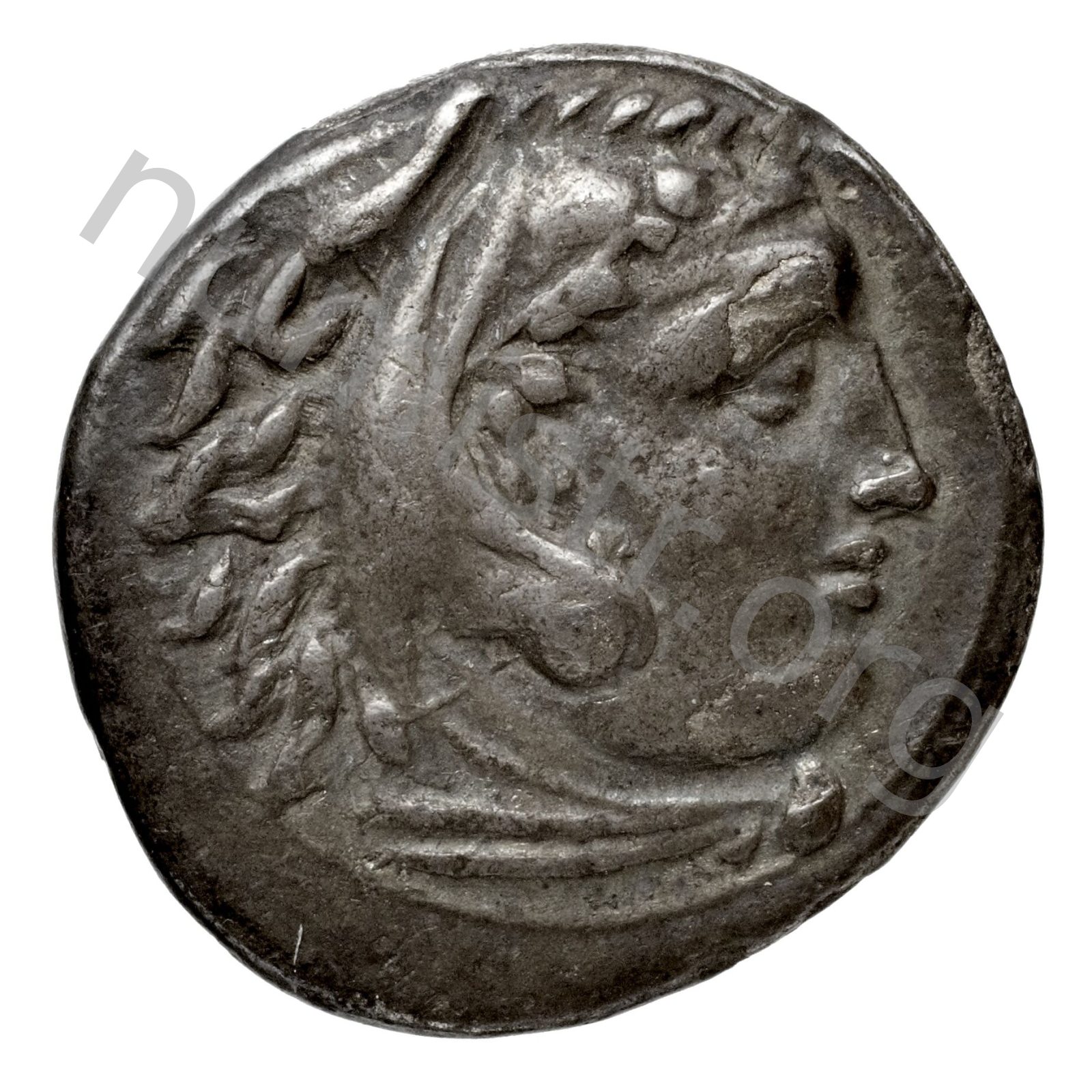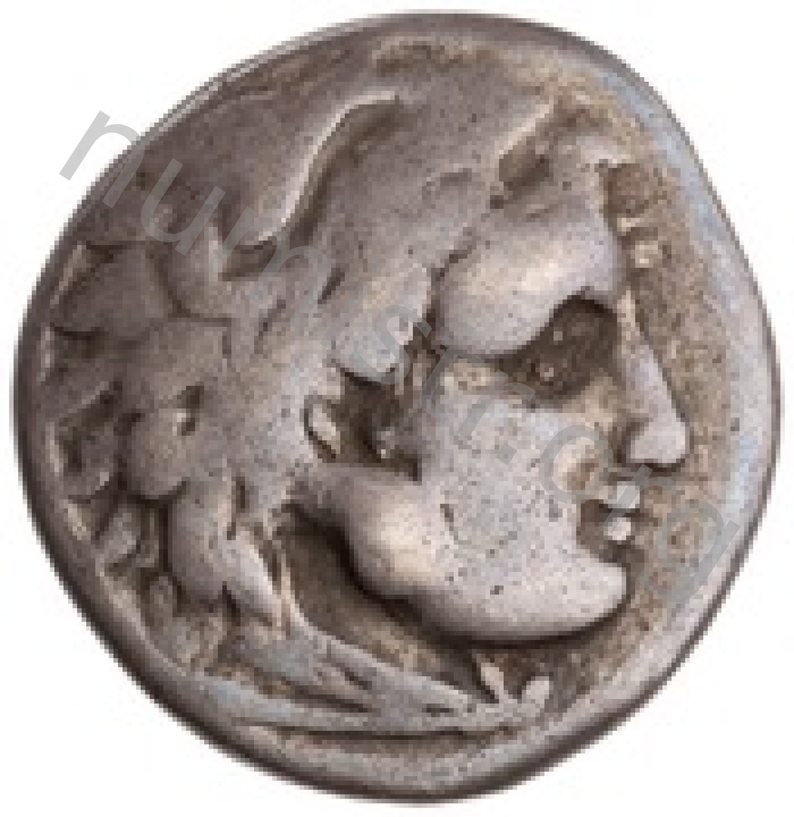 Head of beardless Heracles right wearing lion skin headdress -[en]