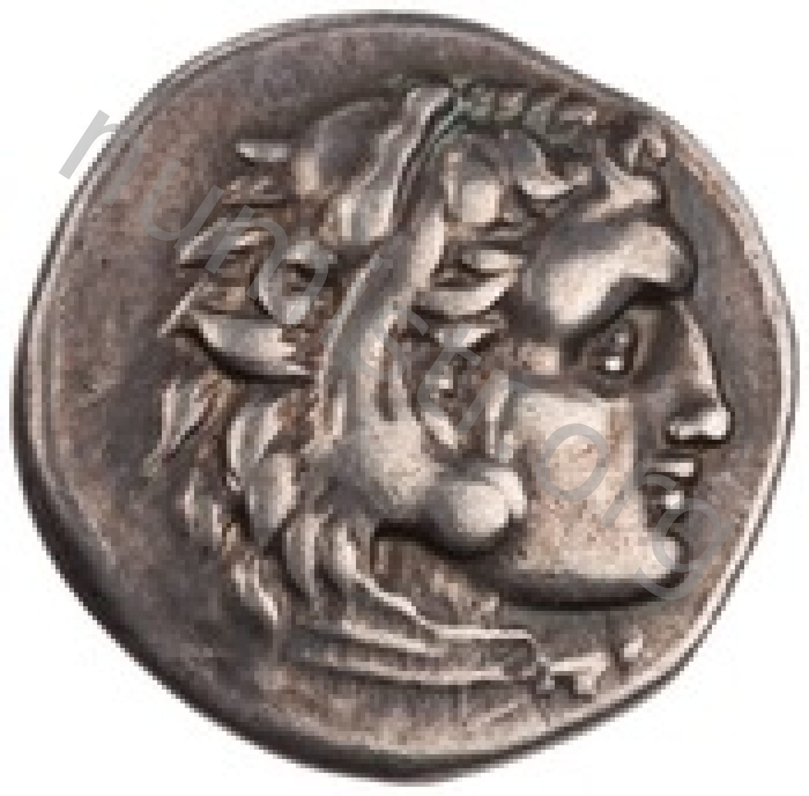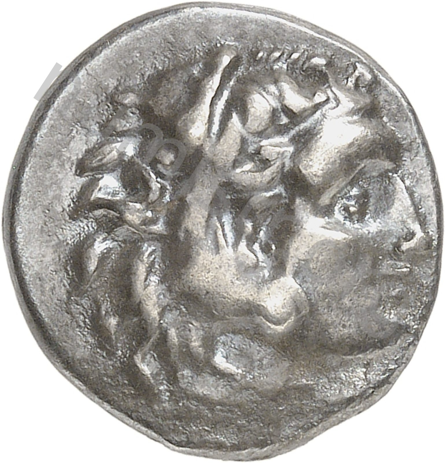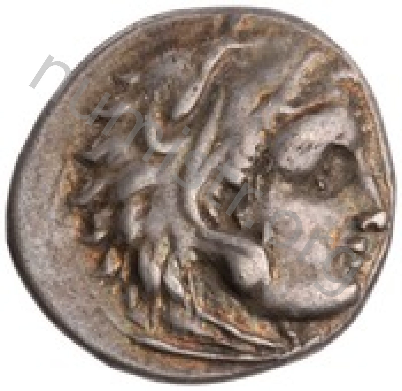 Head of beardless Heracles right wearing lion skin headdress -[en]
