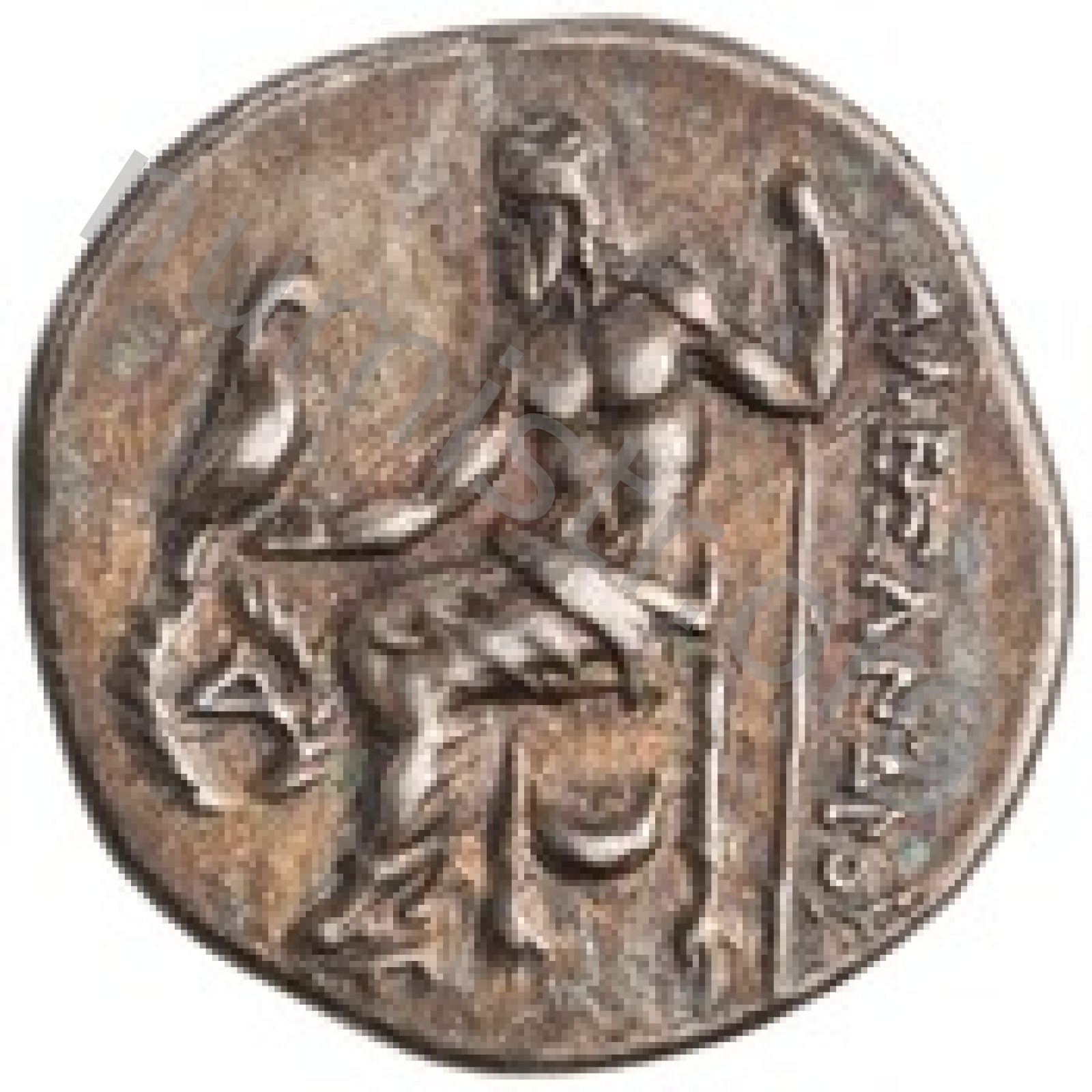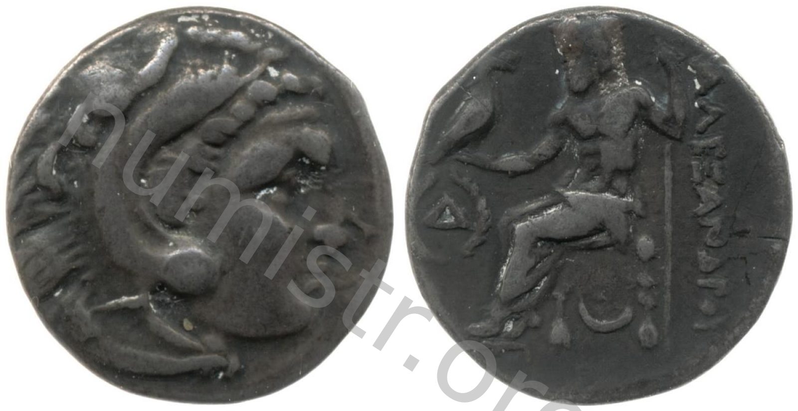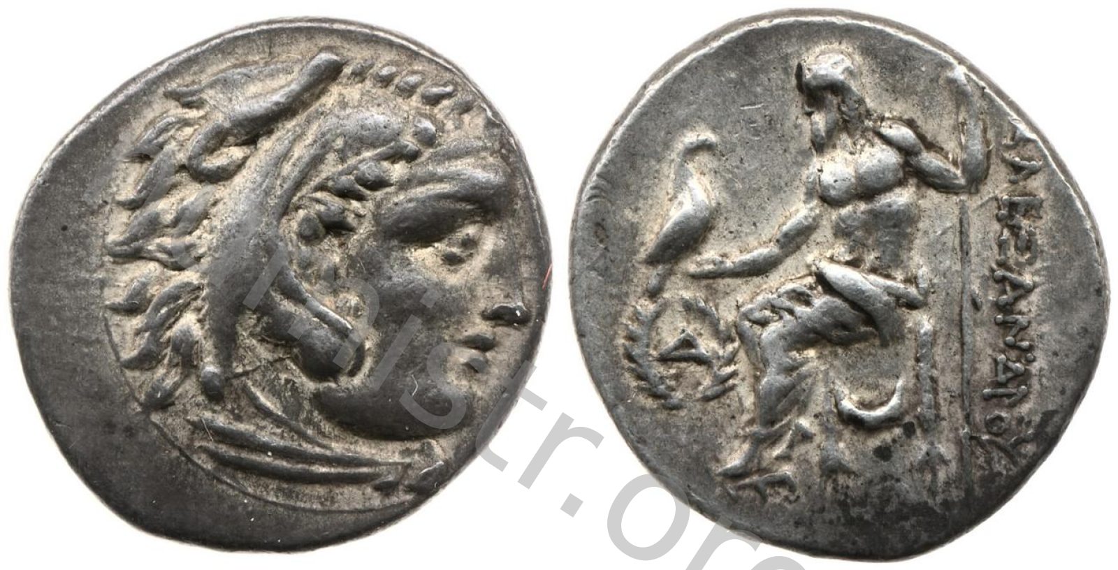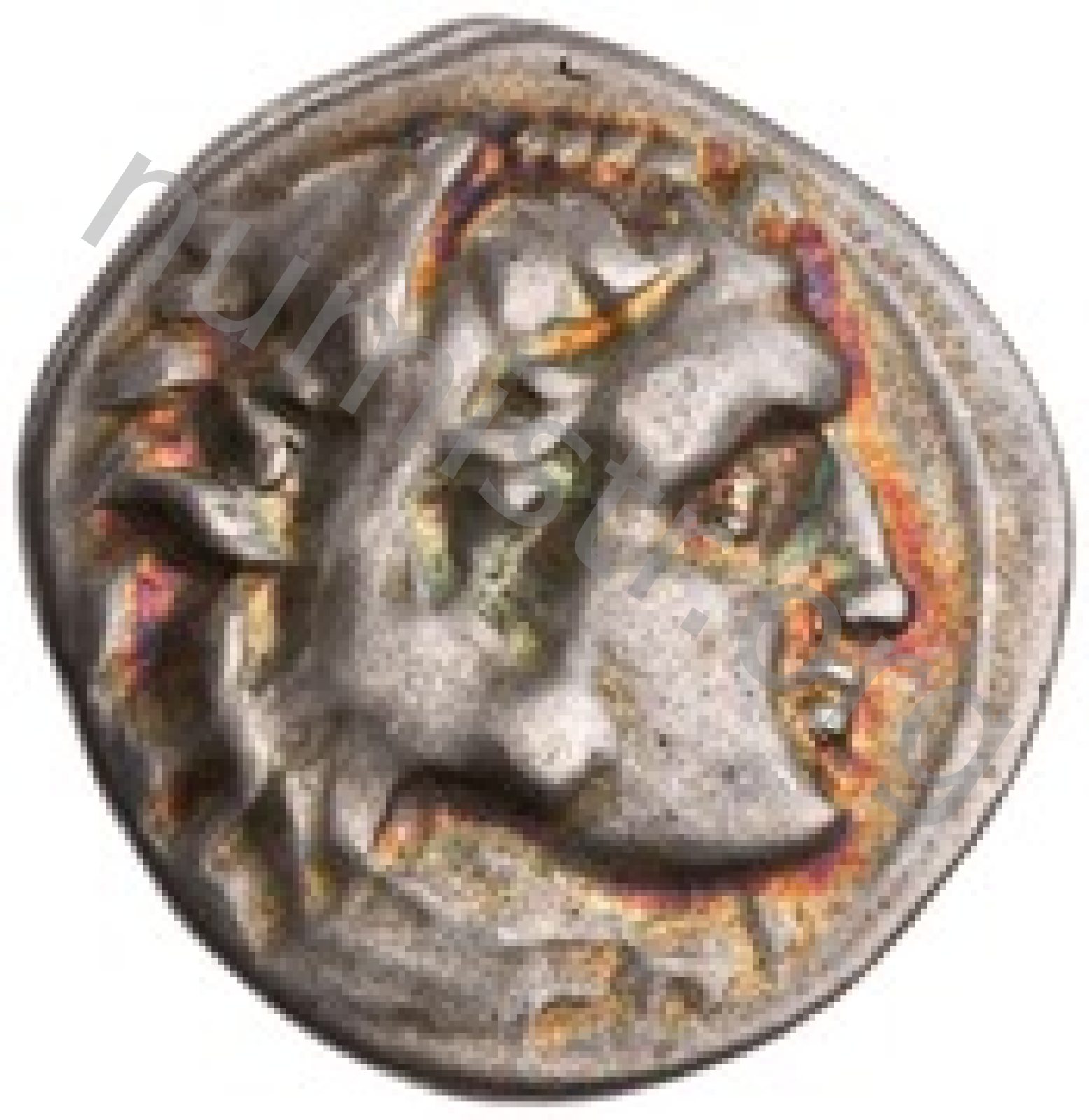 Head of beardless Heracles right wearing lion skin headdress -[en]