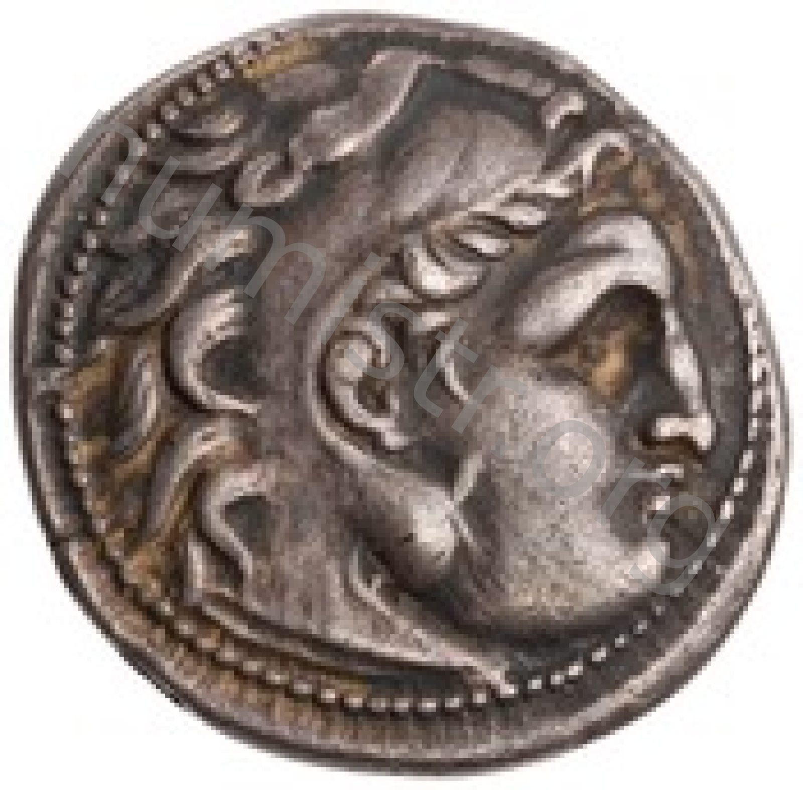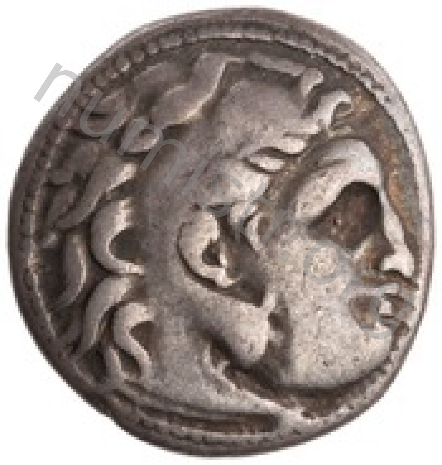 Head of beardless Heracles right wearing lion skin headdress -[en]