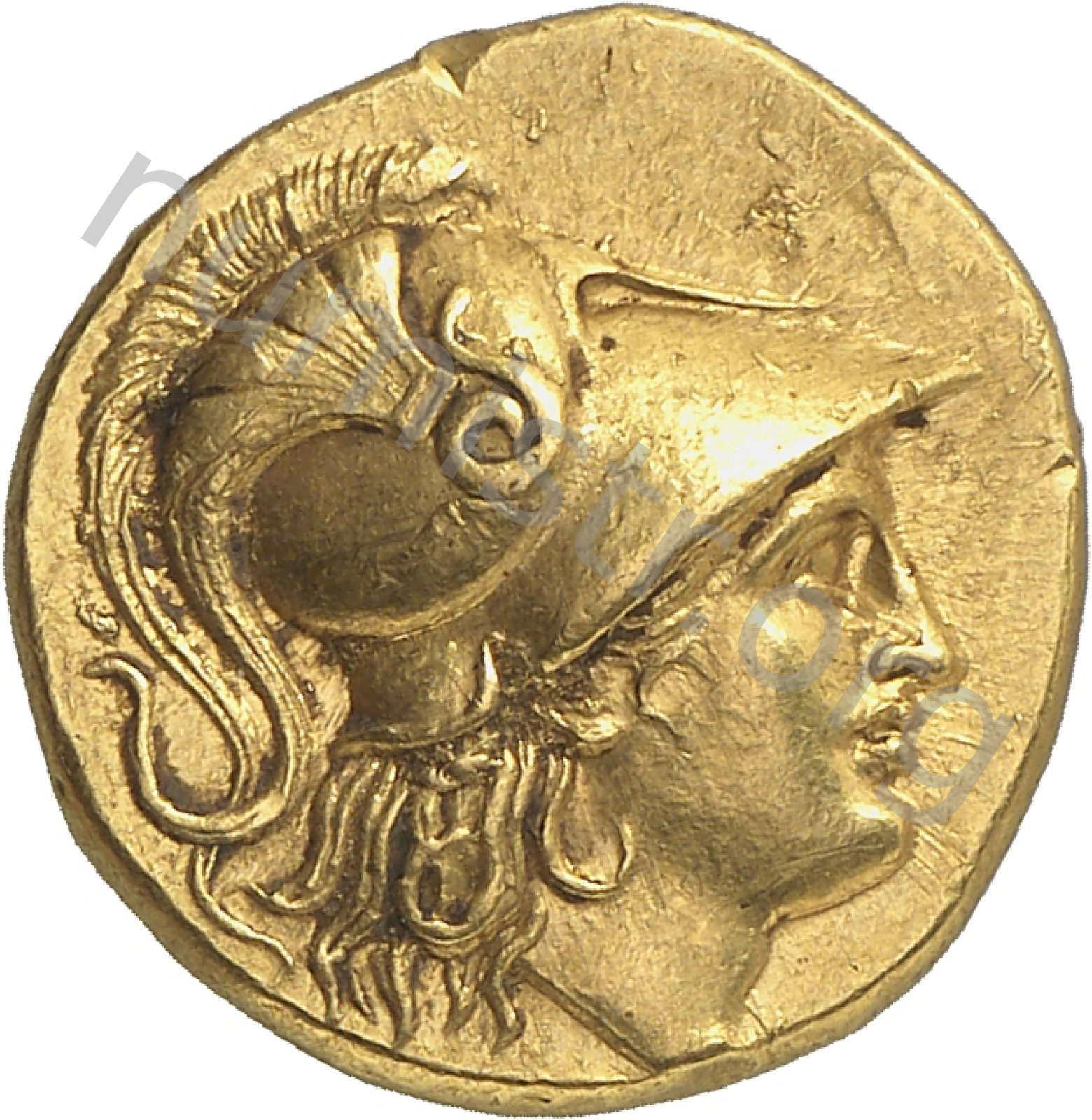 Head of Athena right wearing Corinthian helmet with crest -[en]