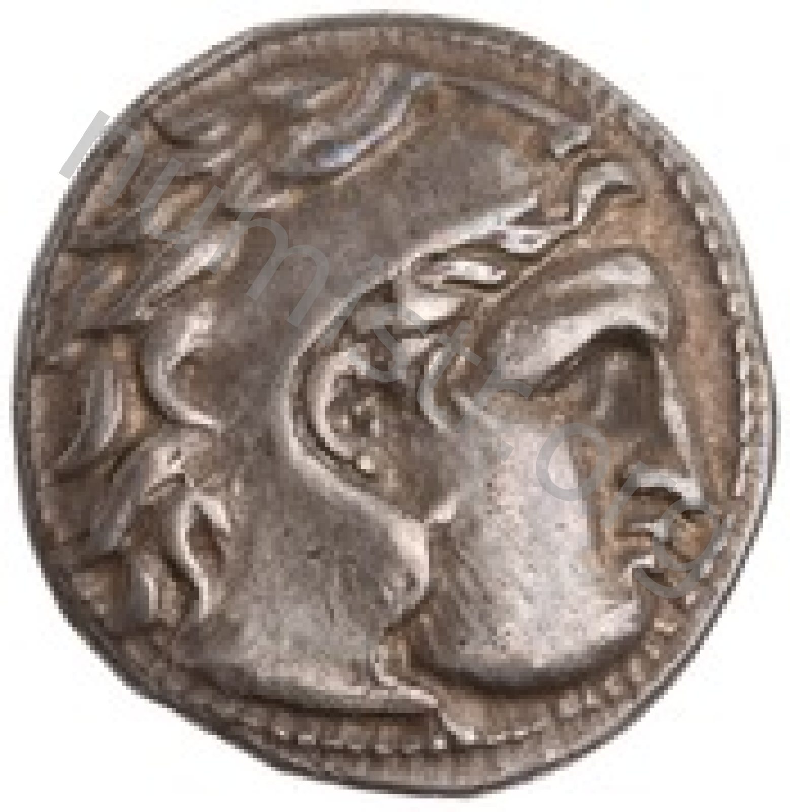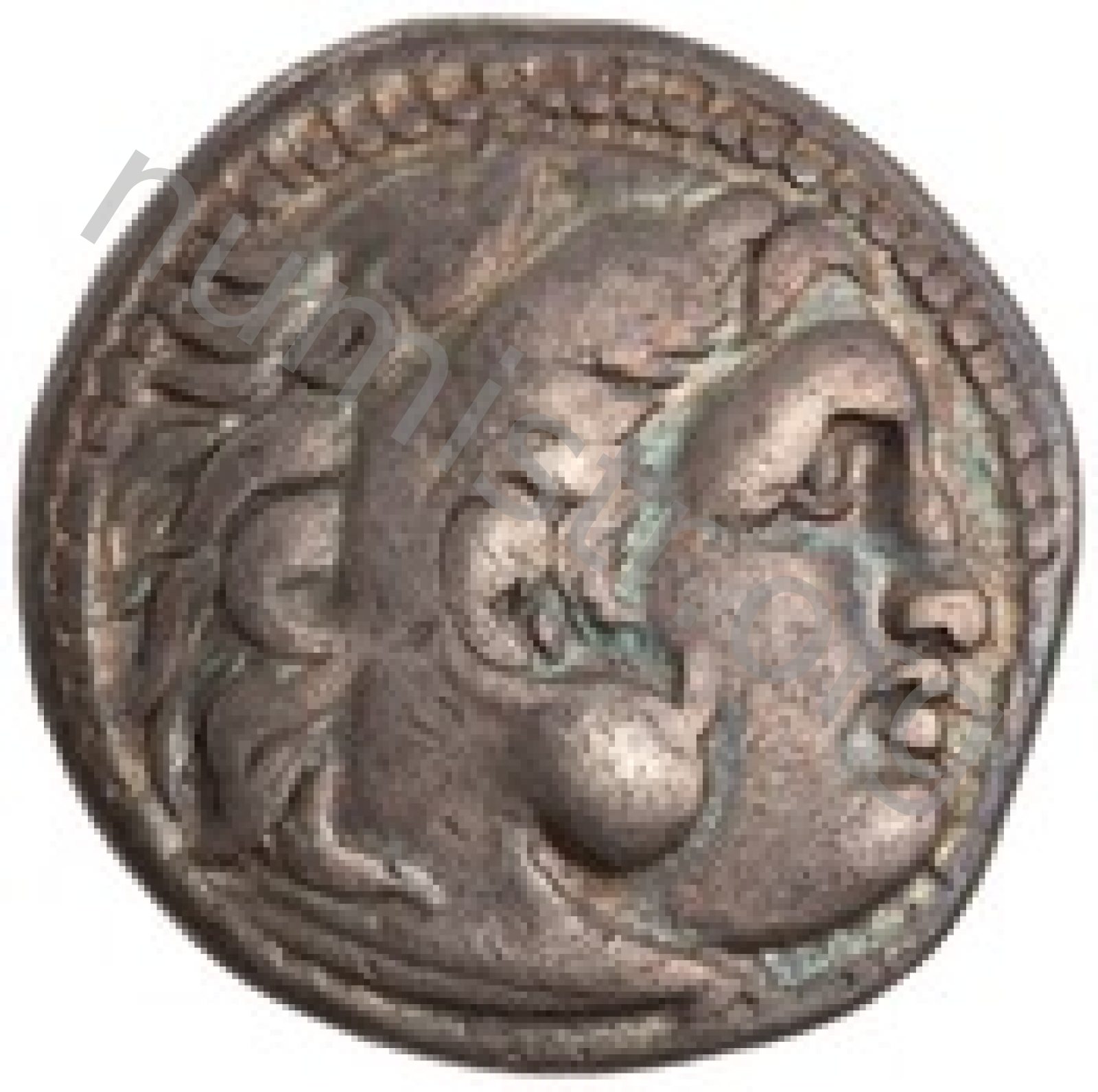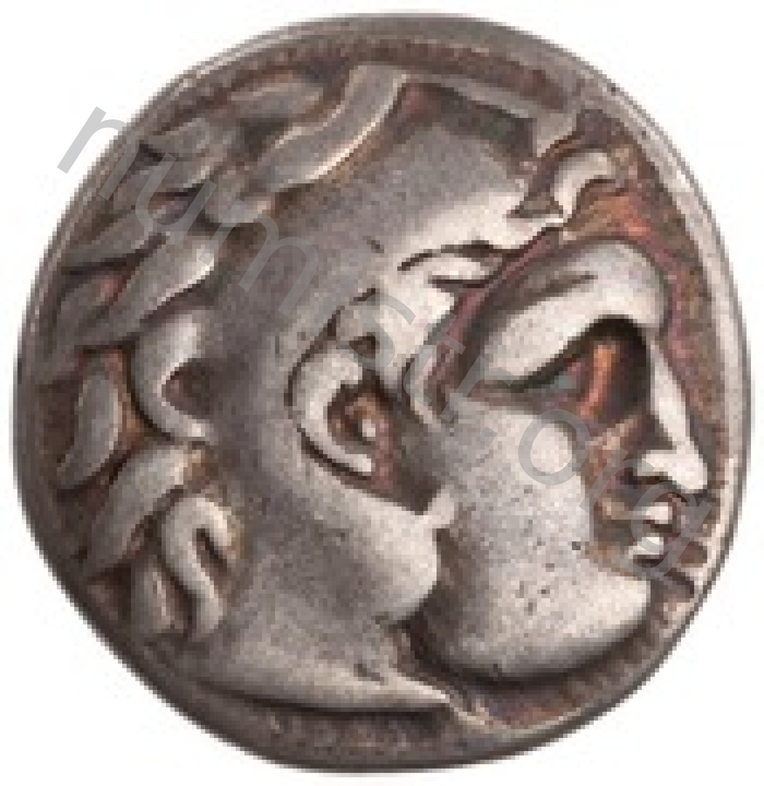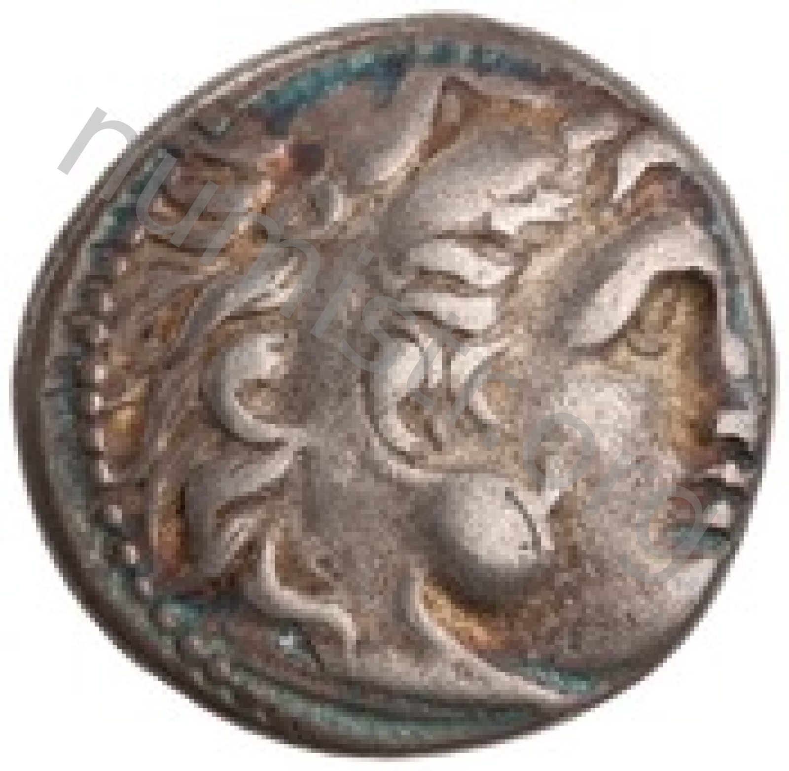 Head of beardless Heracles right wearing lion skin headdress -[en]