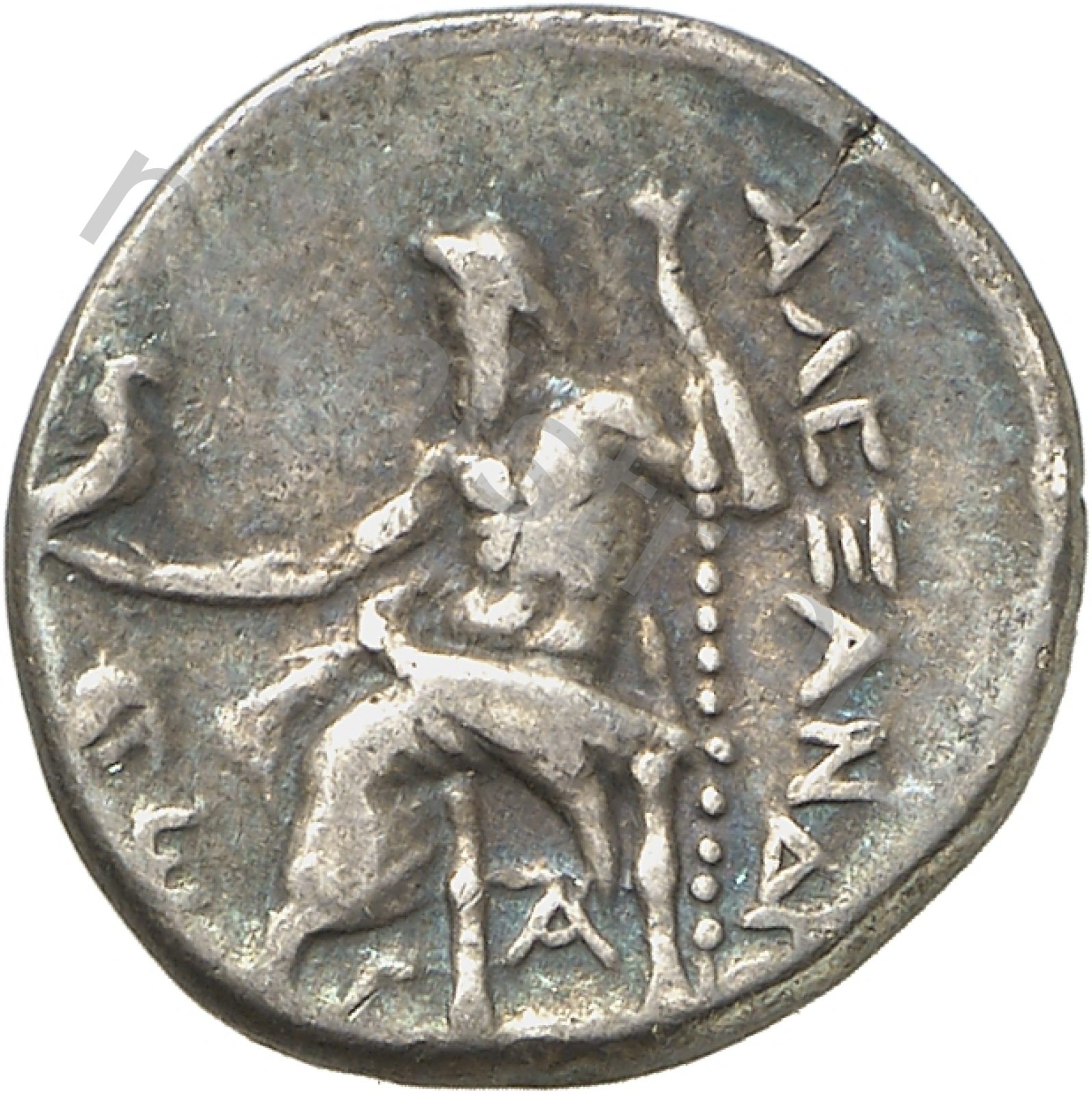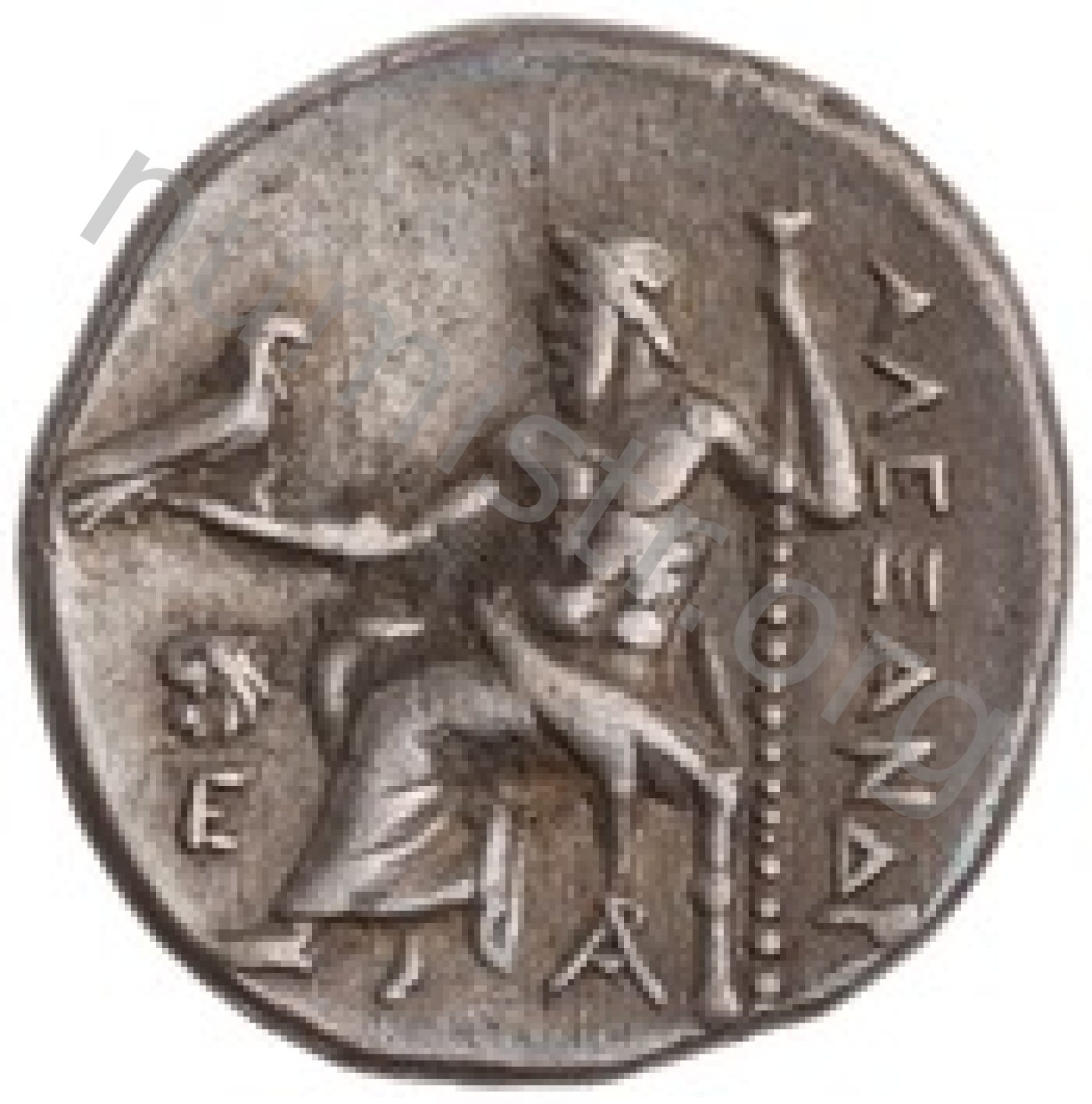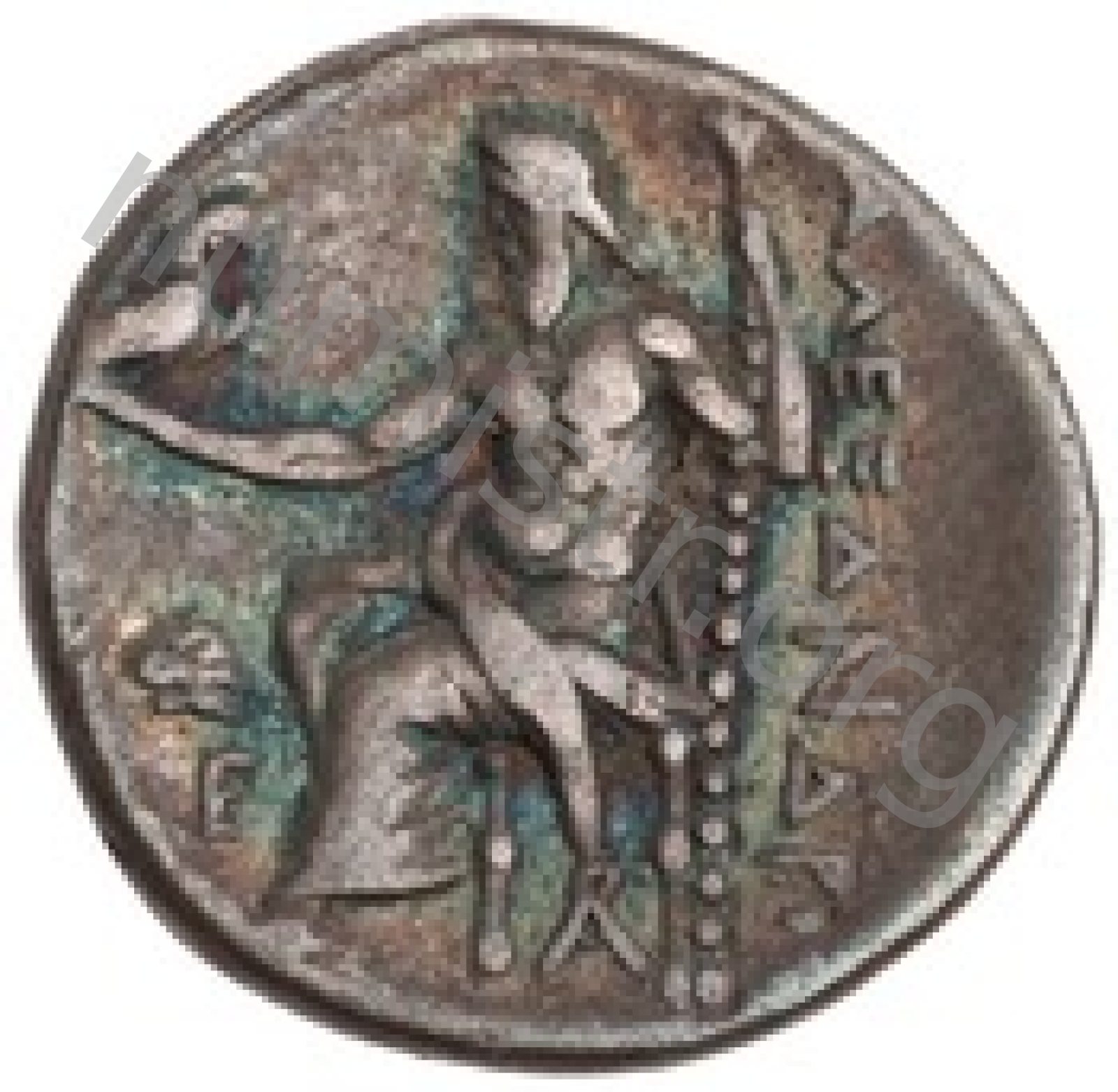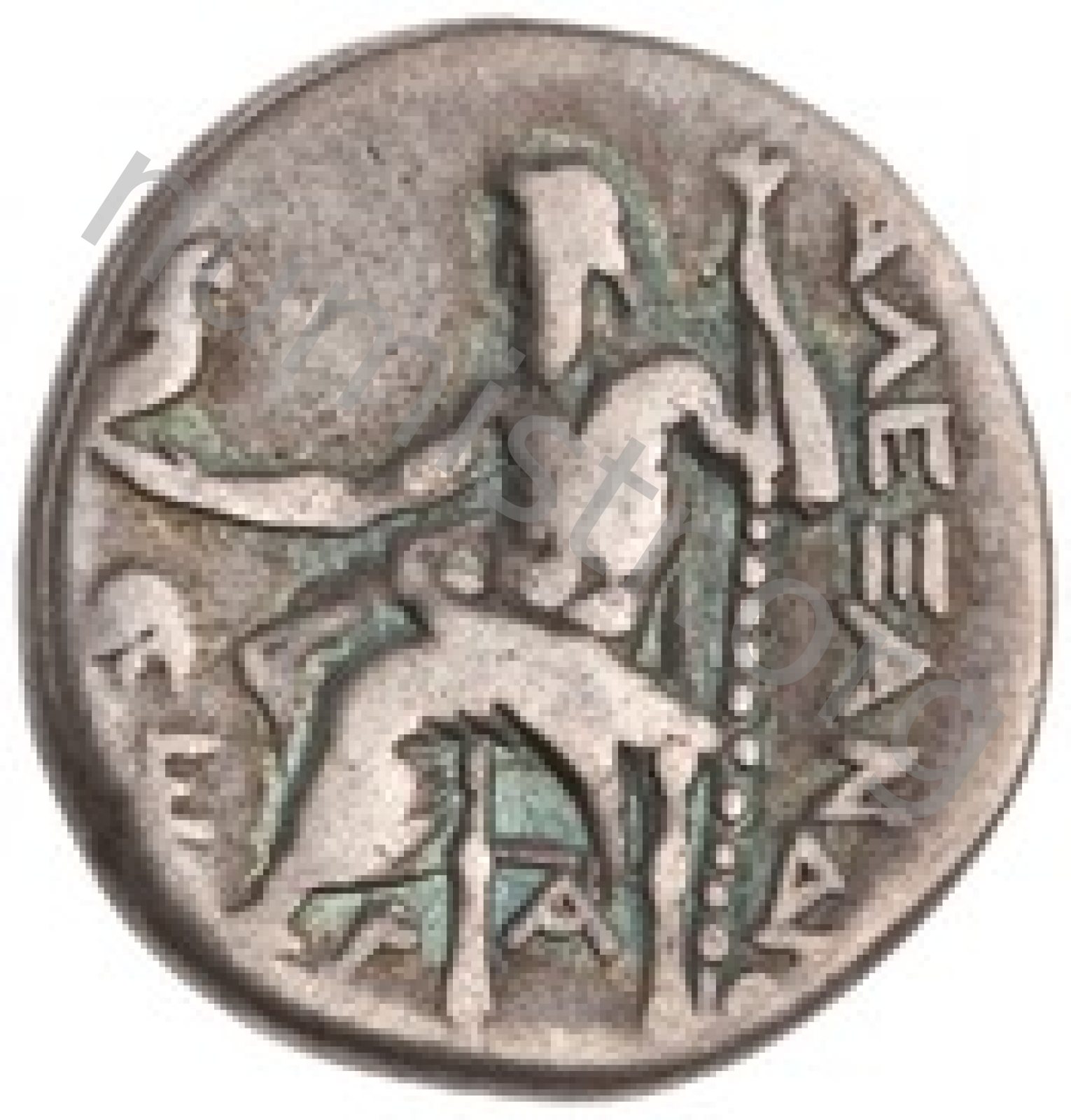 Zeus seated on stool-throne left eagle on outstretched right hand sceptre in left hand -[en]