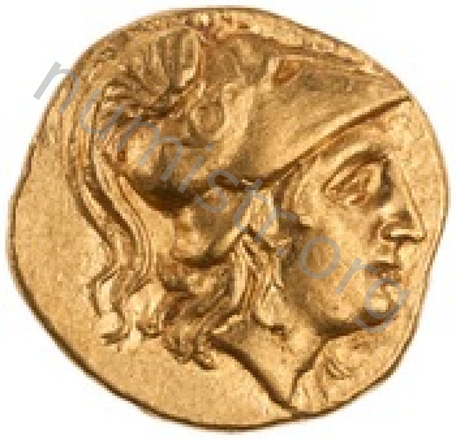Head of Athena right wearing Corinthian helmet with crest -[en]