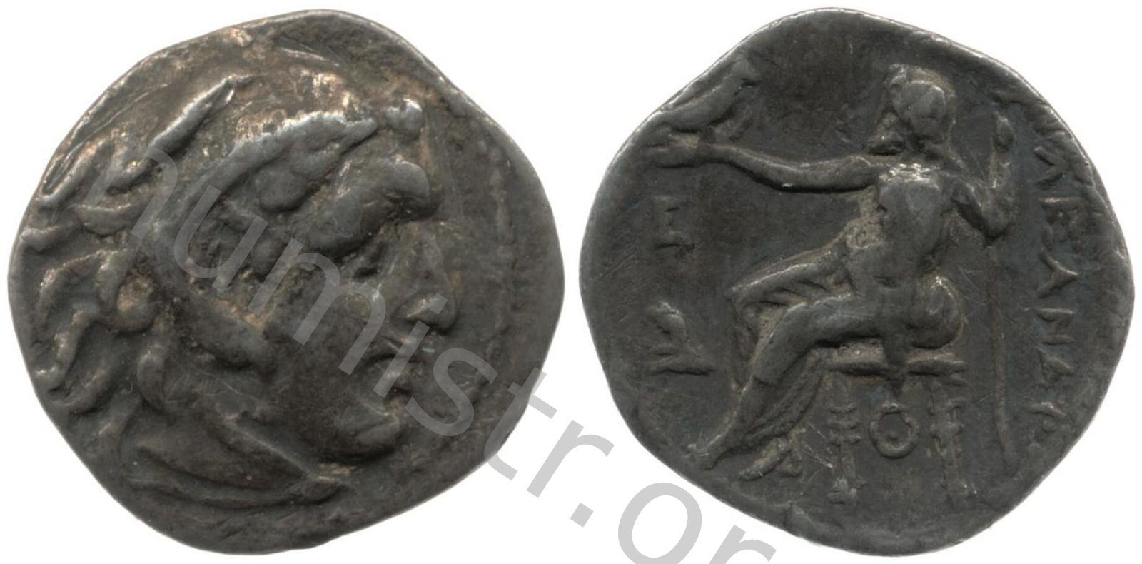 Head of beardless Heracles right wearing lion skin headdress -[en]