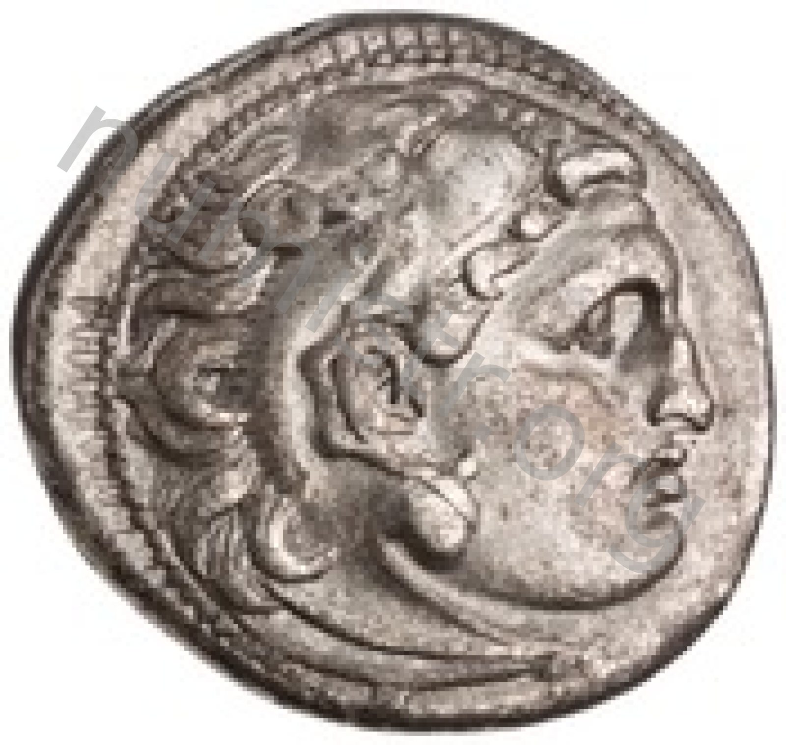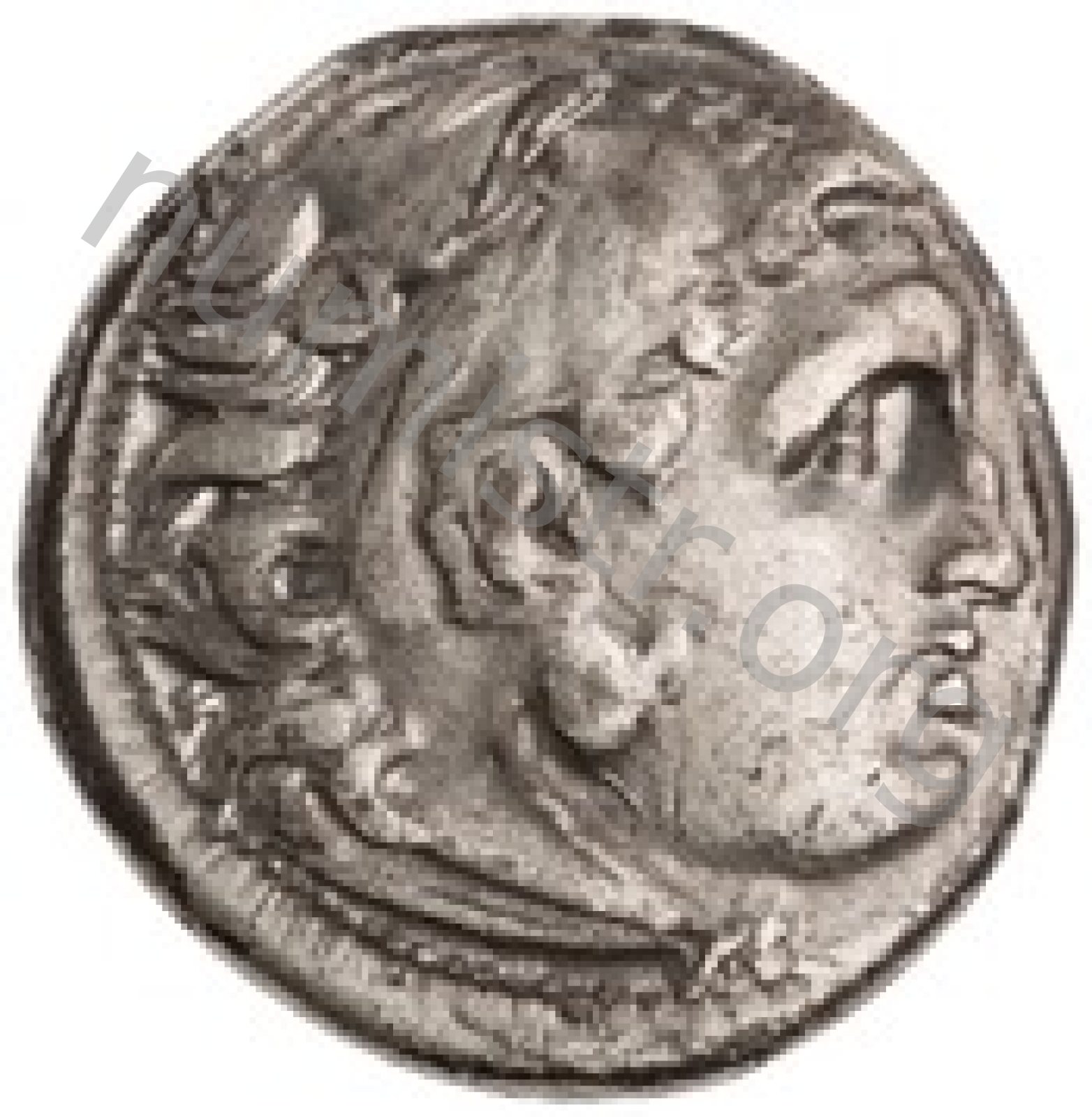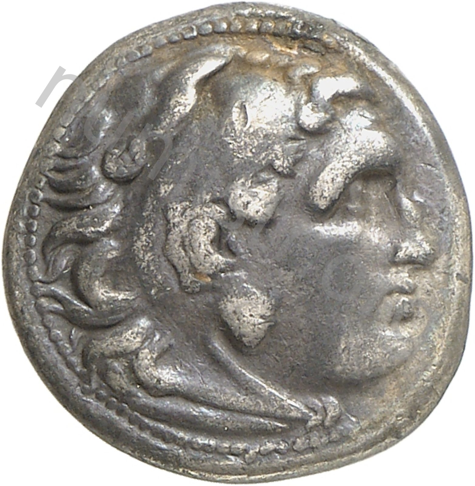 Head of beardless Heracles right wearing lion skin headdress -[en]