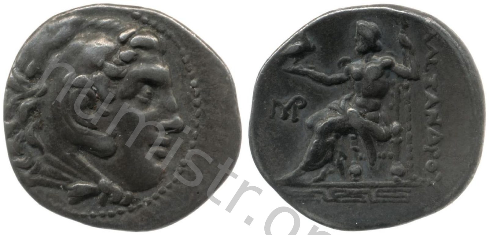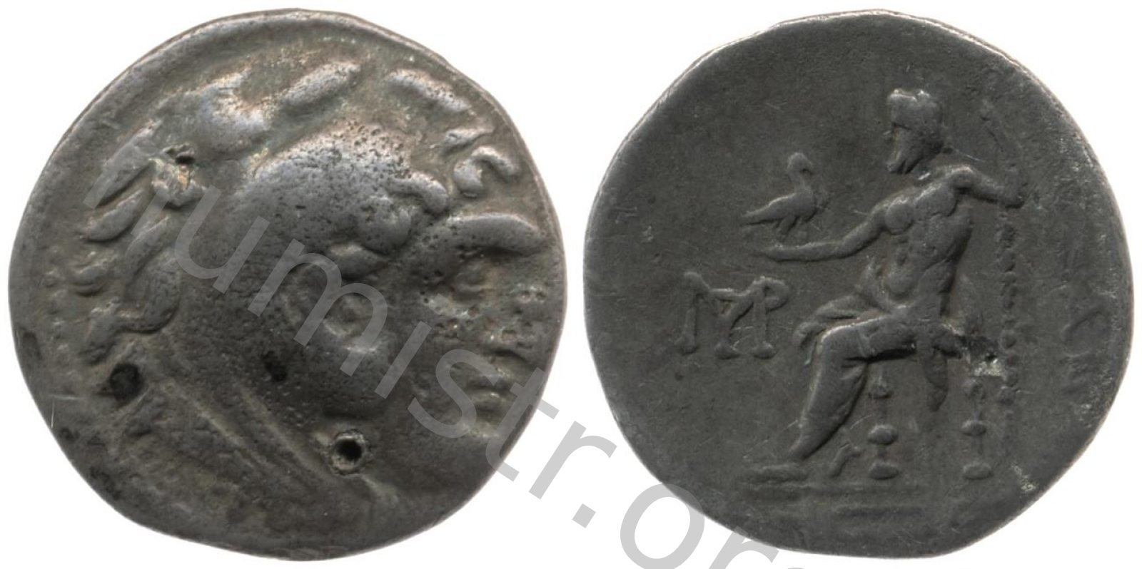 Head of beardless Heracles right wearing lion skin headdress -[en]