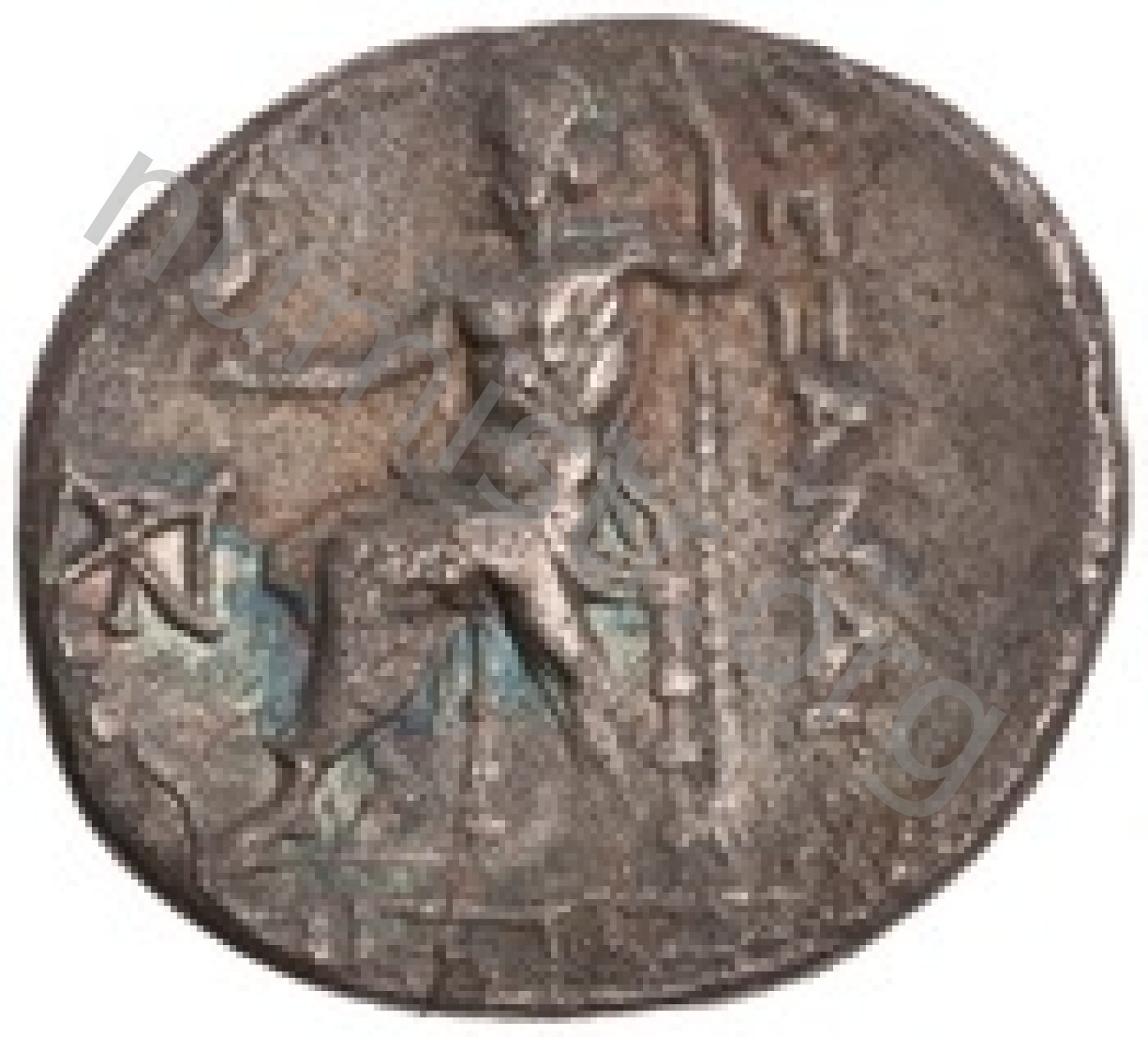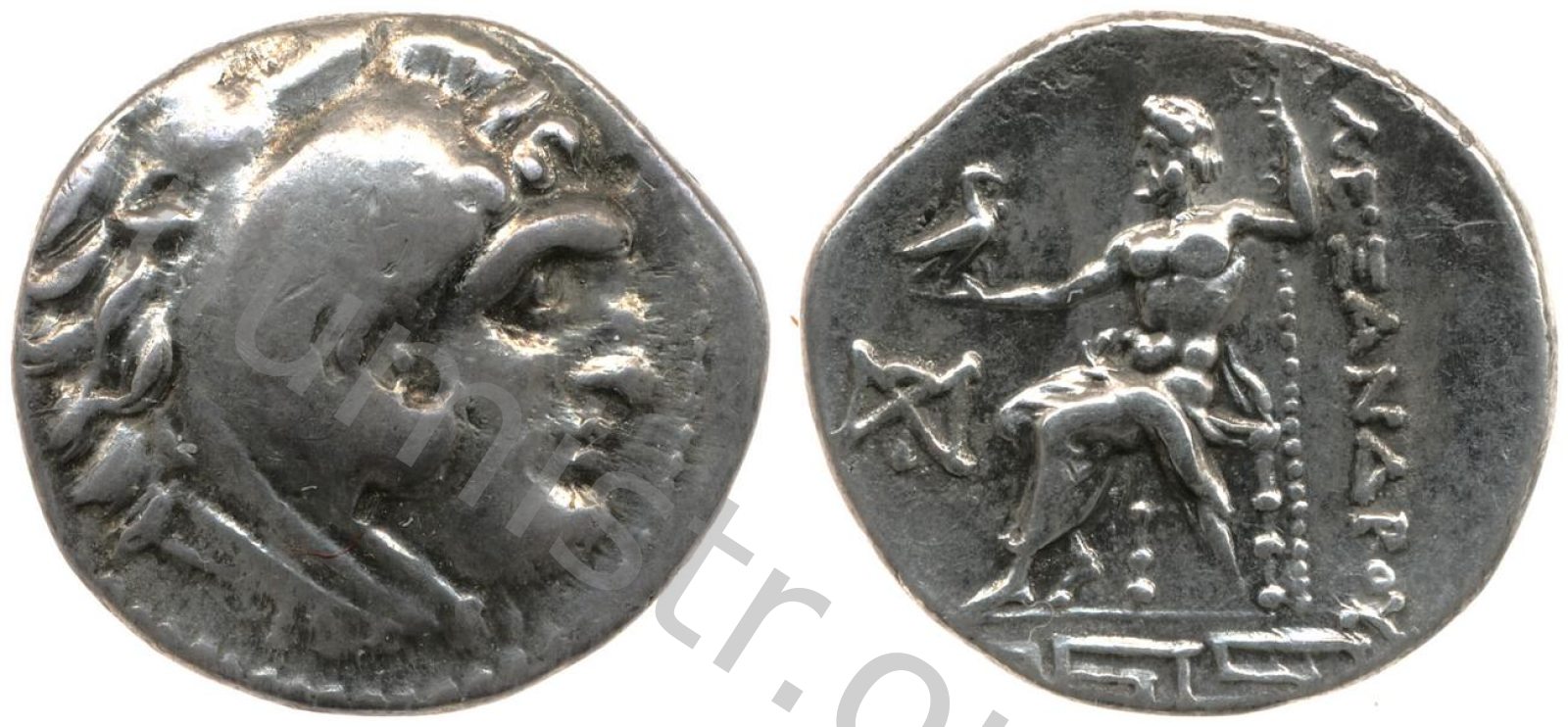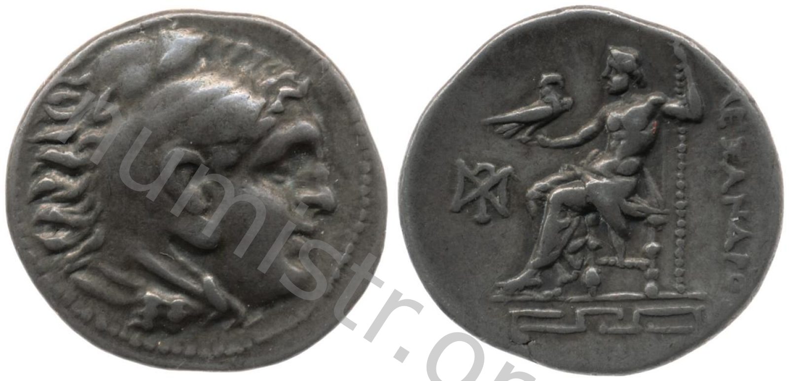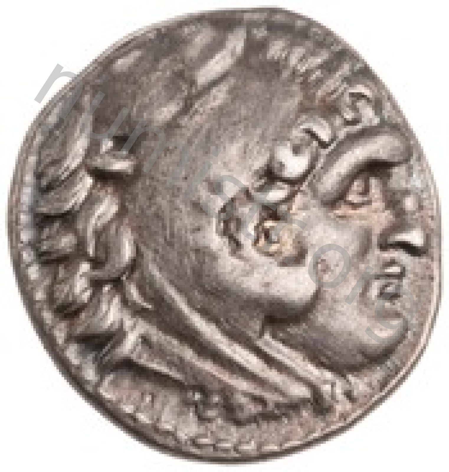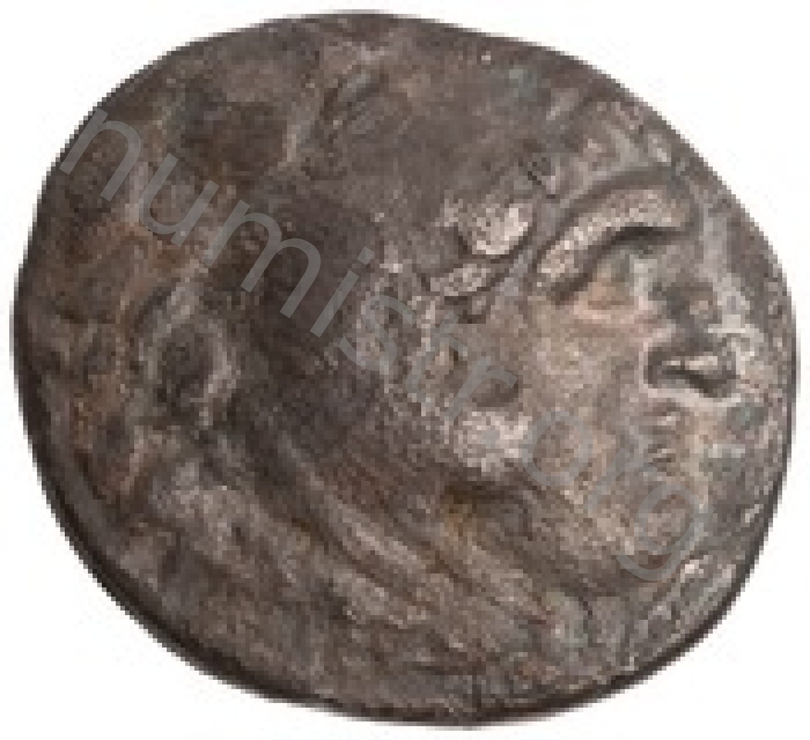 Head of beardless Heracles right wearing lion skin headdress -[en]