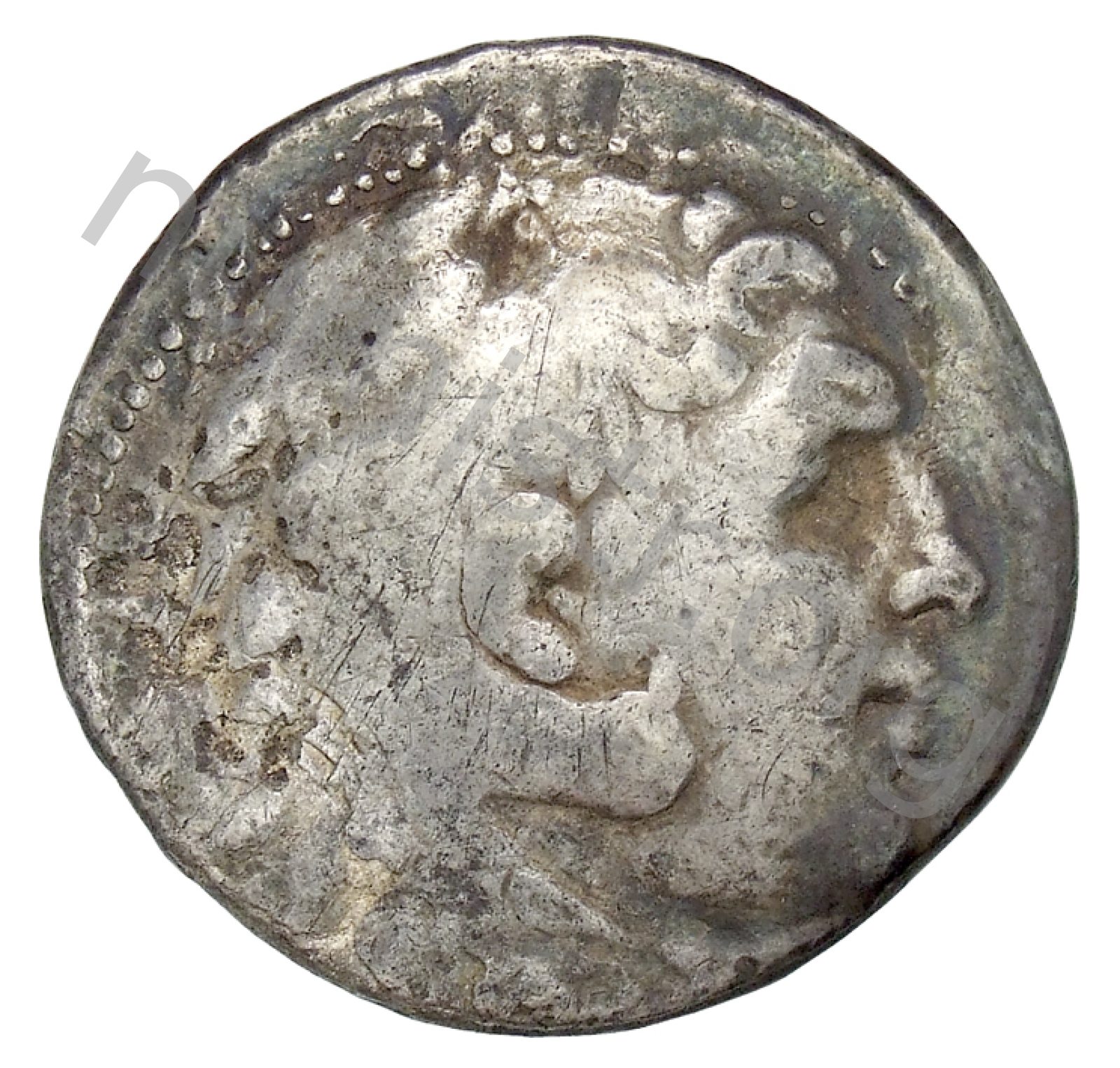 Head of beardless Heracles right wearing lion skin headdress -[en]