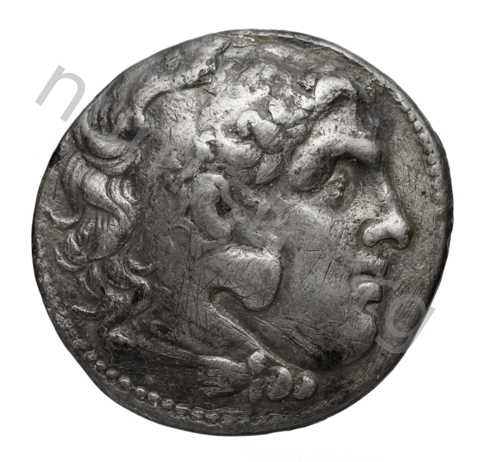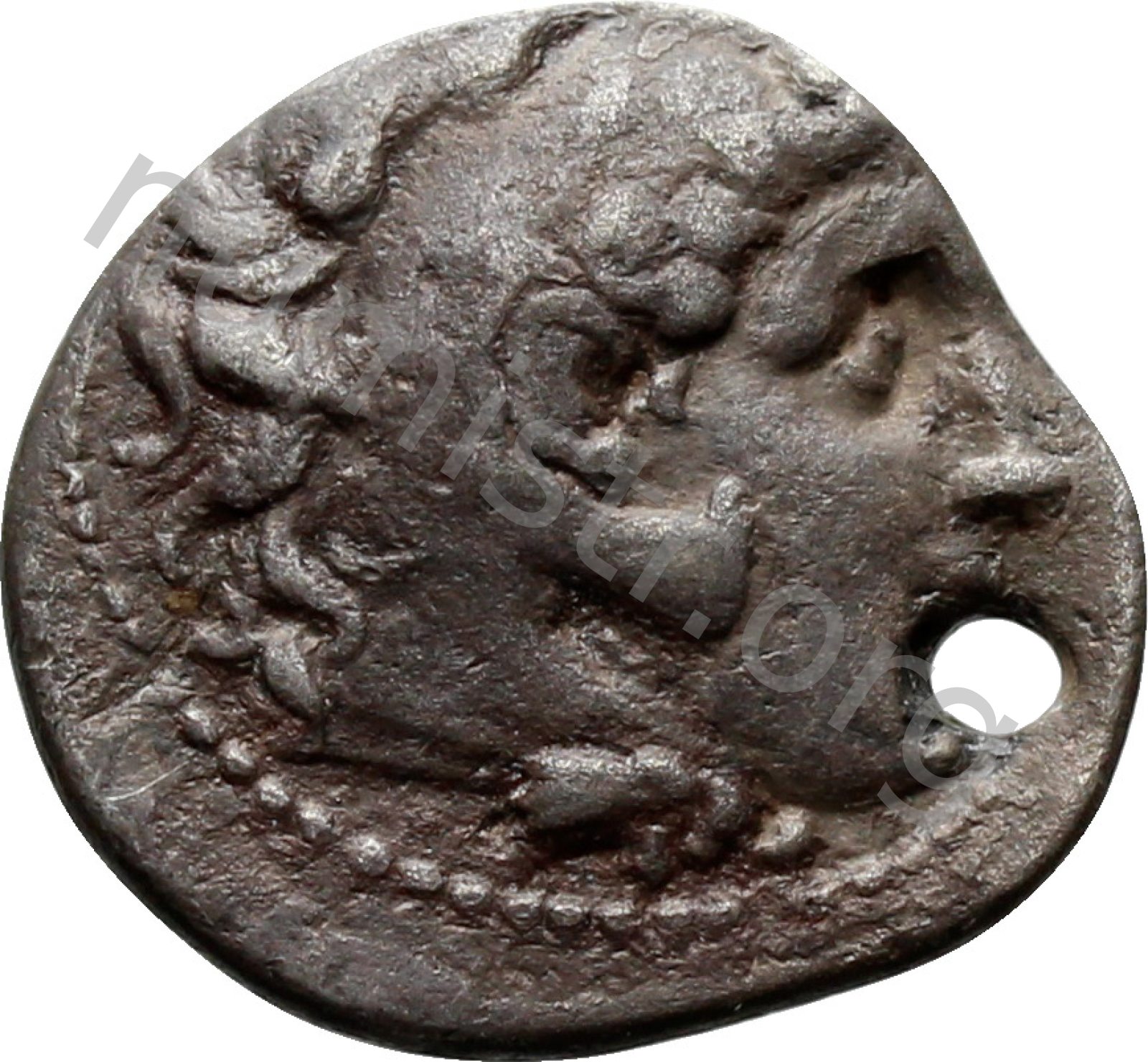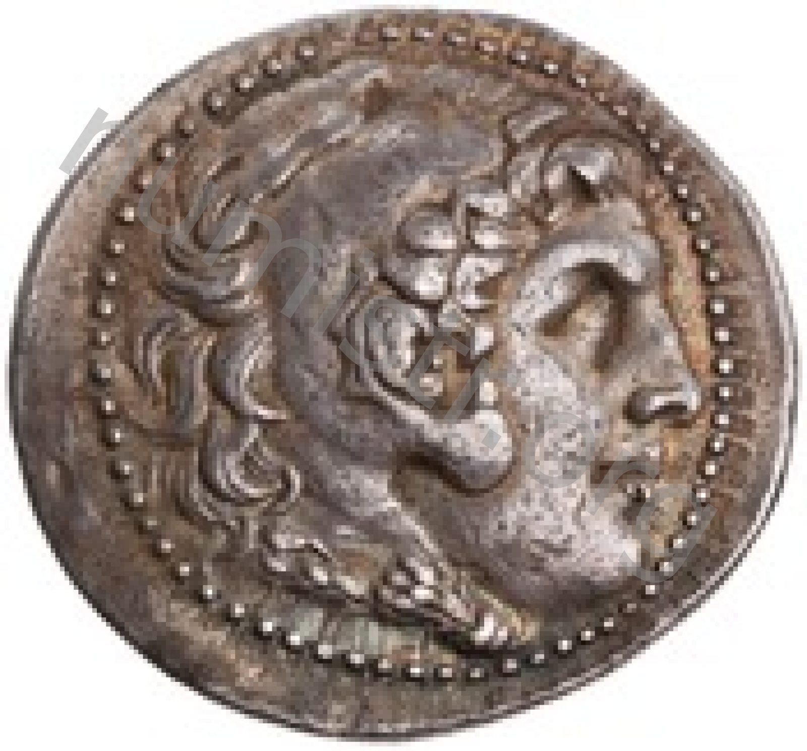 Head of beardless Heracles right wearing lion skin headdress -[en]