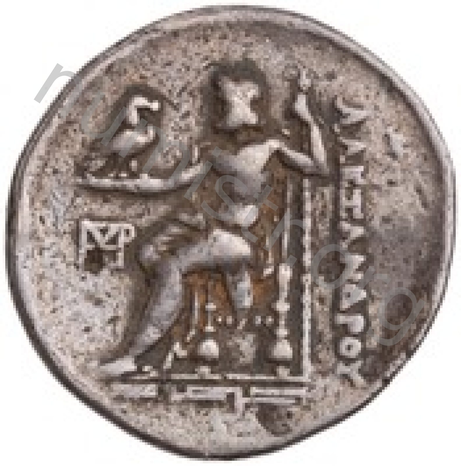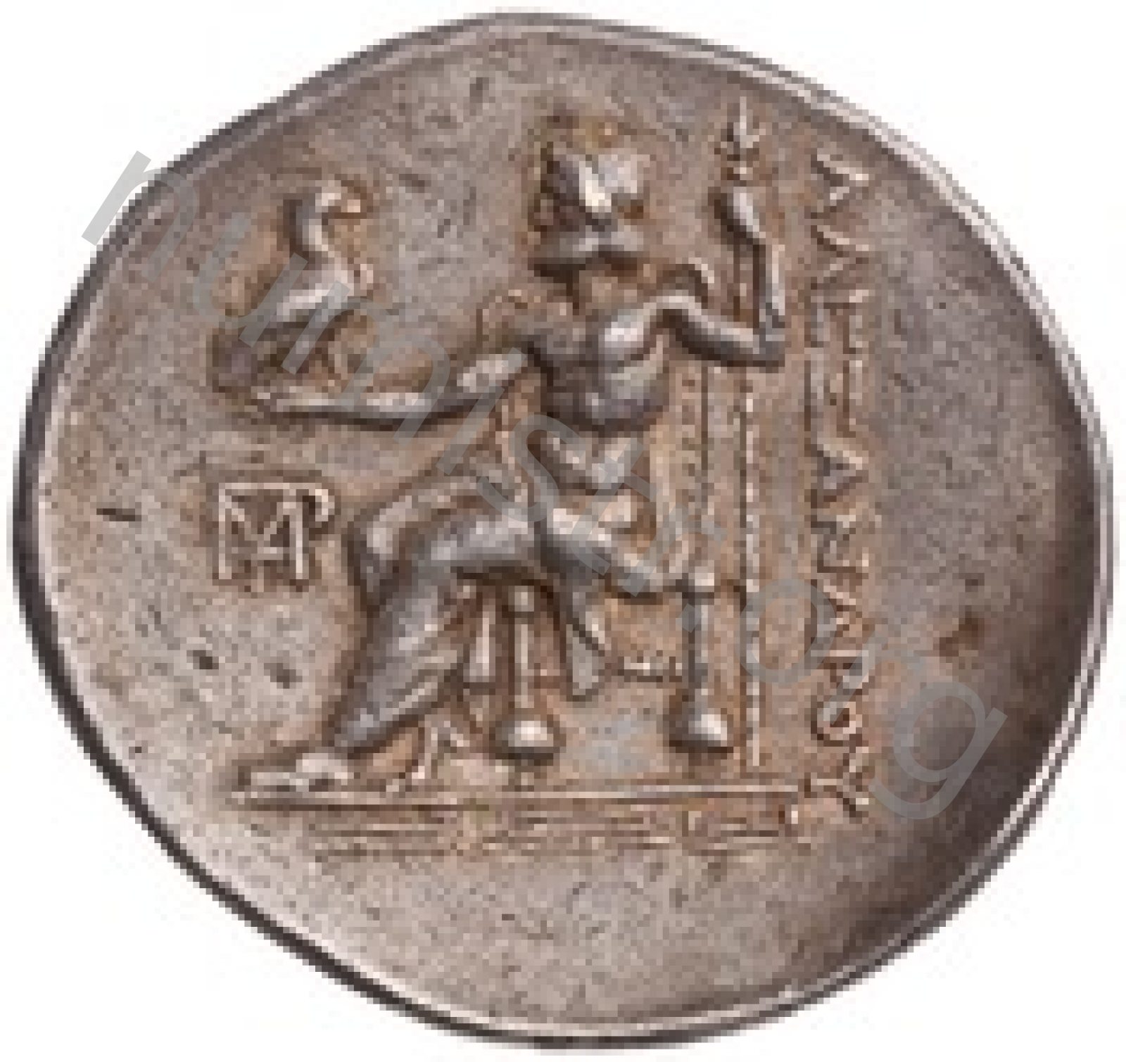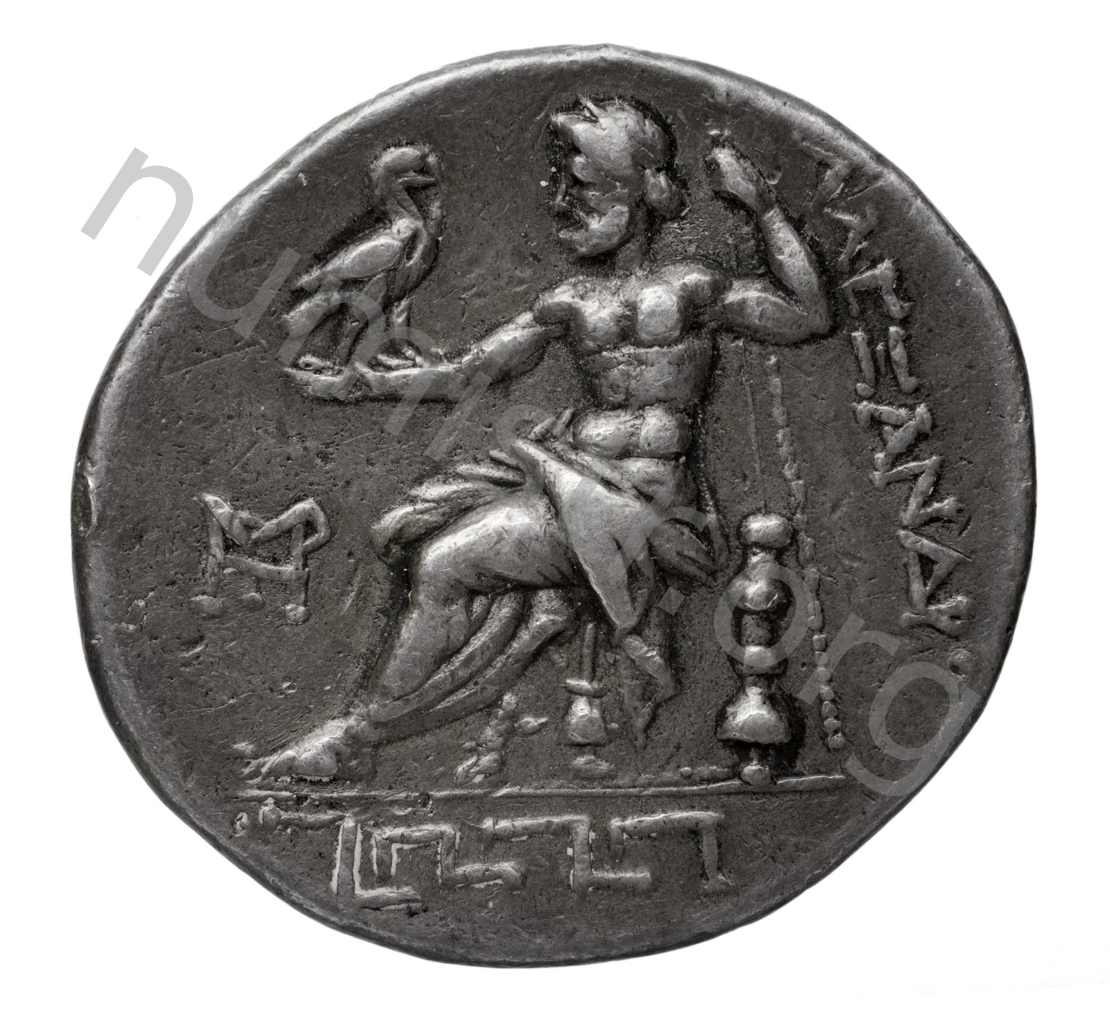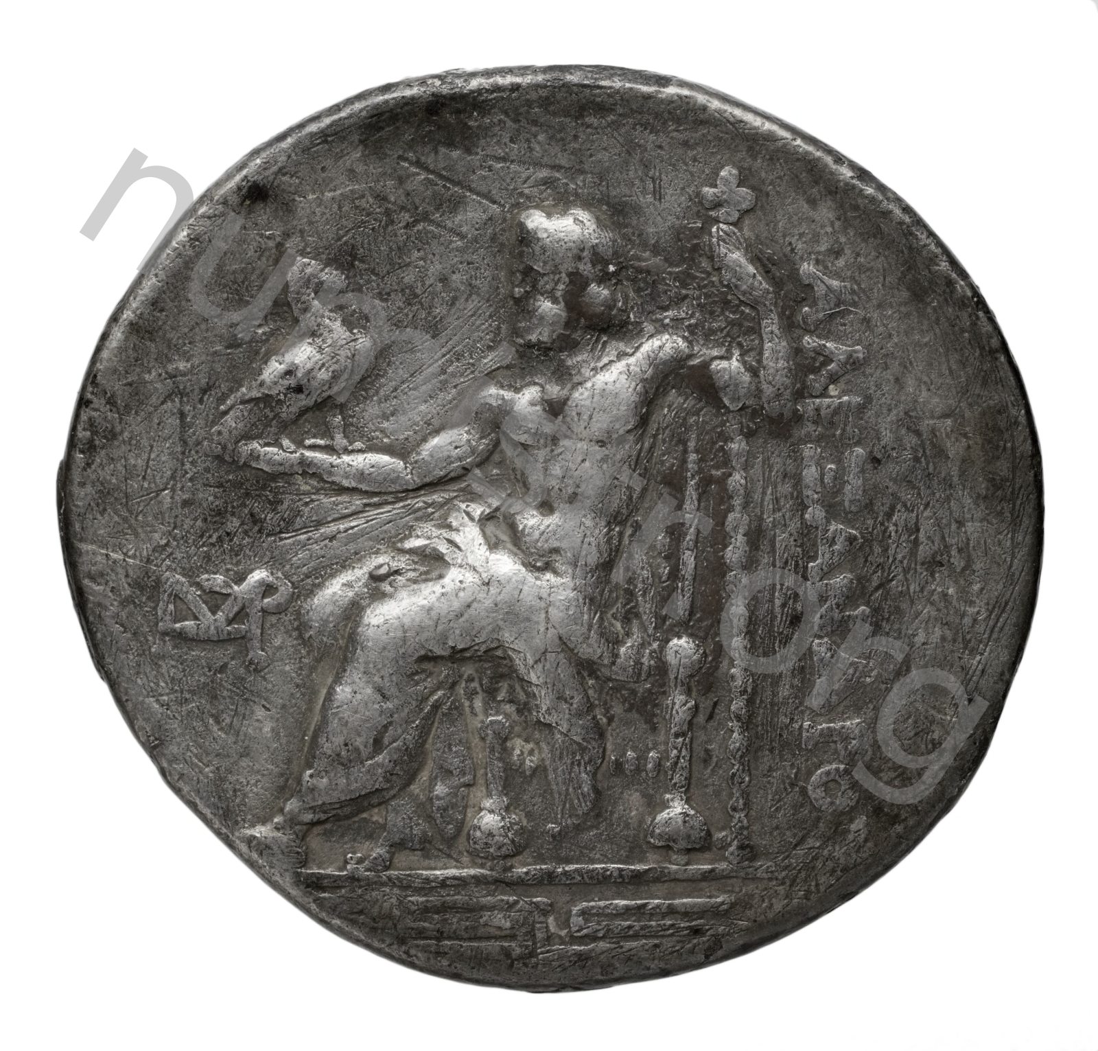 Zeus tabure-tahtta oturuyor sol elinde kartal sağ elinde asa var.