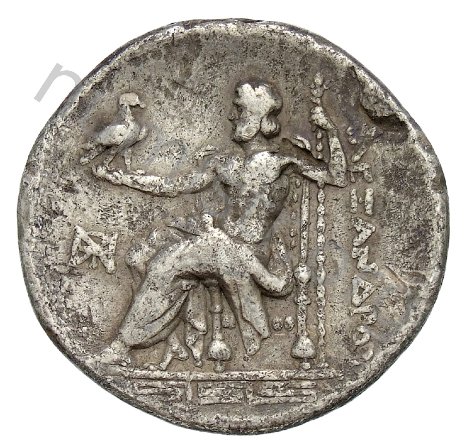 Zeus tabure-tahtta oturuyor sol elinde kartal sağ elinde asa var.