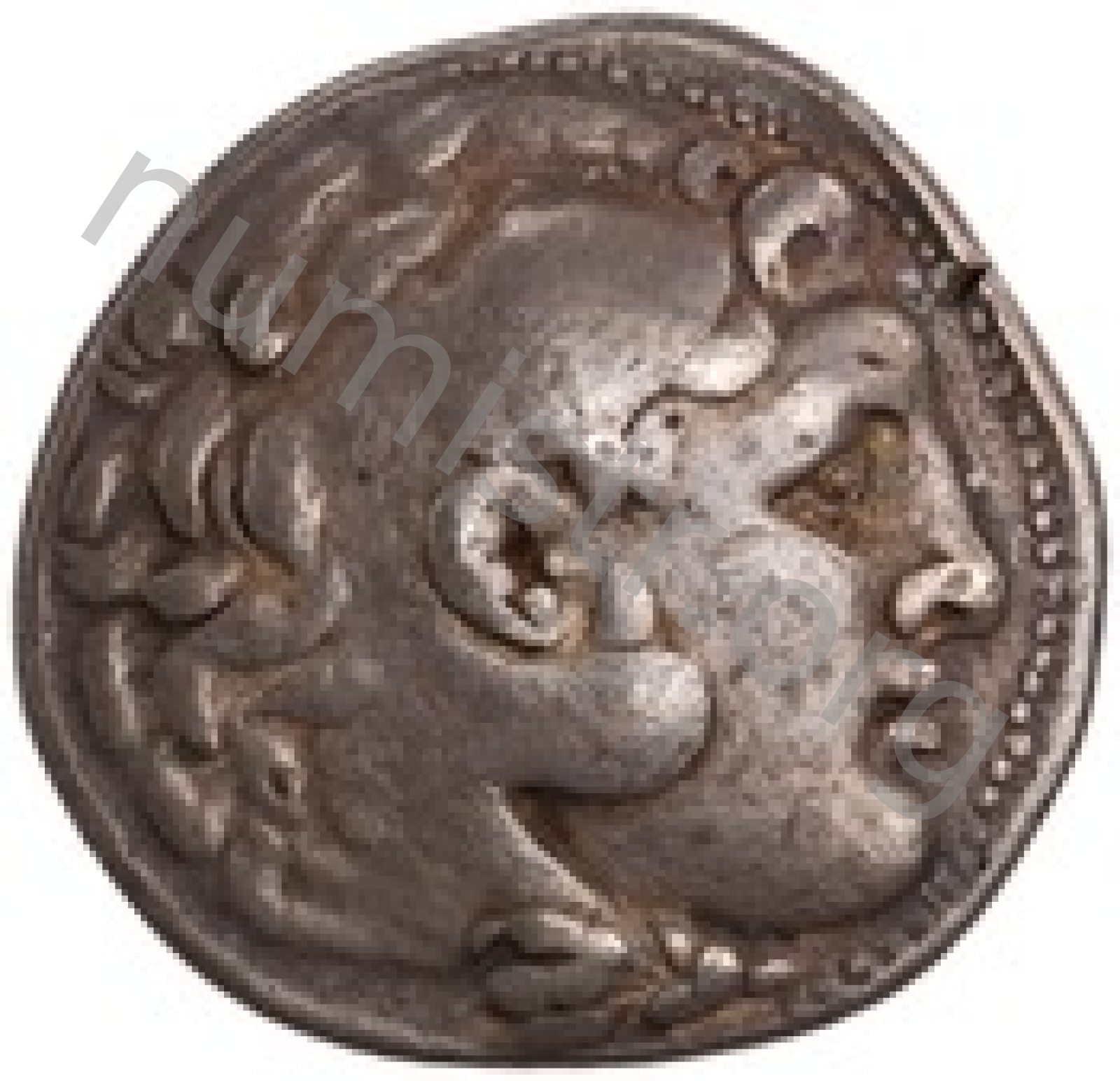 Head of beardless Heracles right wearing lion skin headdress -[en]