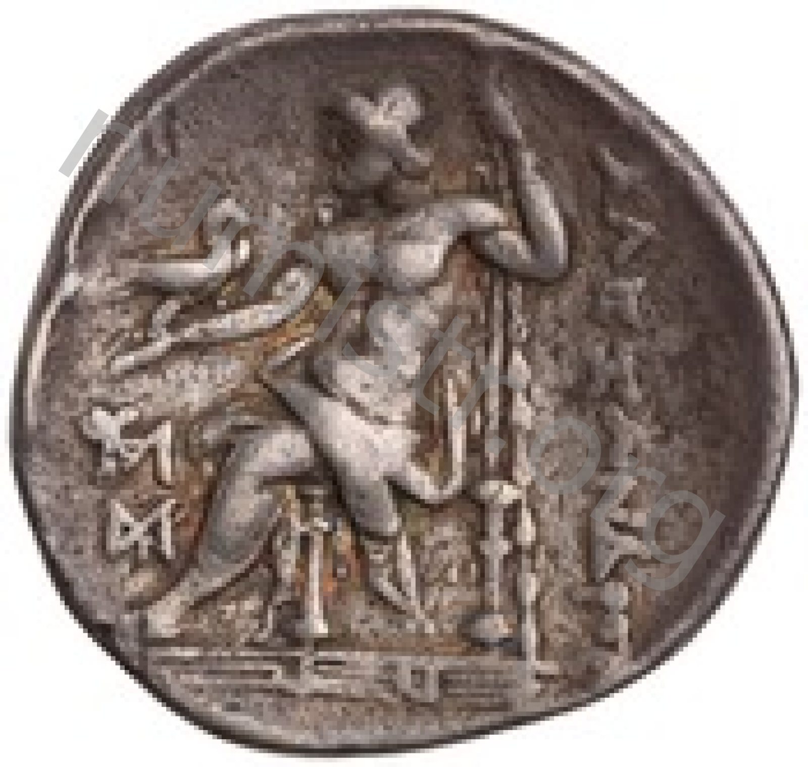 Zeus tabure-tahtta oturuyor sol elinde kartal sağ elinde asa var.