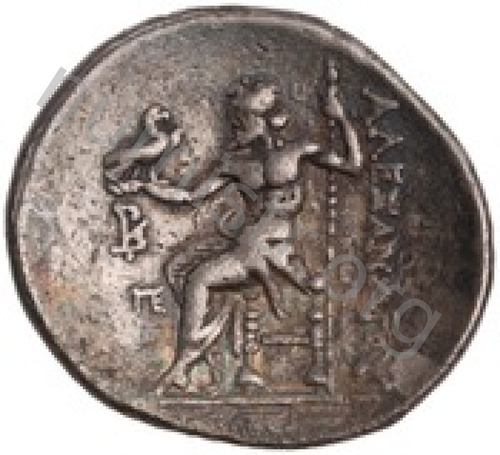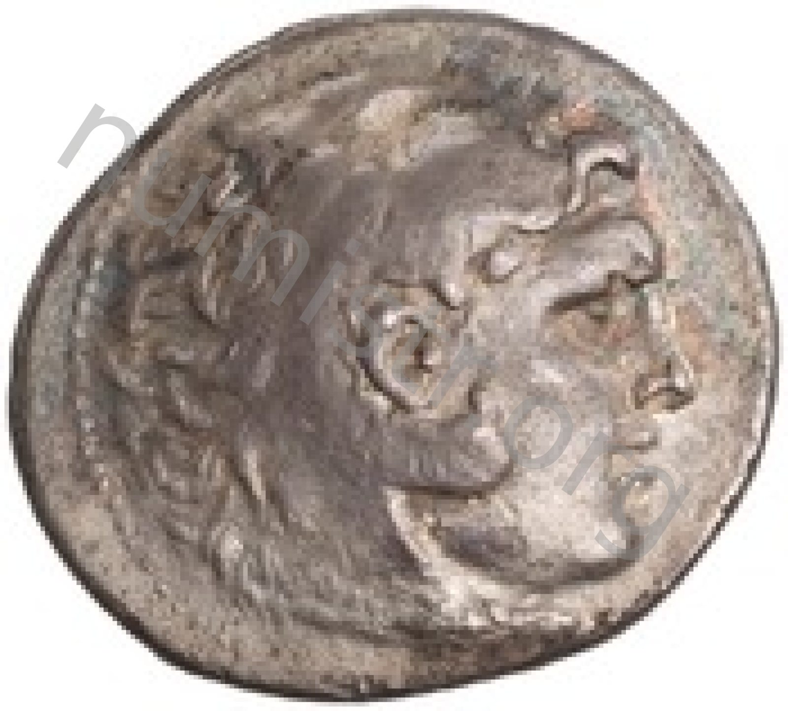 Head of beardless Heracles right wearing lion skin headdress -[en]