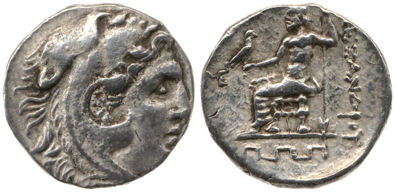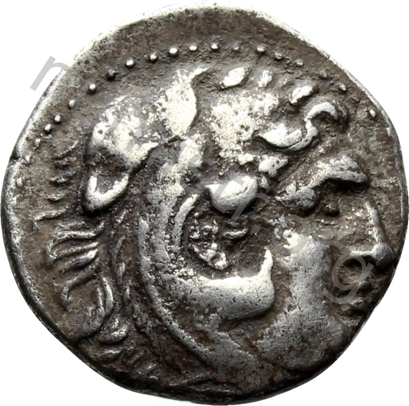 Head of beardless Heracles right wearing lion skin headdress -[en]