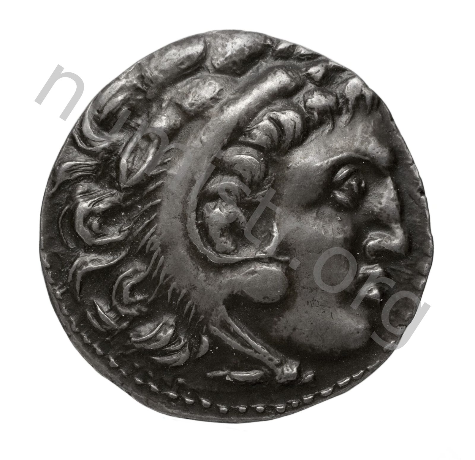 Head of beardless Heracles right wearing lion skin headdress -[en]