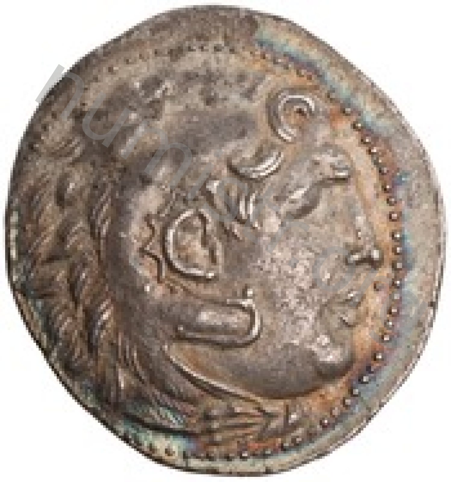 Head of beardless Heracles right wearing lion skin headdress -[en]