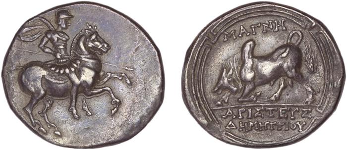 Horseman galloping wearing a helmet and wearing a chlamys (cloak) and a breastplate holding a spear -[en]