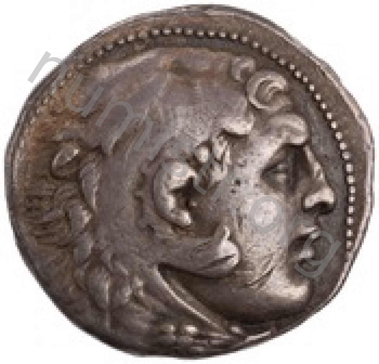 Head of beardless Heracles right wearing lion skin headdress -[en]