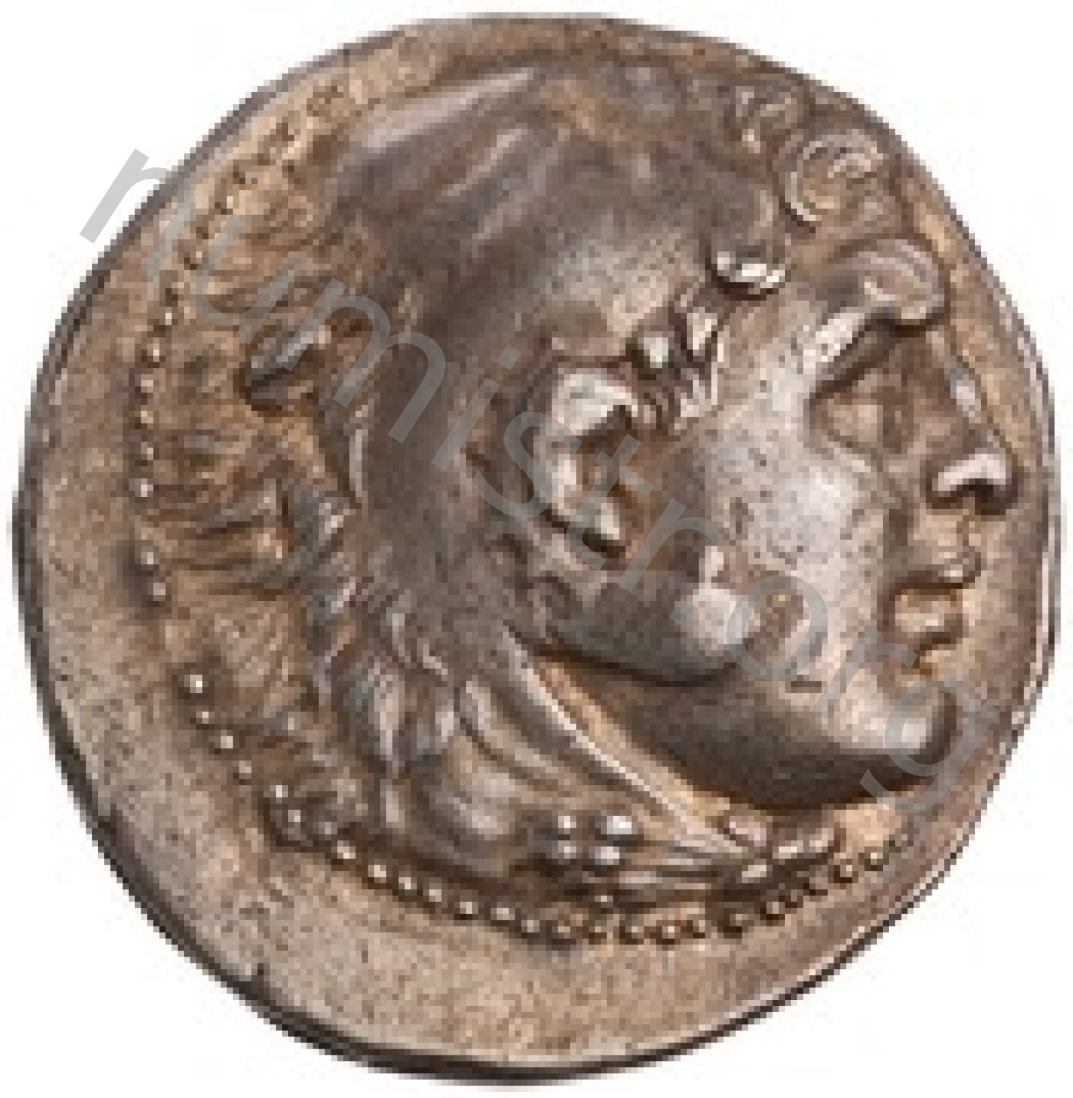 Head of beardless Heracles right wearing lion skin headdress -[en]