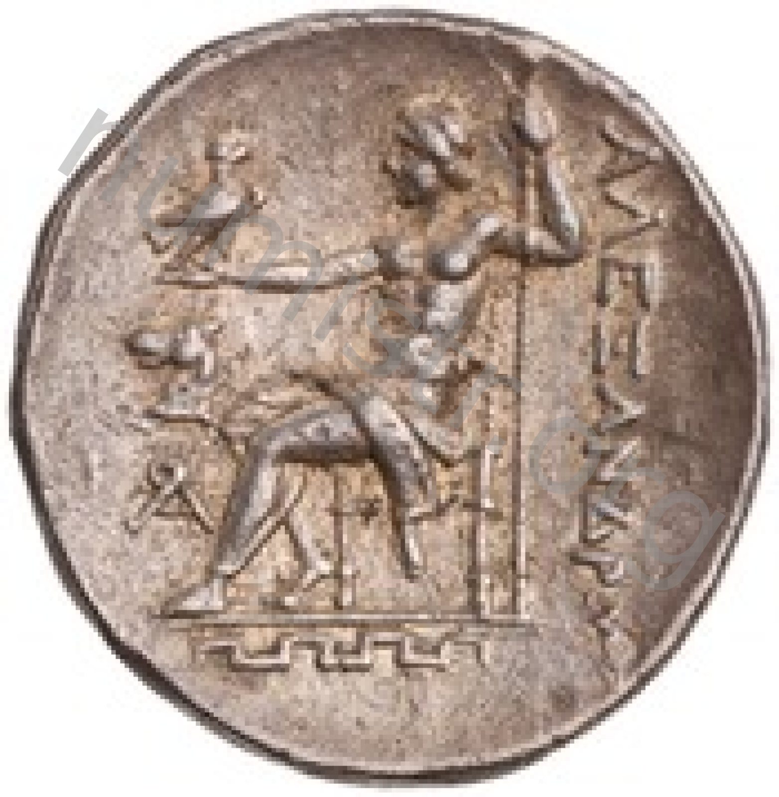 Zeus seated on stool-throne left eagle on outstretched right hand sceptre in left hand -[en]