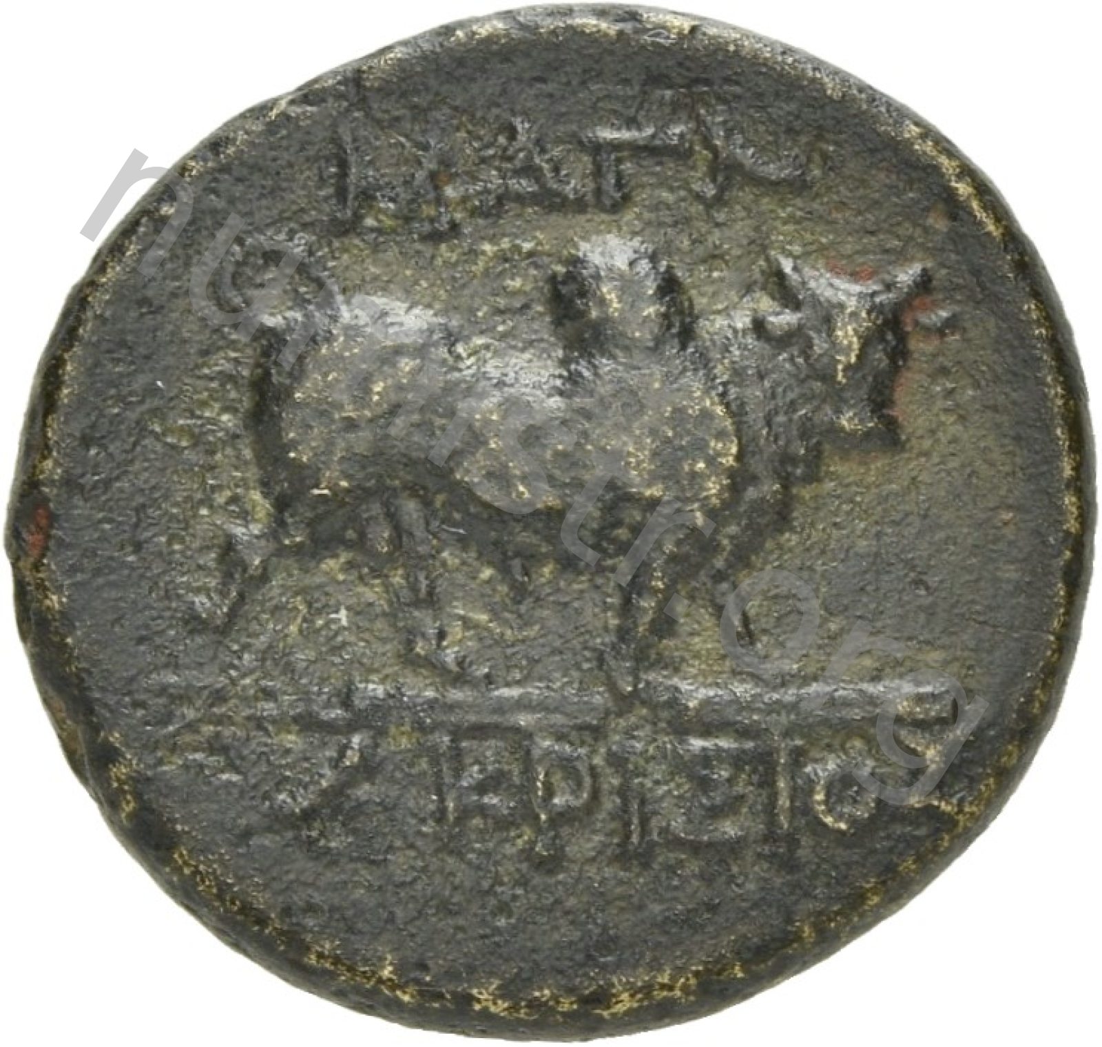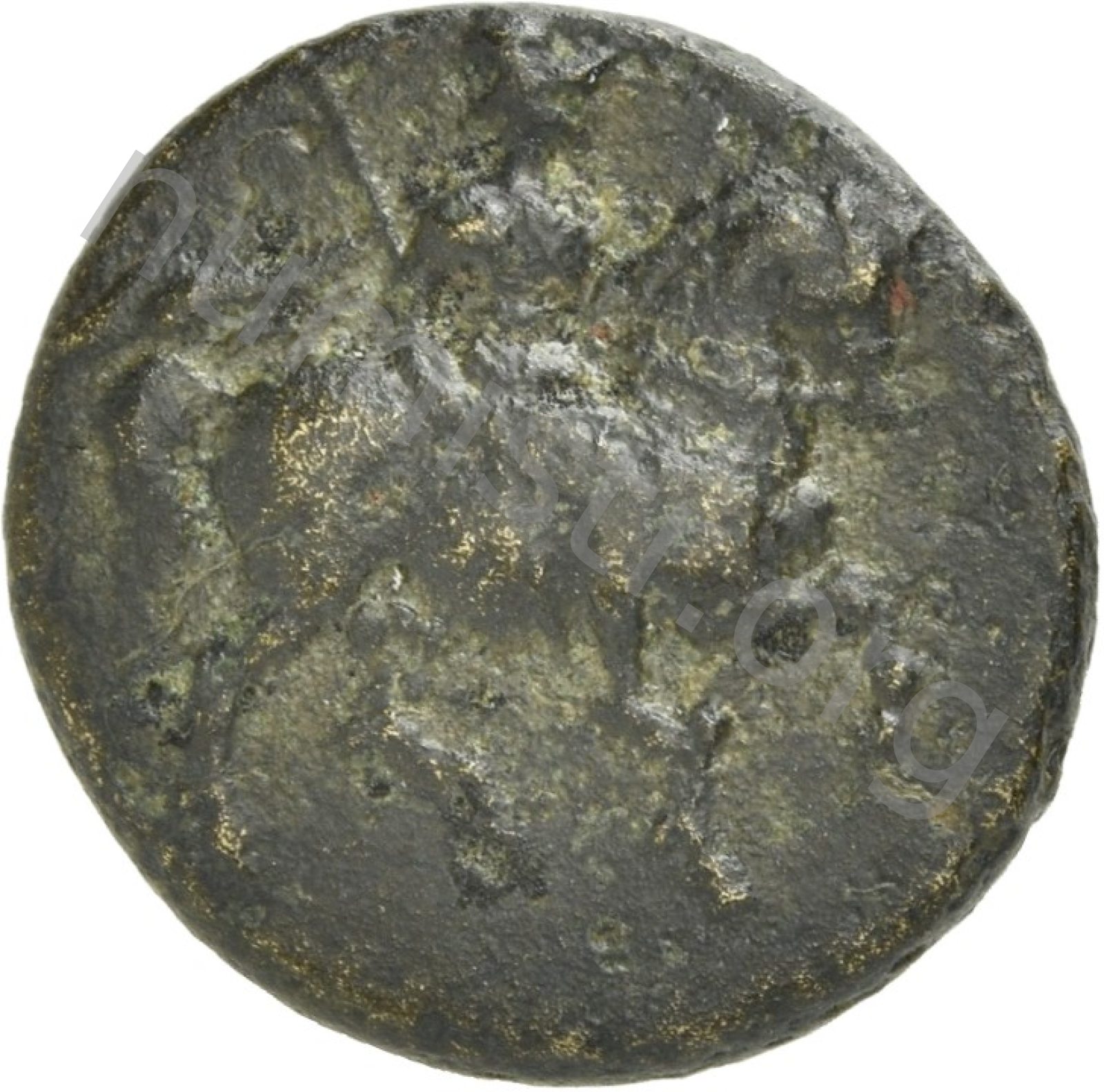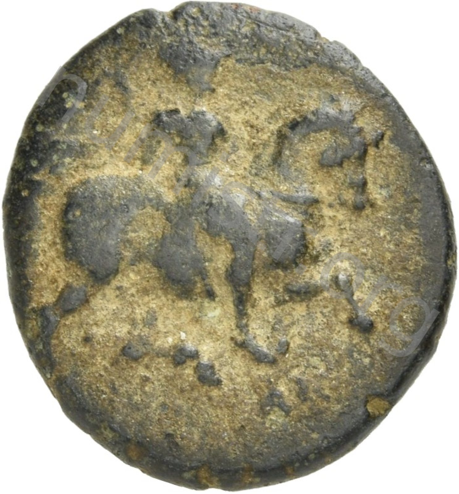 Horseman galloping wearing a helmet and wearing a chlamys (cloak) and a breastplate holding a spear -[en]