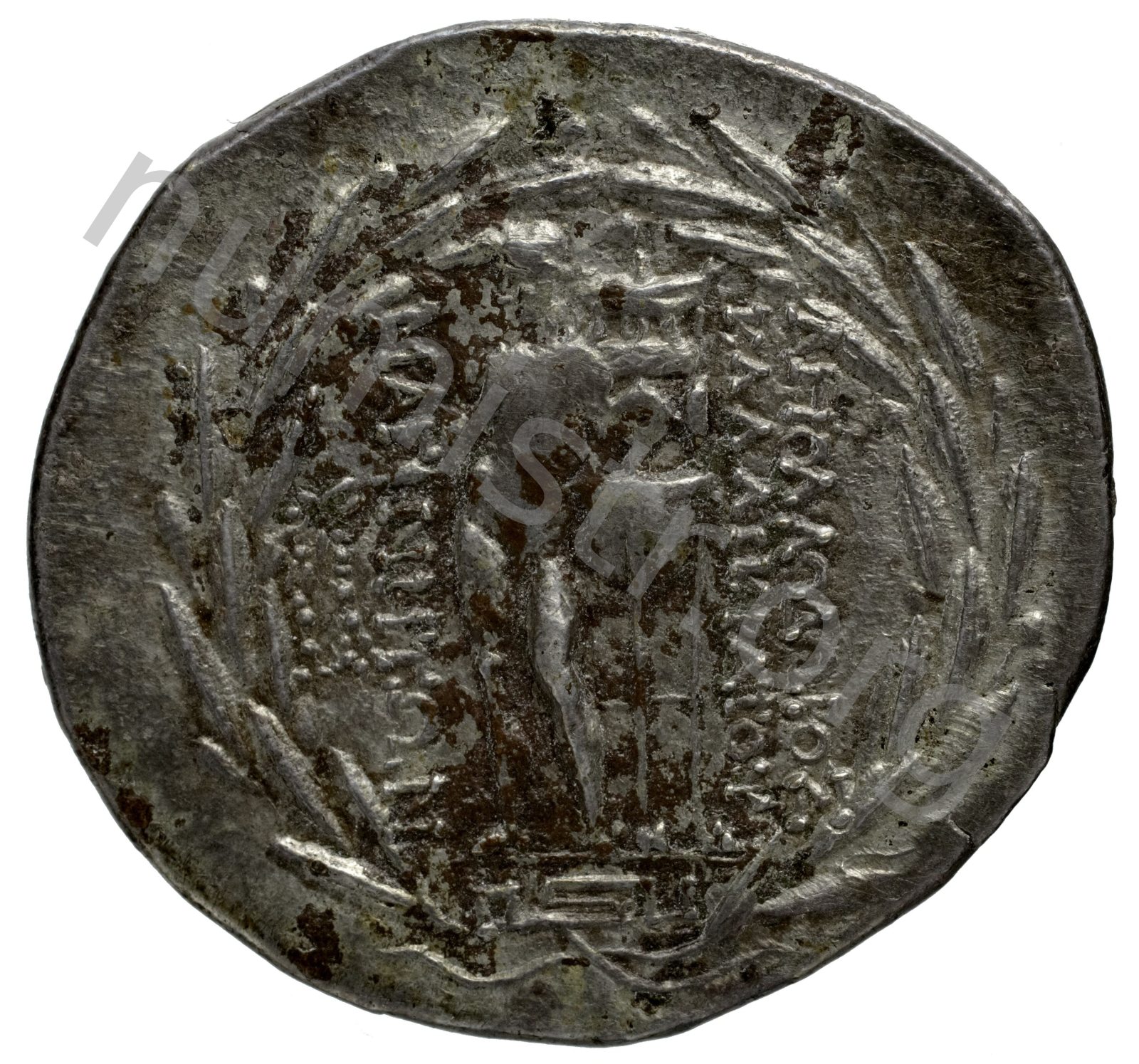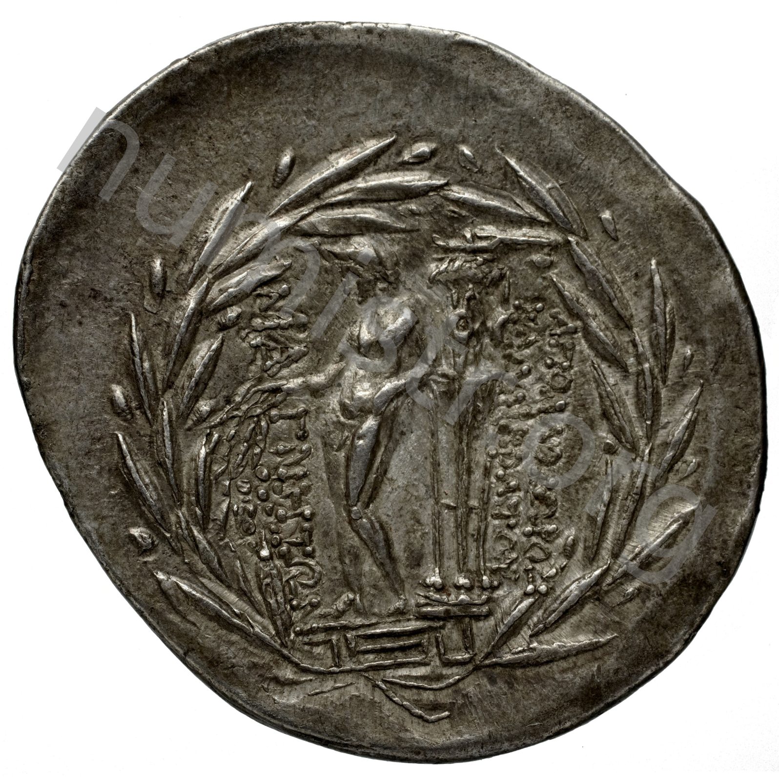Apollo on a meander pattern naked leaning on a tripod; all in a laurel wreath -[en]