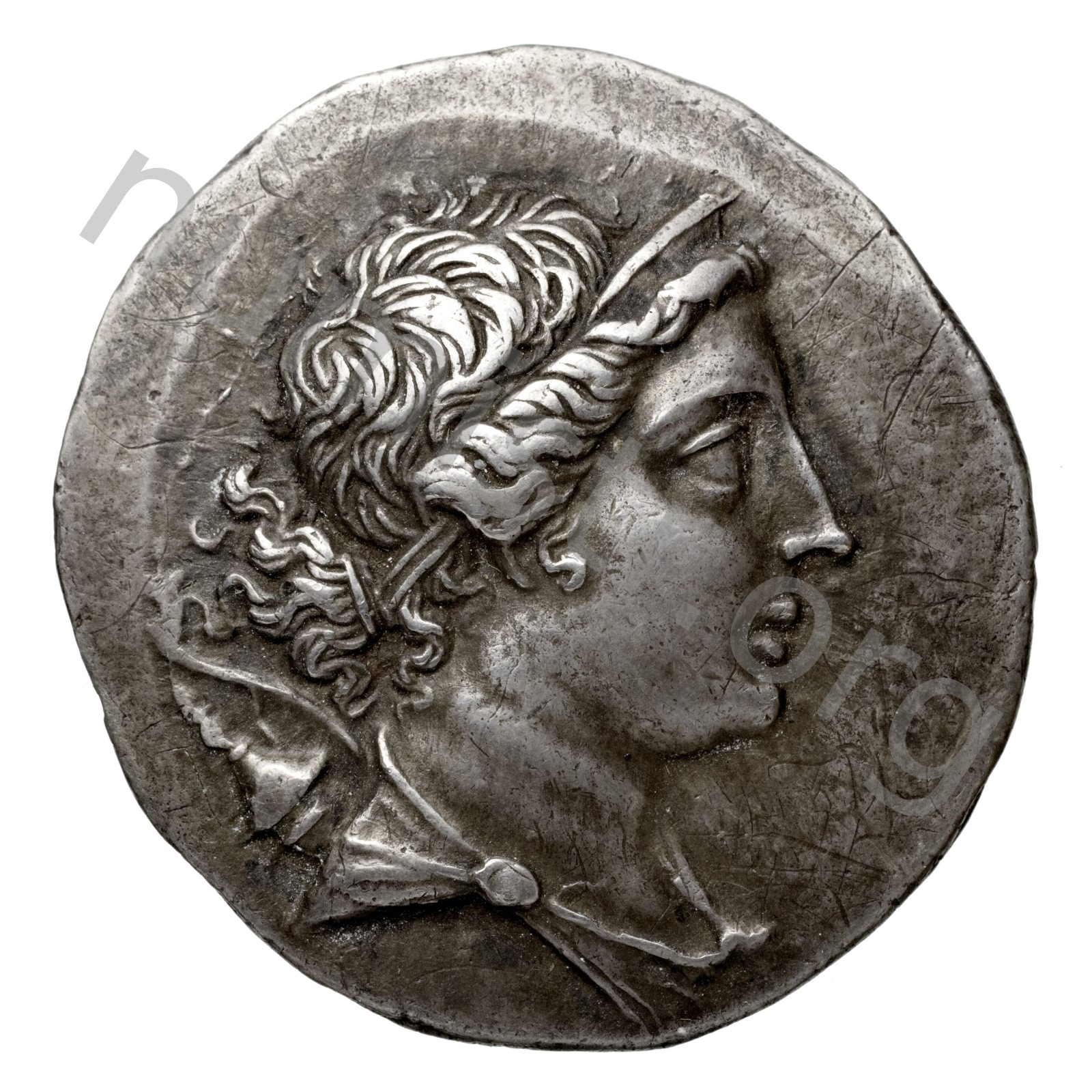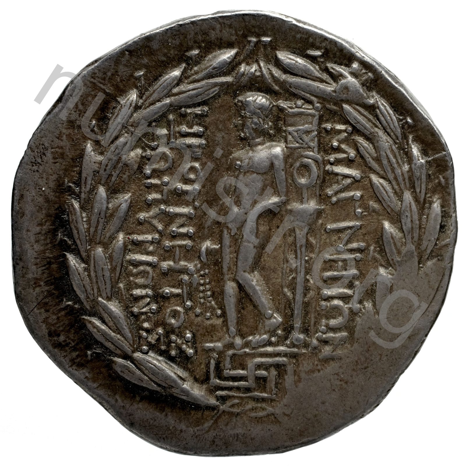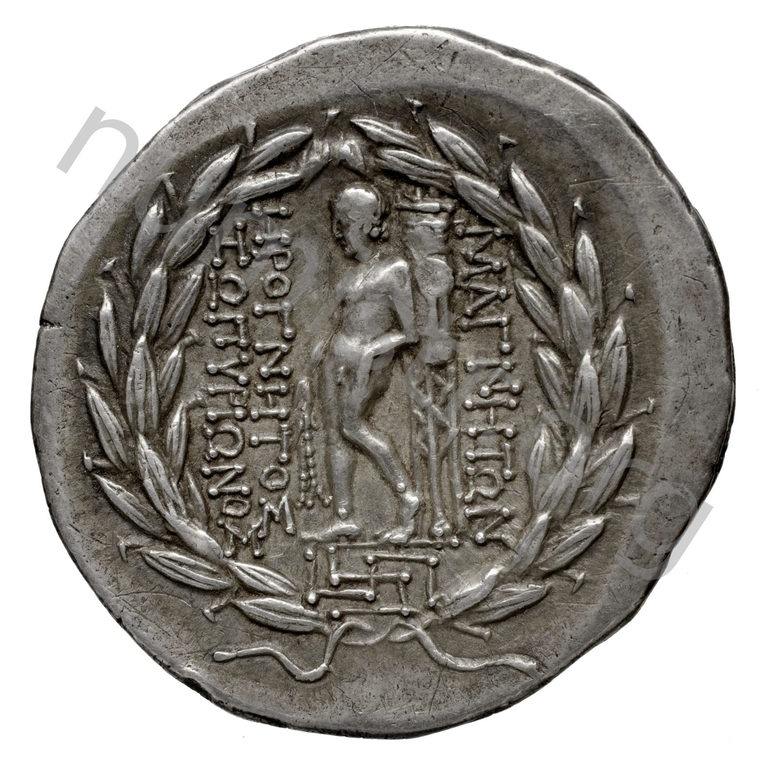Apollo on a meander pattern naked leaning on a tripod; all in a laurel wreath -[en]