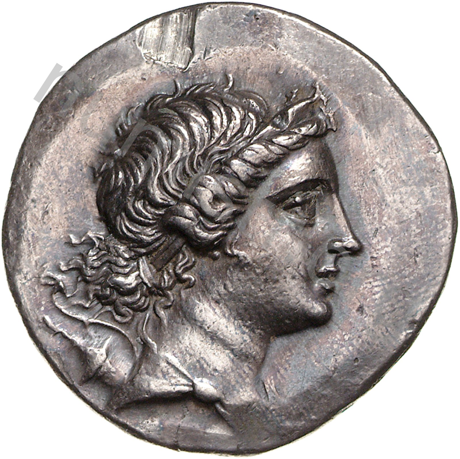 Apollon bir tripoda yaslanmış çıplak bir şekilde meander deseninde; hepsi bir defne çelengi içinde