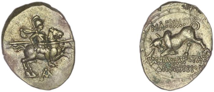 Horseman galloping wearing a helmet and wearing a chlamys (cloak) and a breastplate holding a spear -[en]