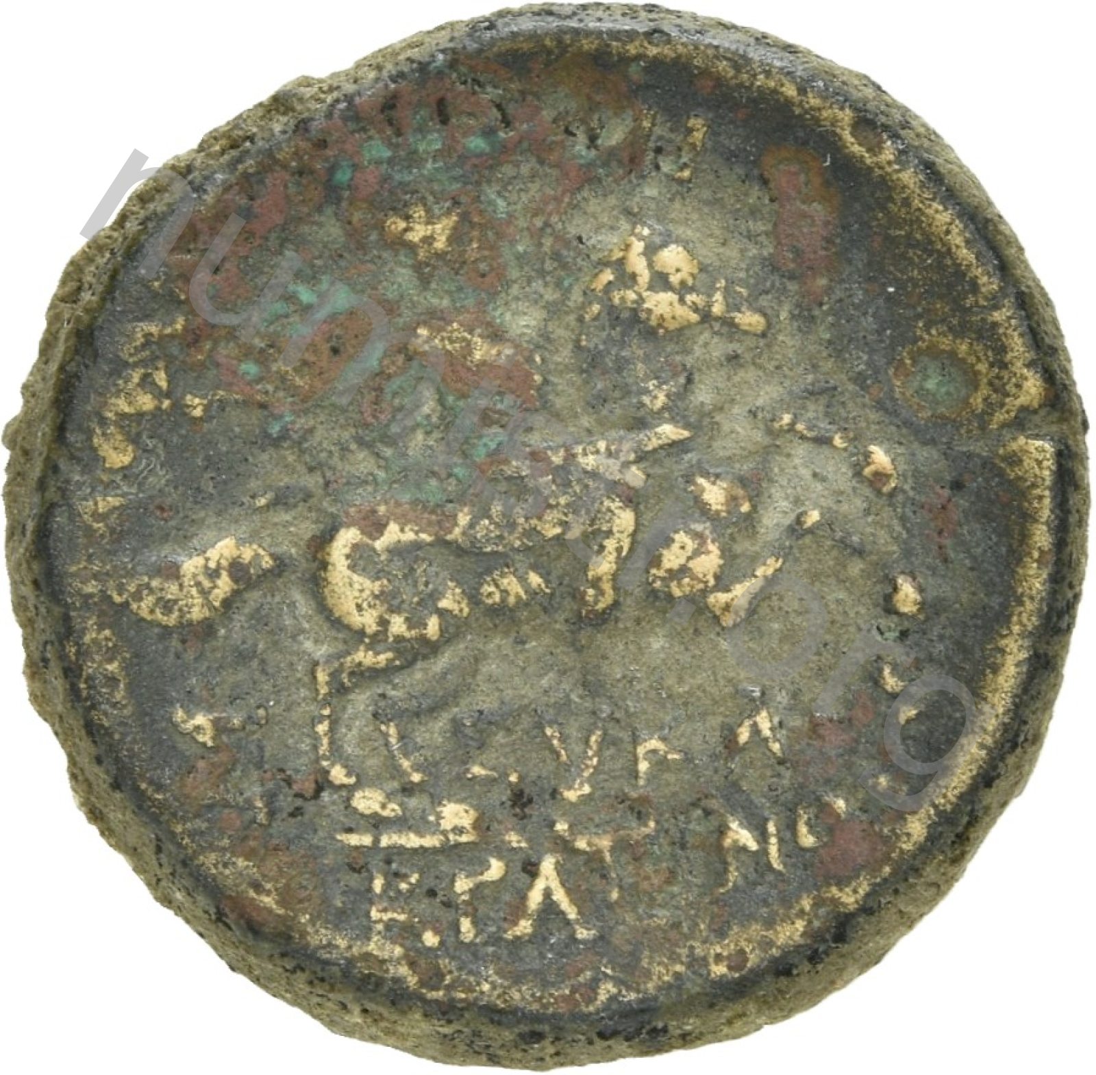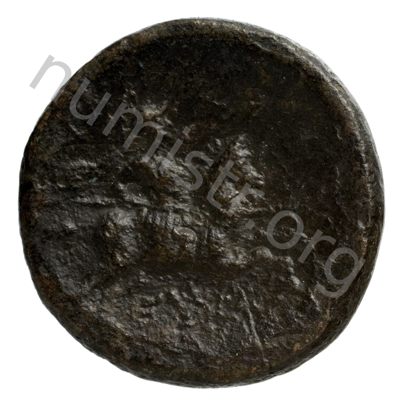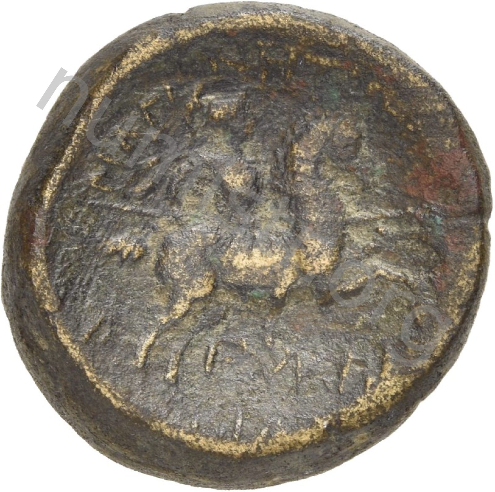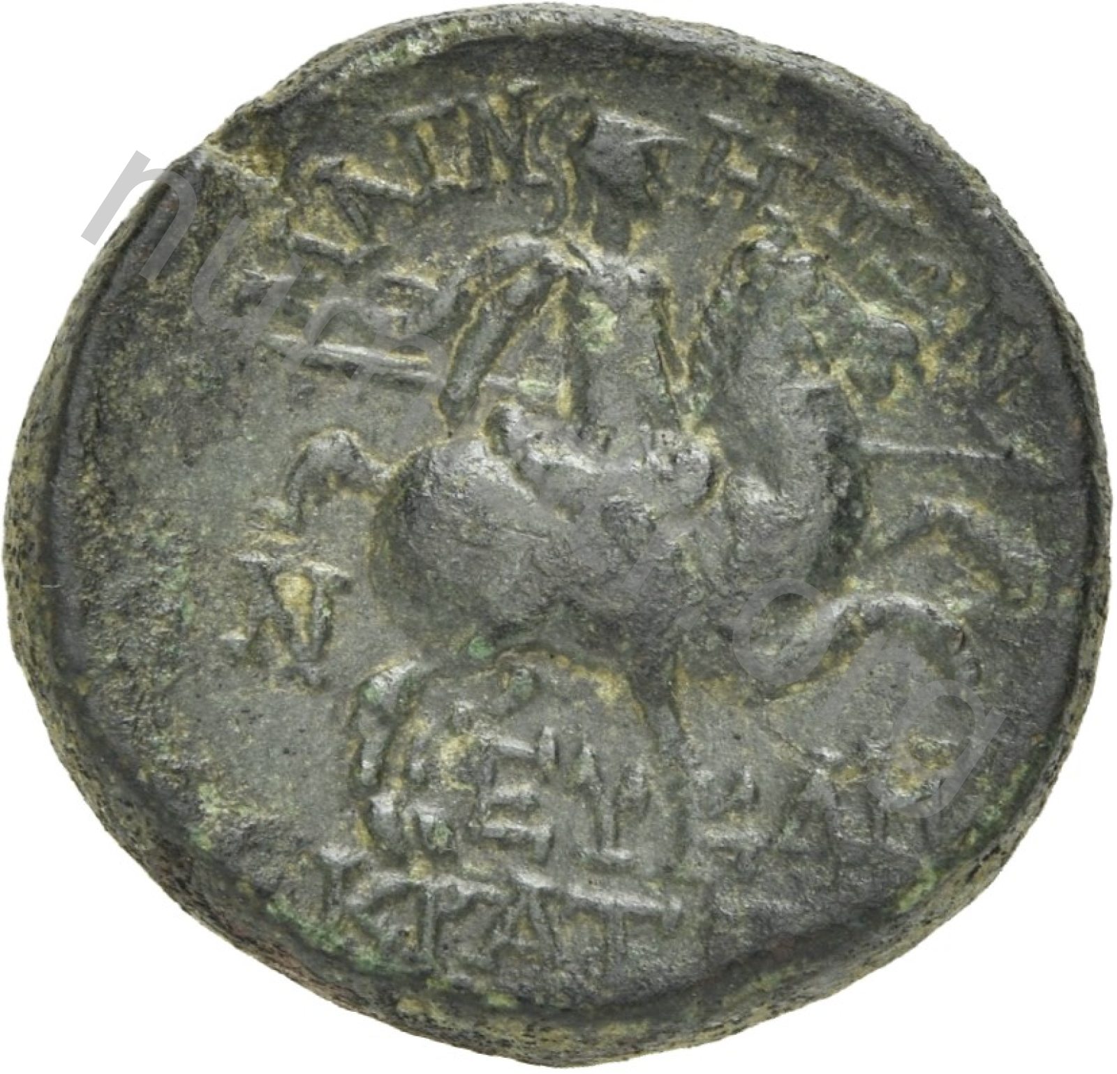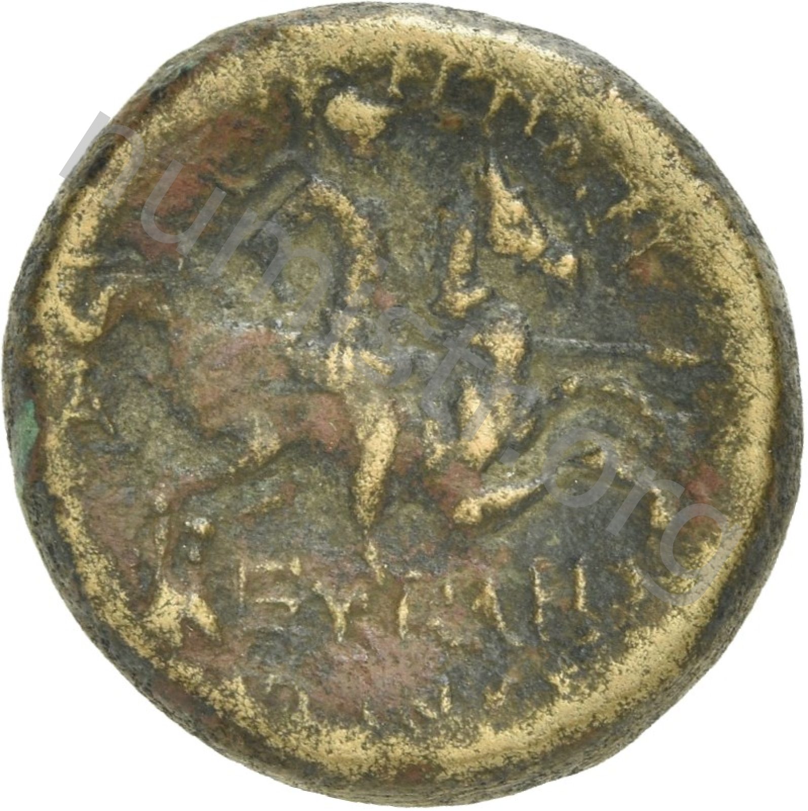 Horseman galloping wearing a helmet chlamys and breastplate holding a spear -[en]