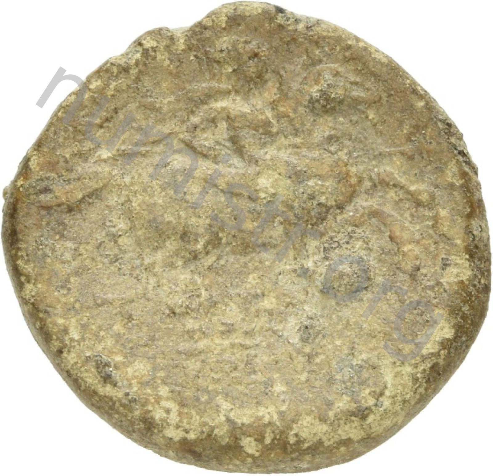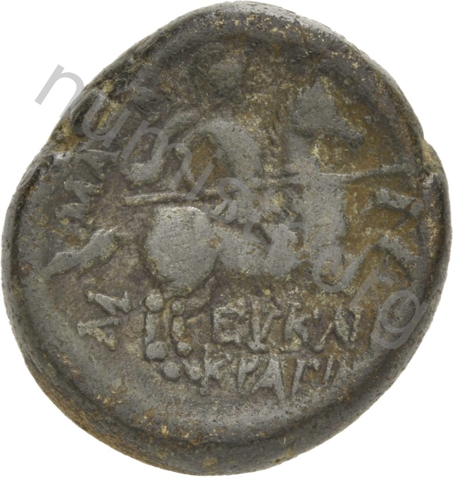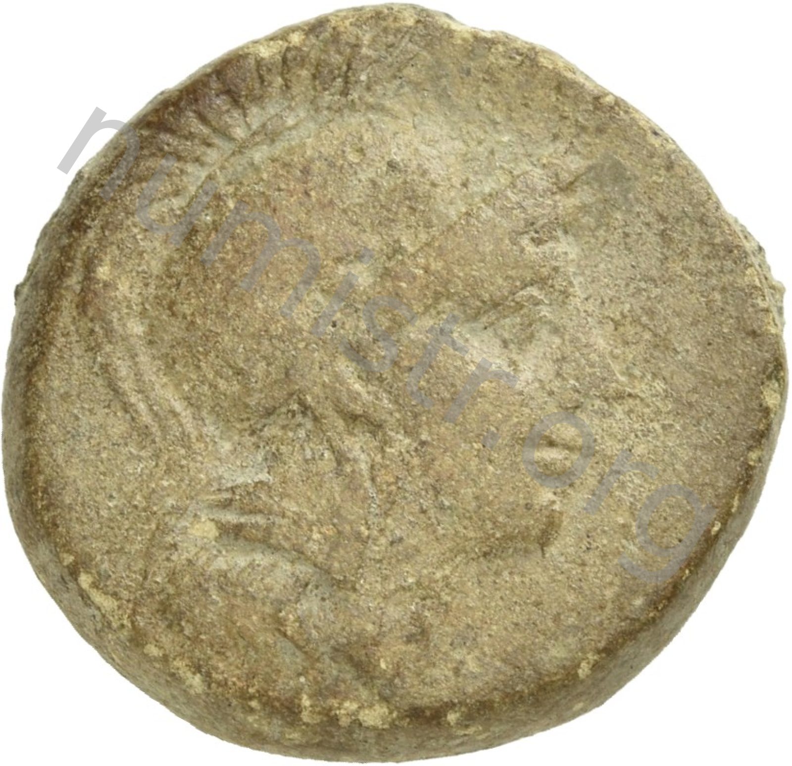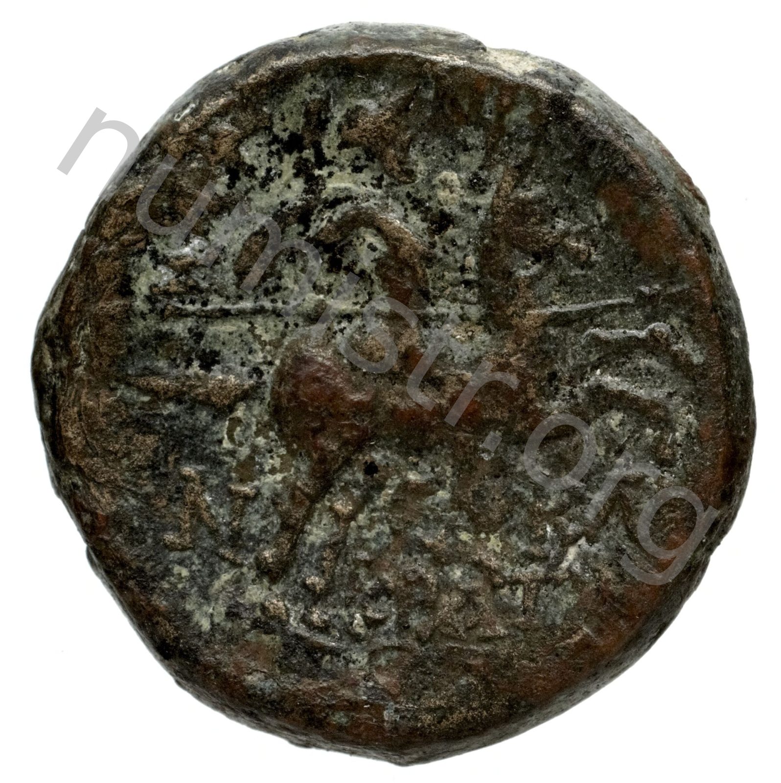 Horseman galloping wearing a helmet chlamys and breastplate holding a spear -[en]