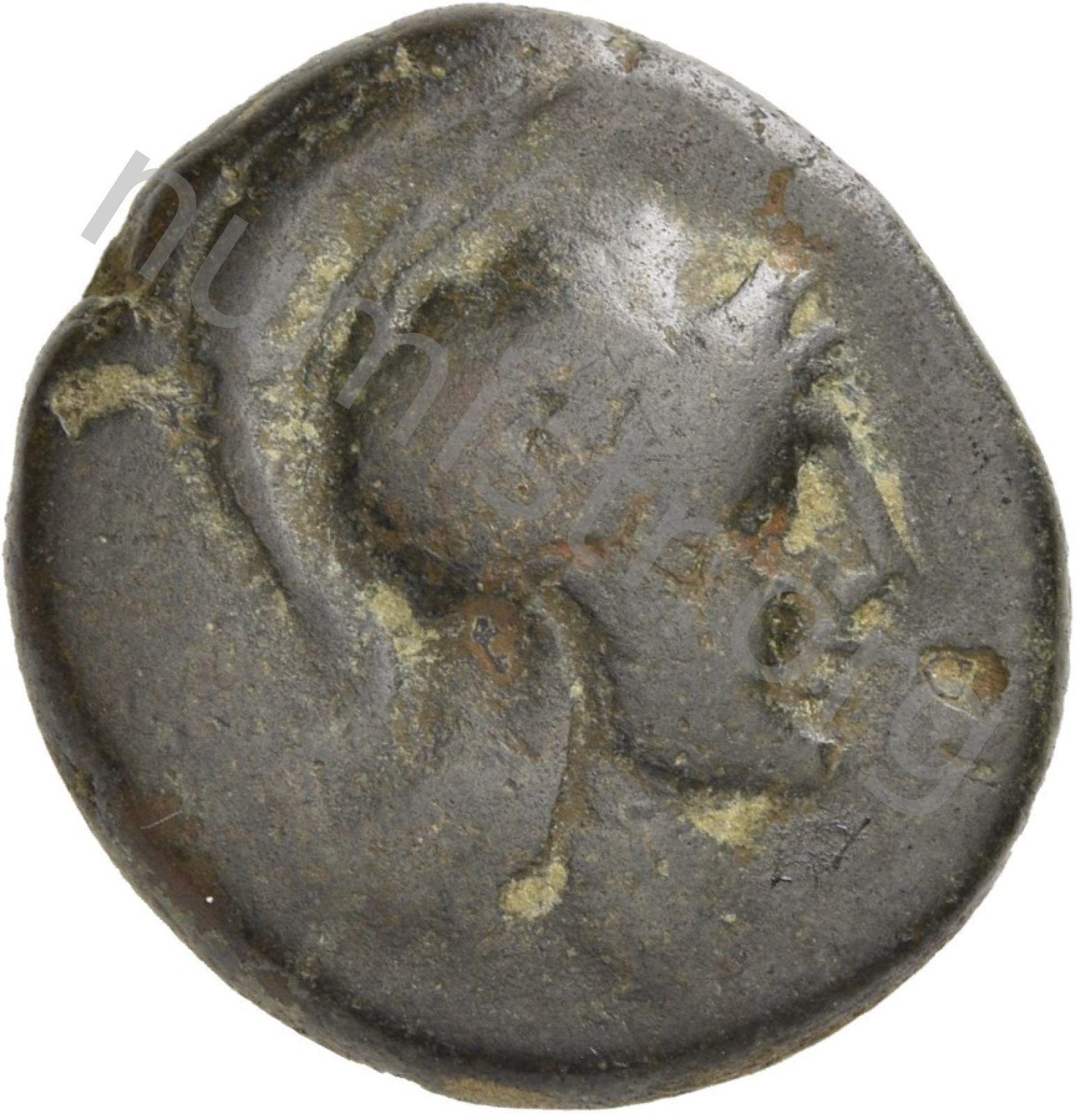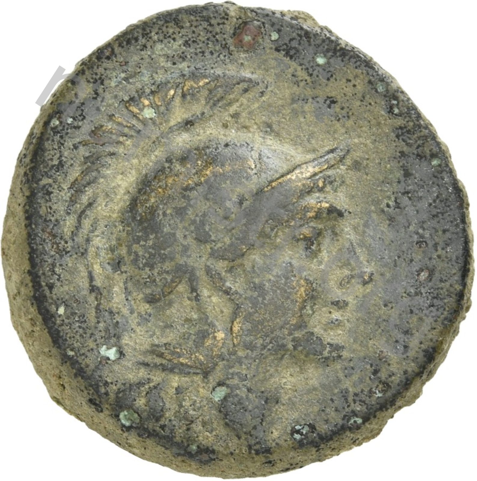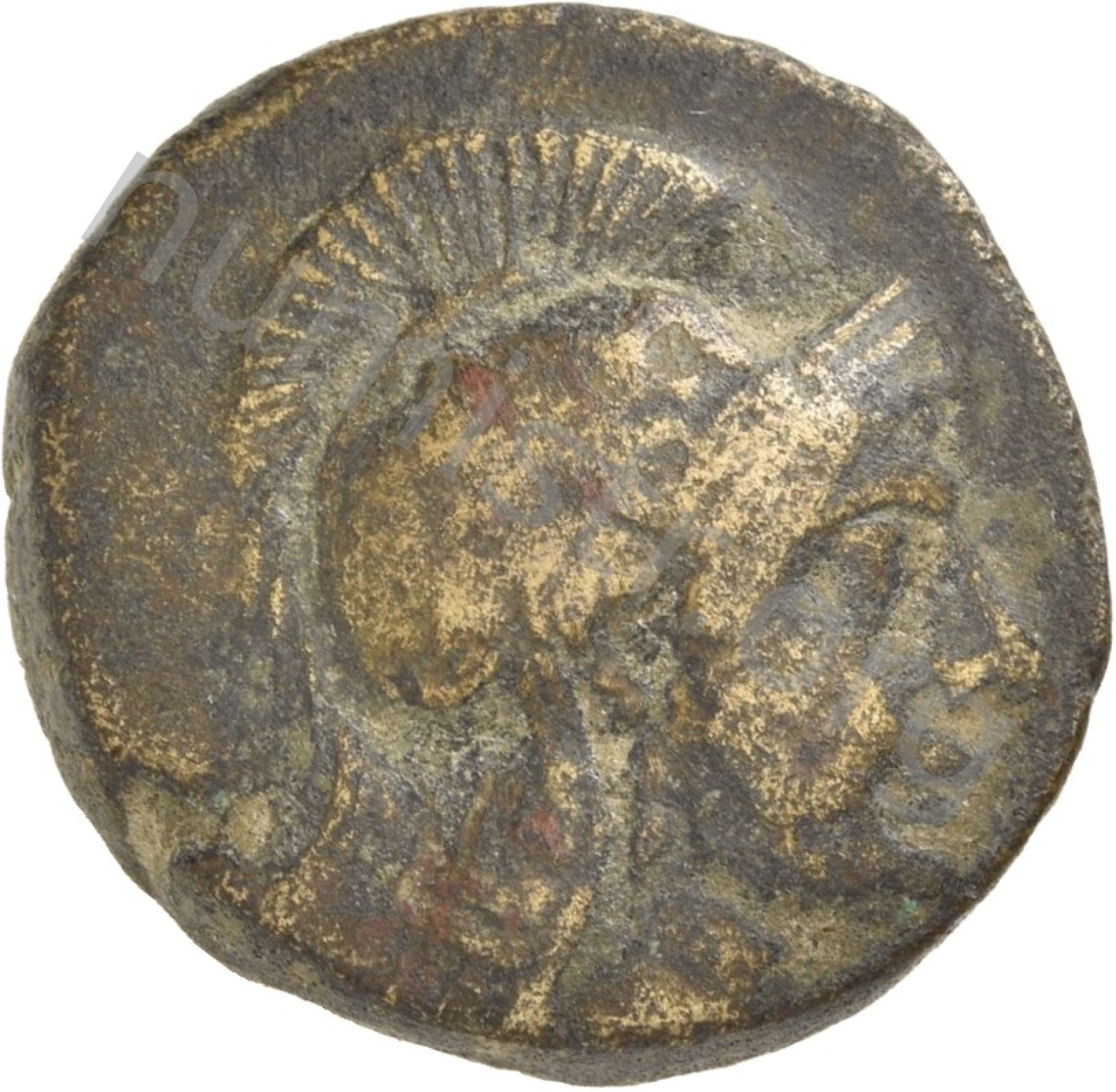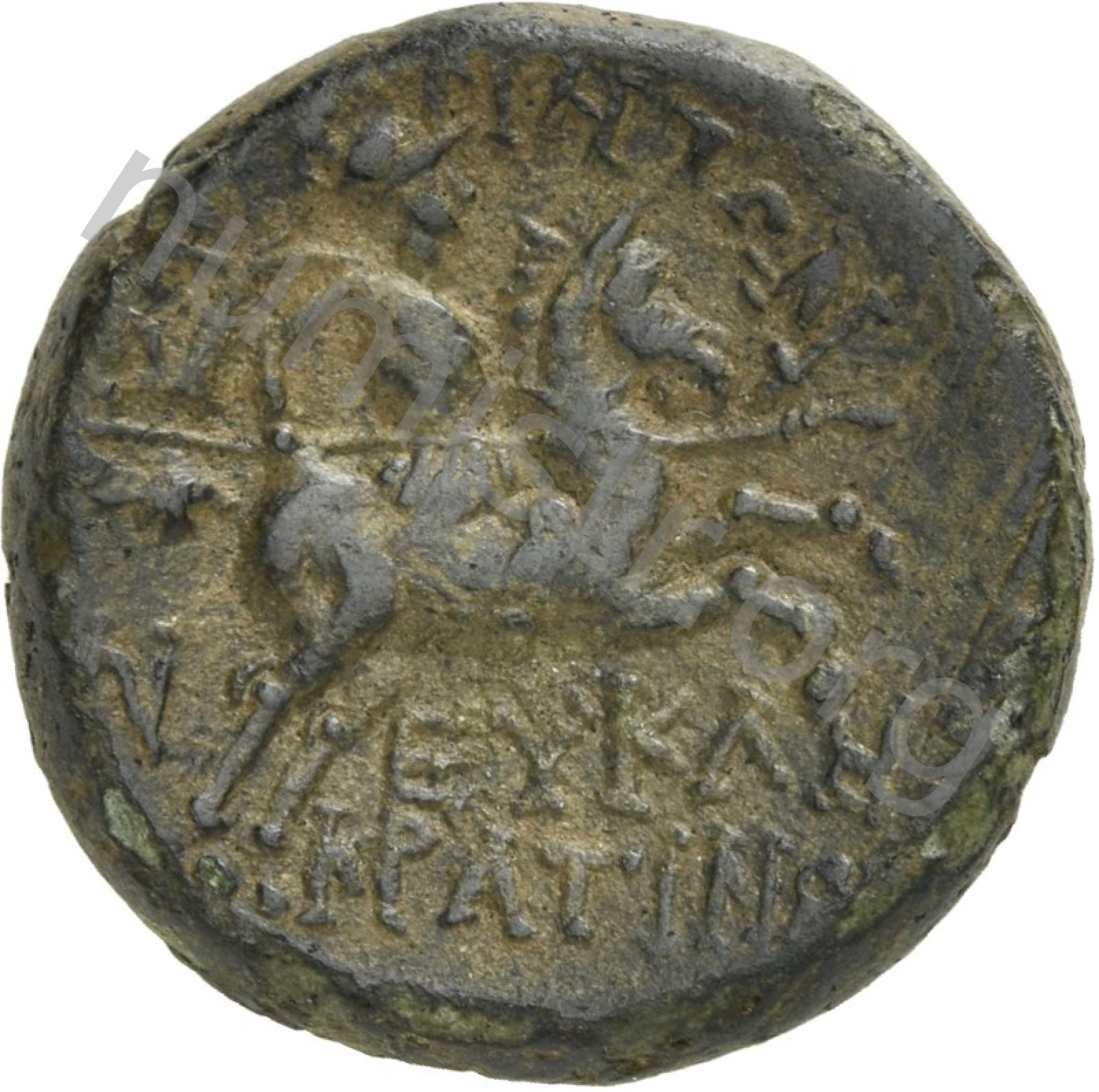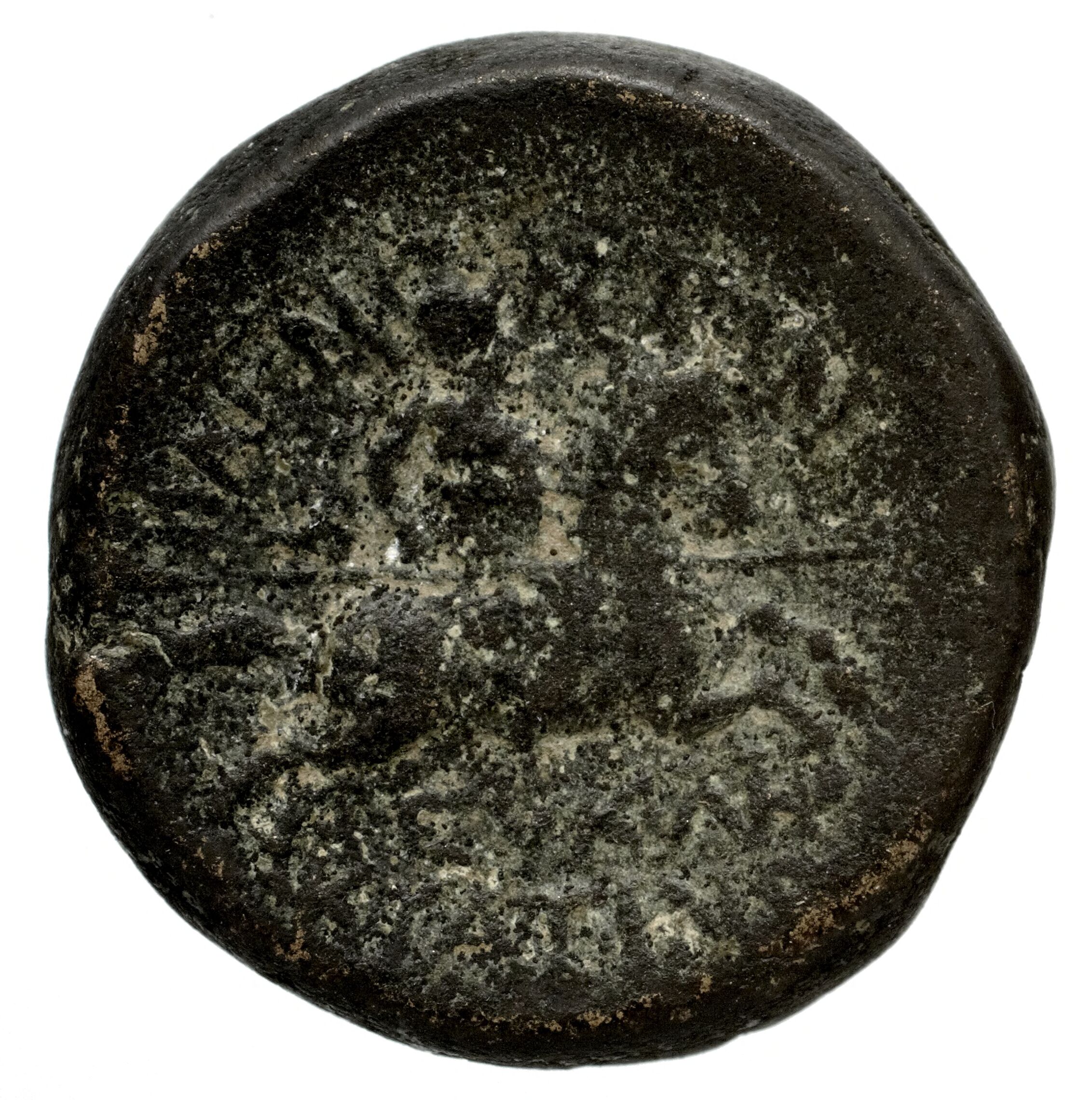 Horseman galloping wearing a helmet chlamys and breastplate holding a spear -[en]