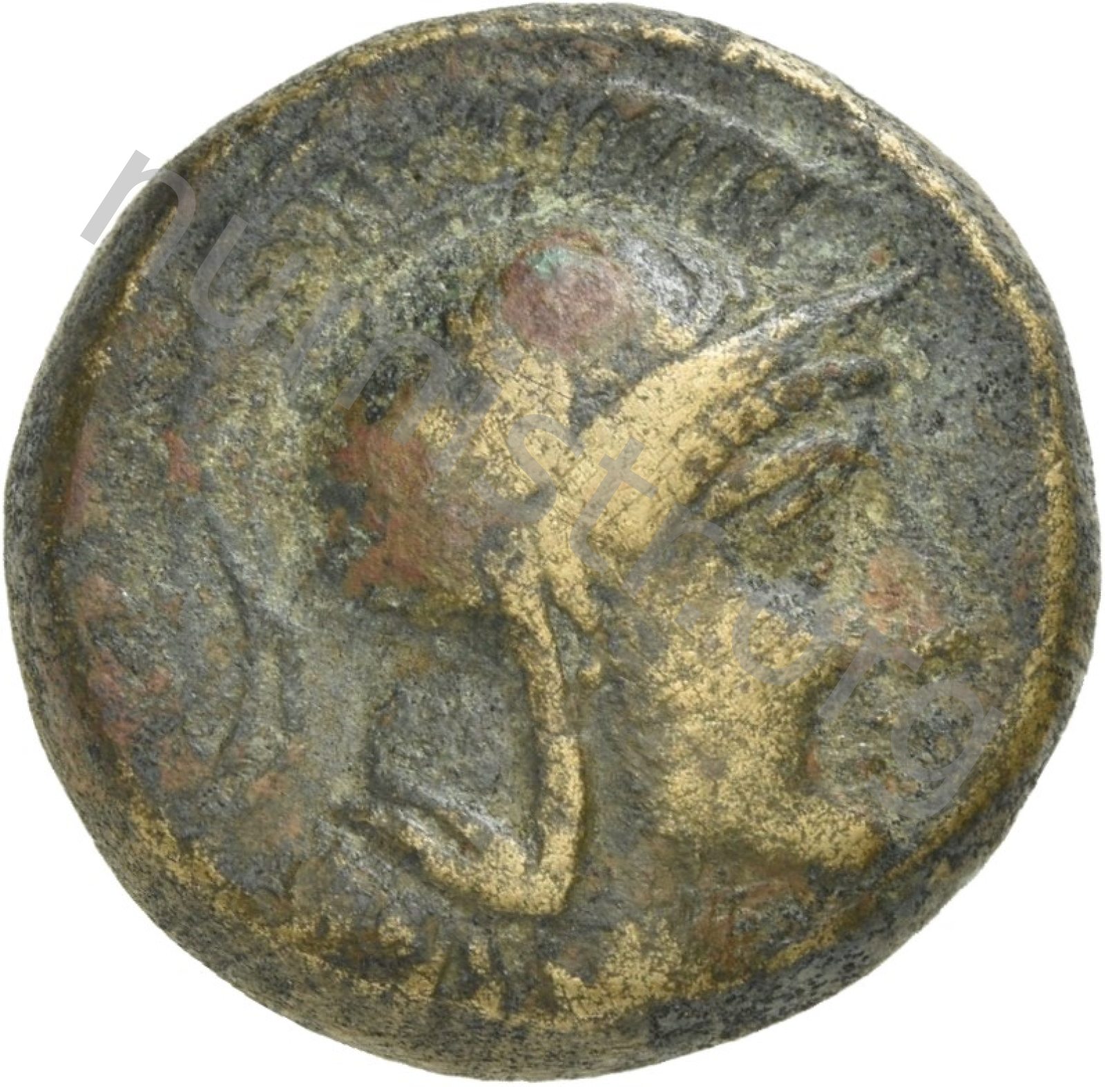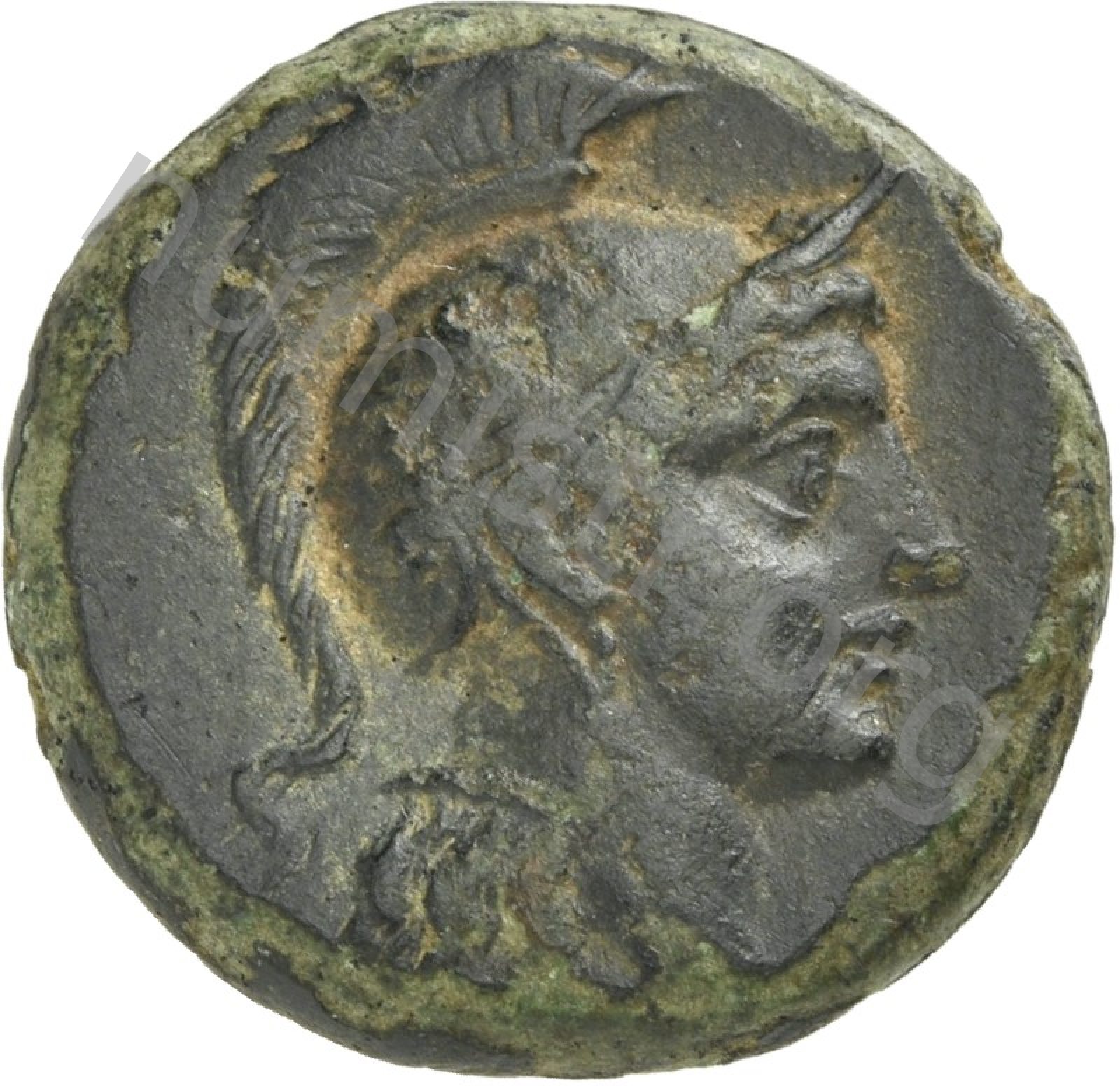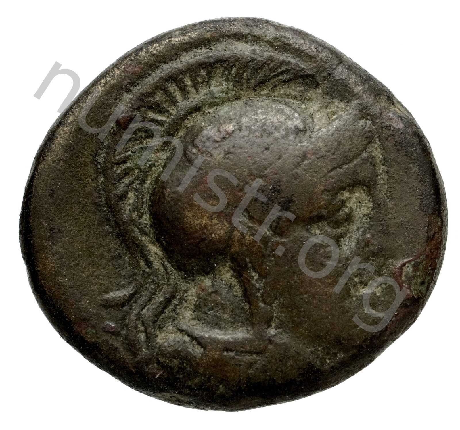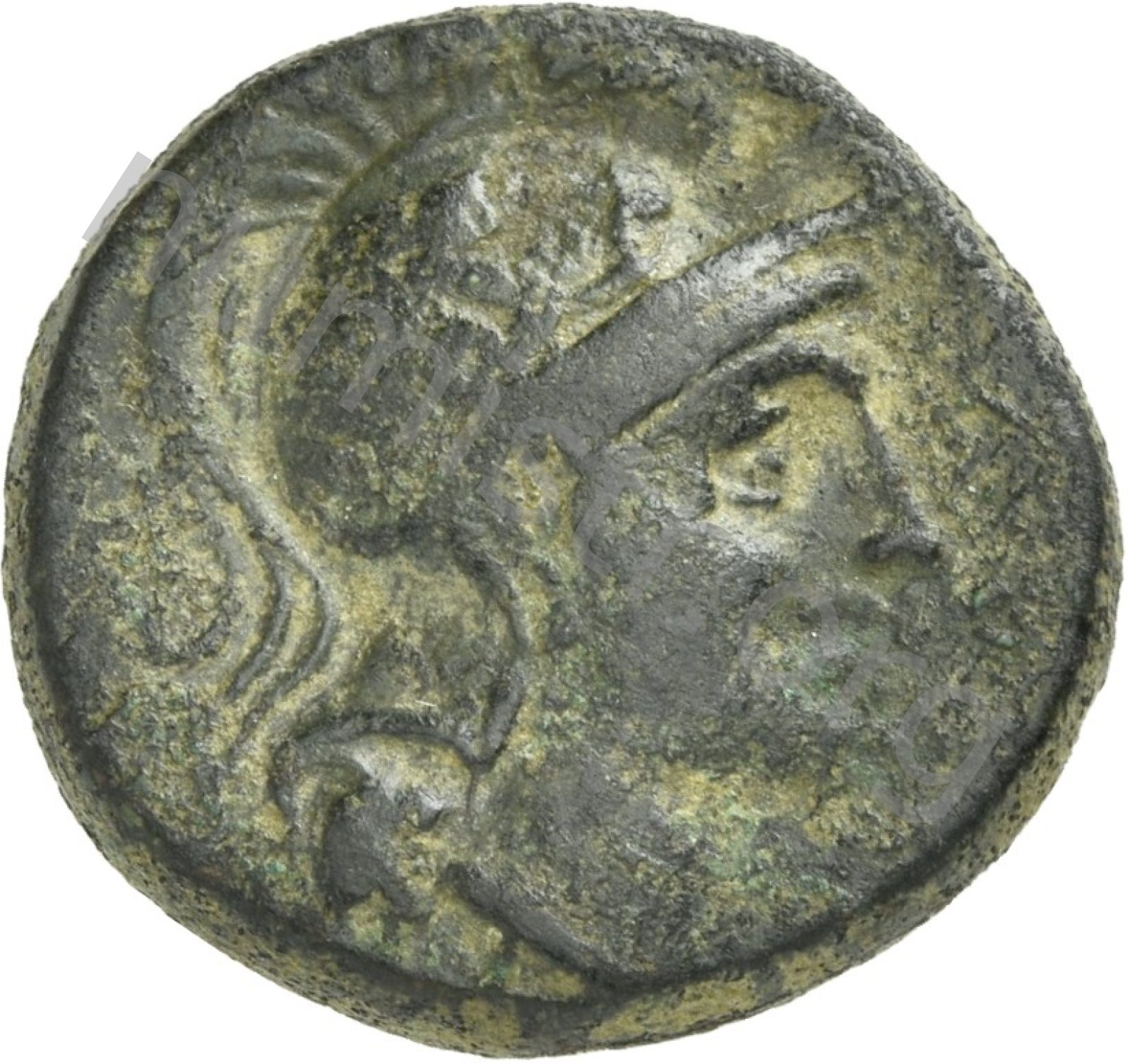 Horseman galloping wearing a helmet chlamys and breastplate holding a spear -[en]
