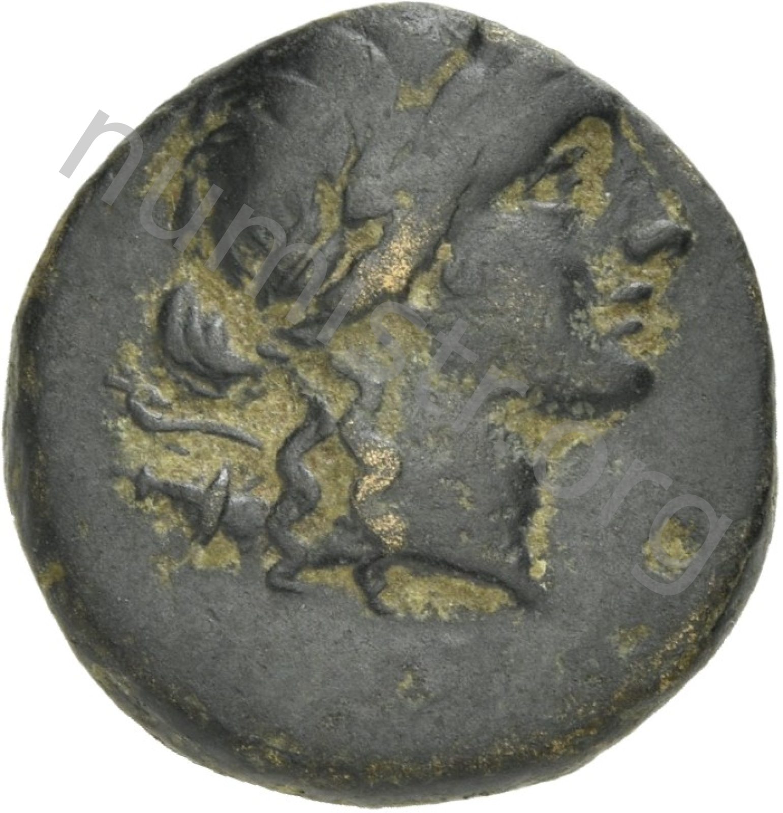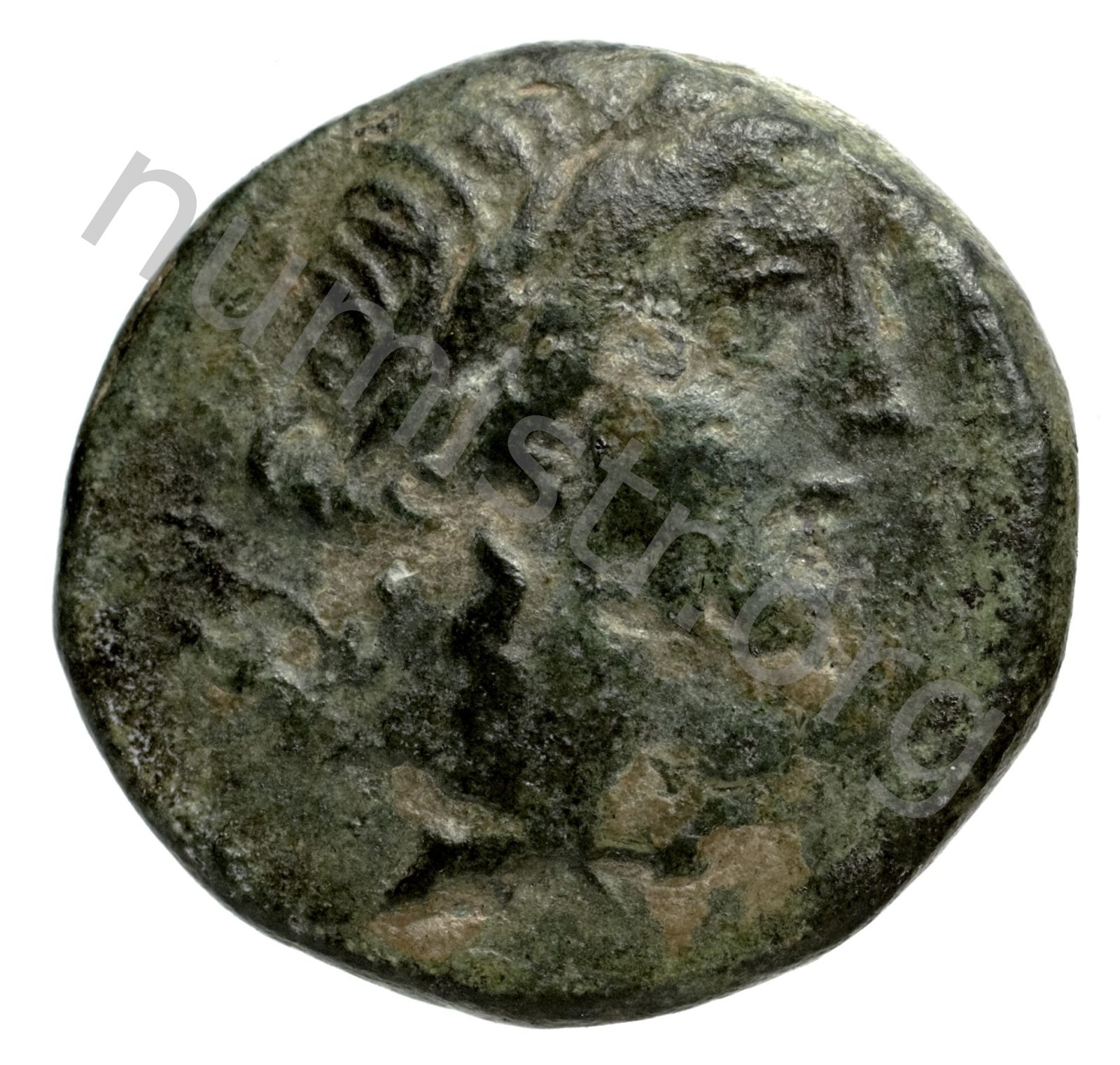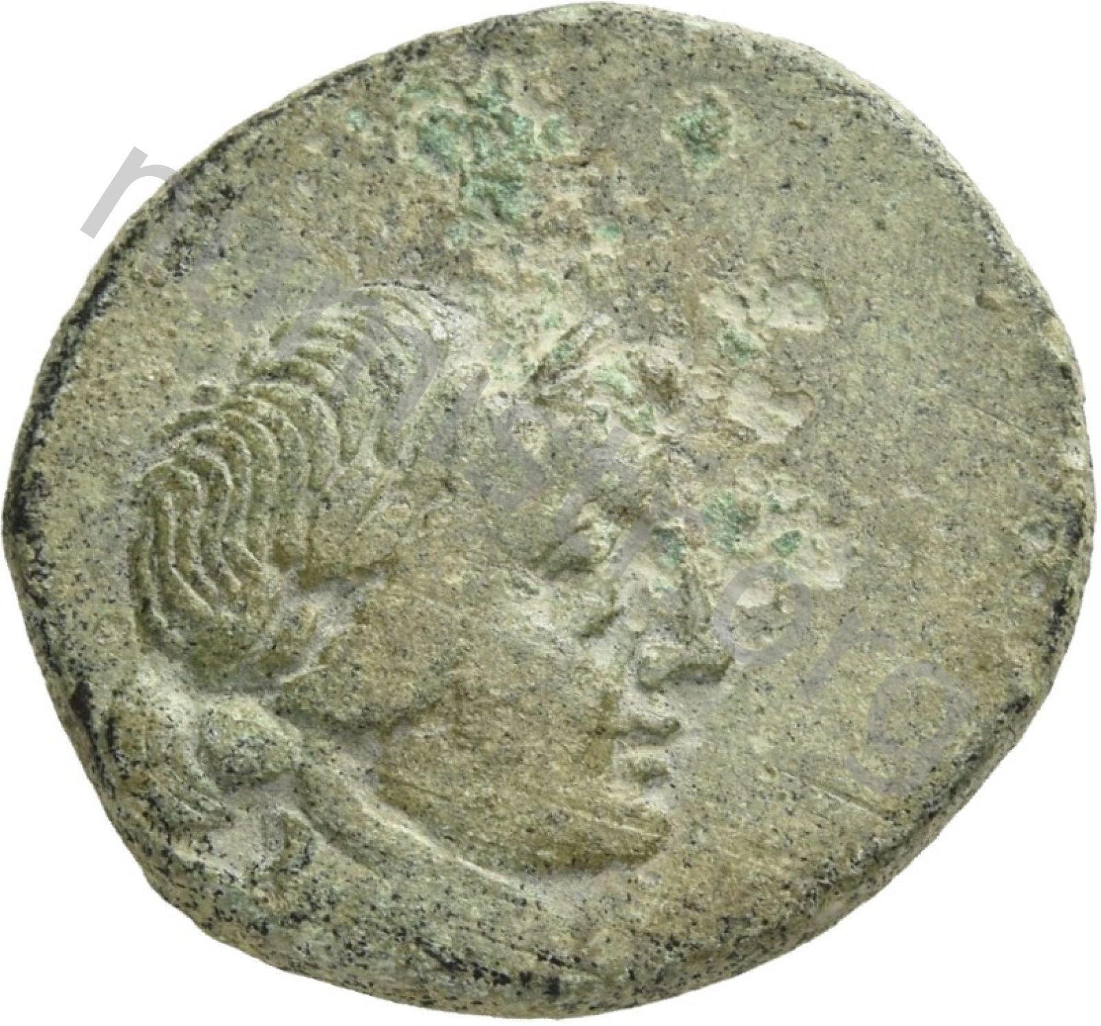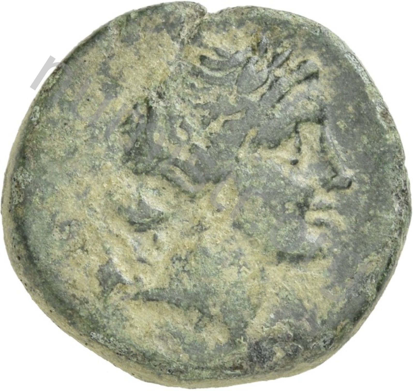 Head of Apollo wearing a laurel wreath; in the left field quiver and bow -[en]