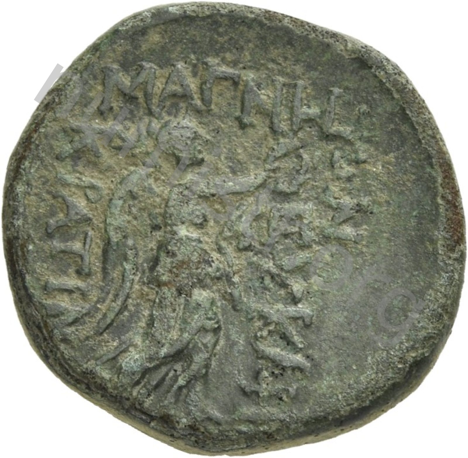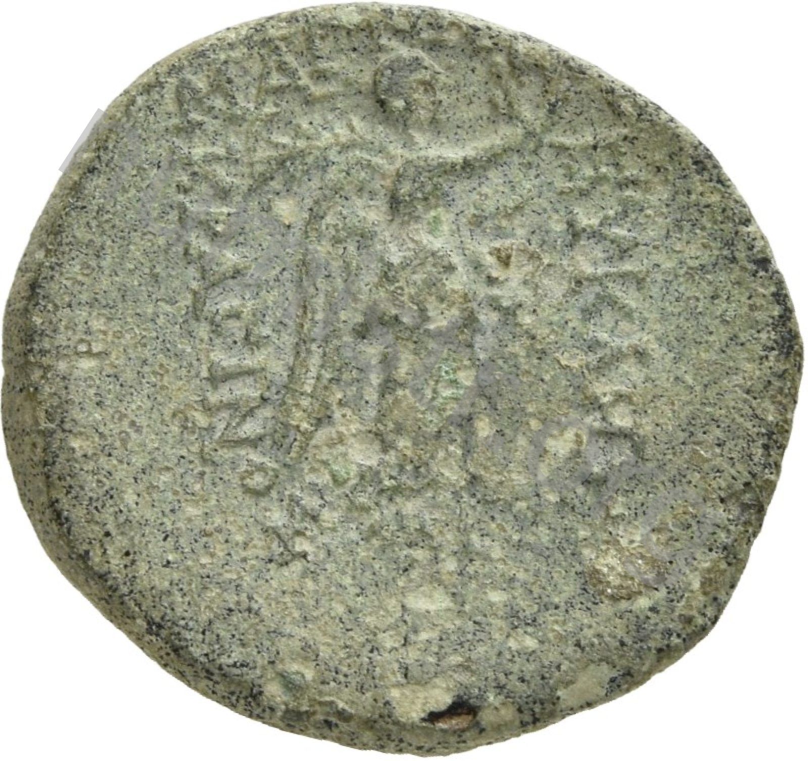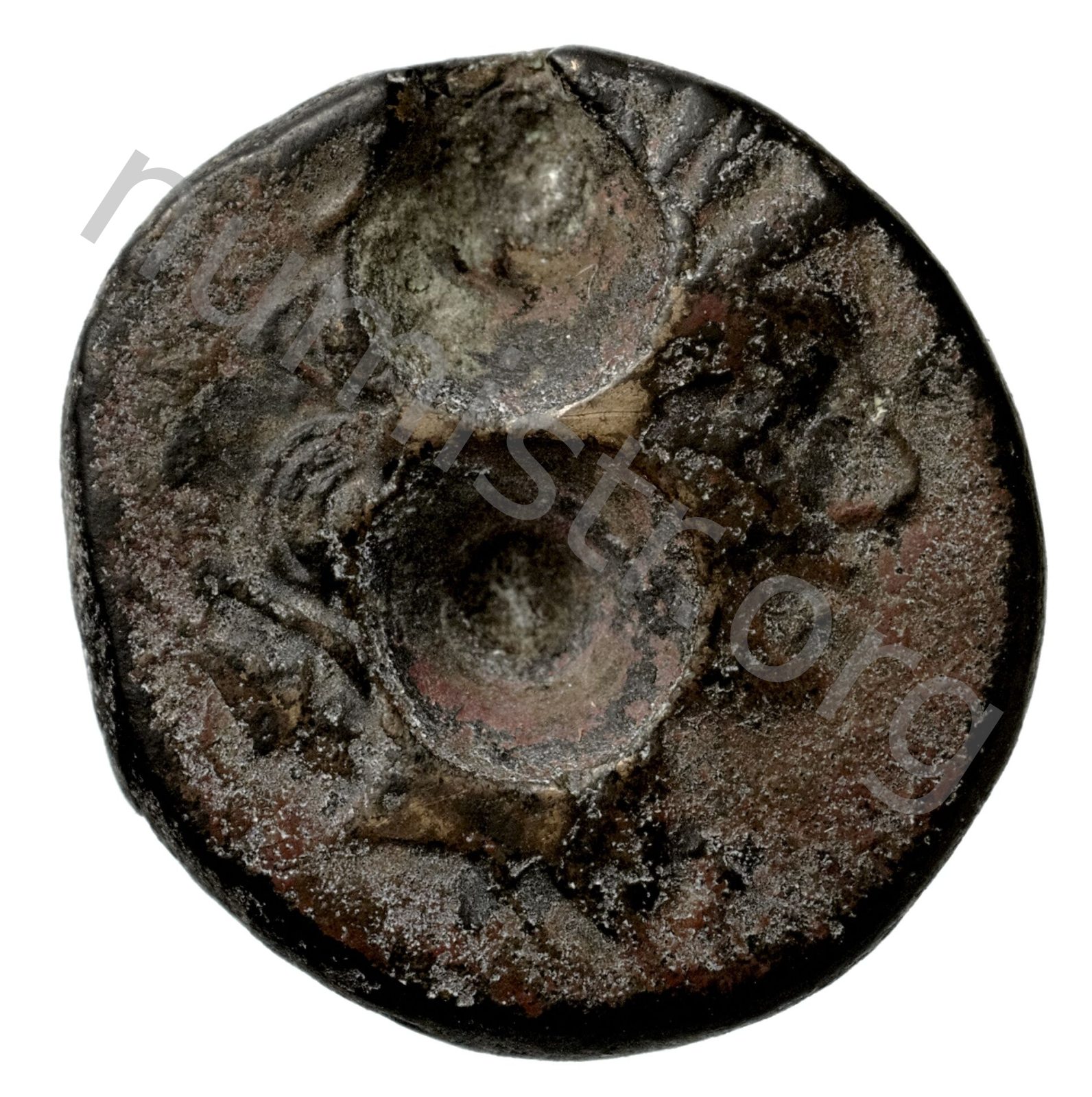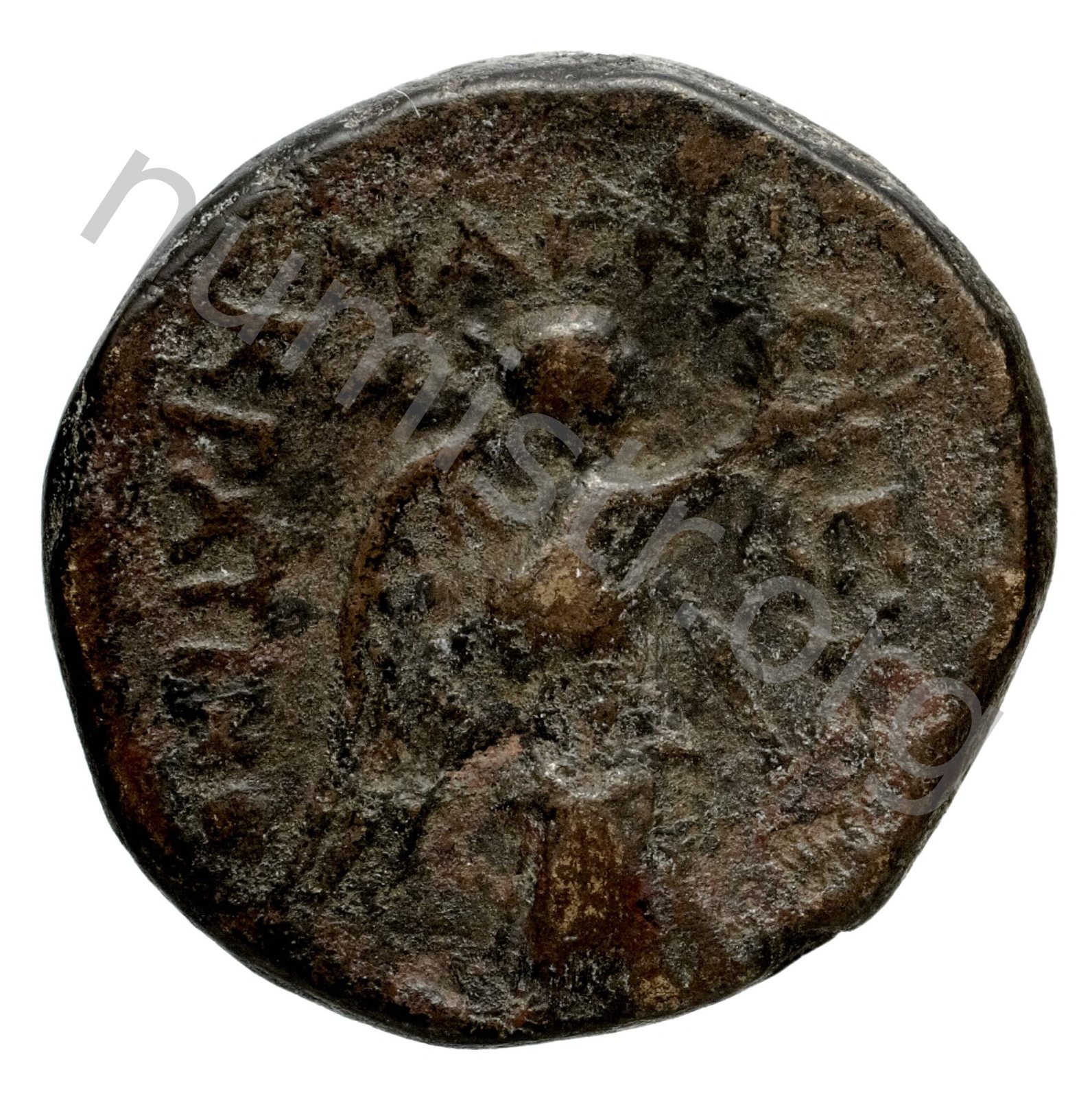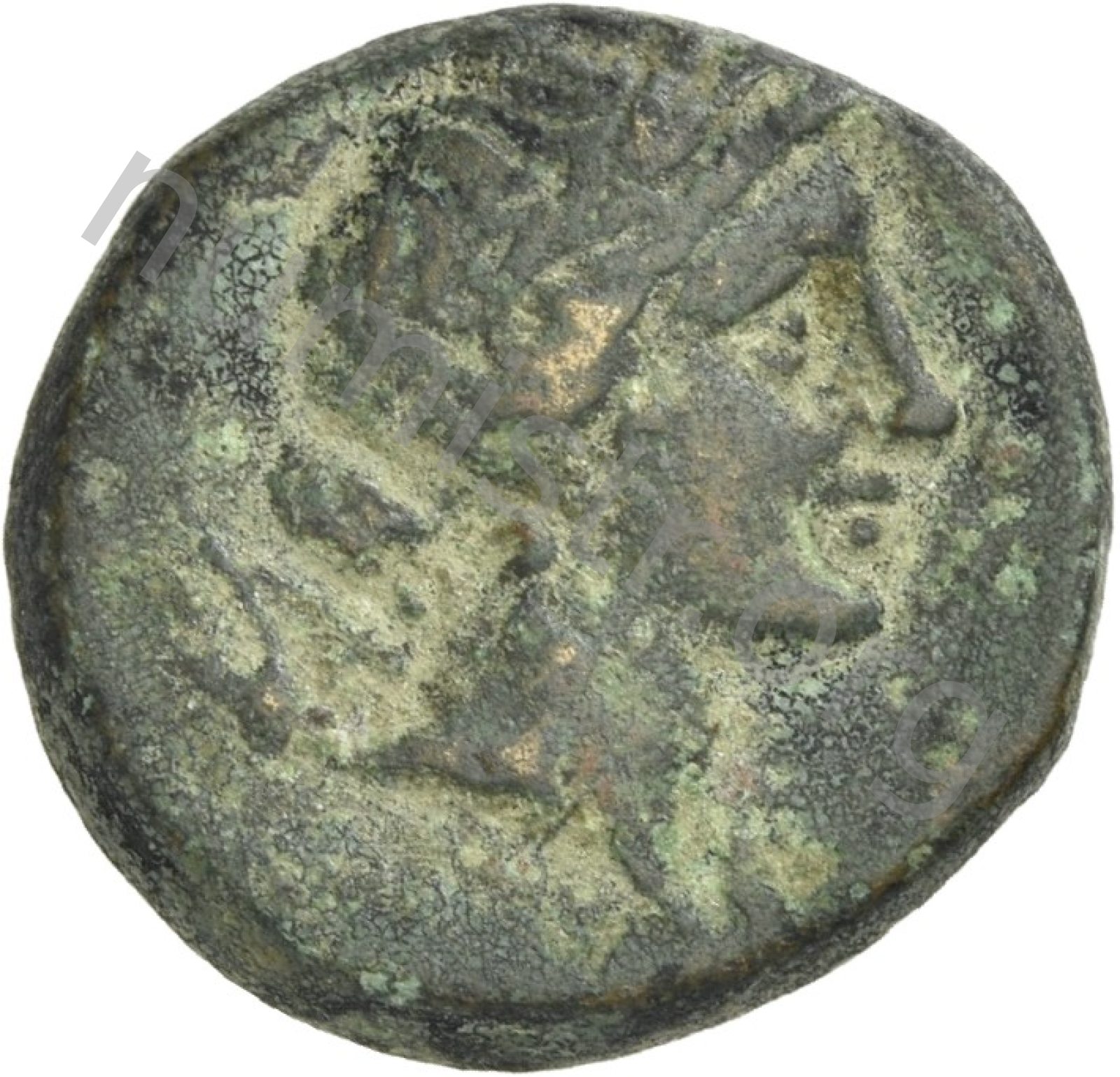Head of Apollo wearing a laurel wreath; in the left field quiver and bow -[en]