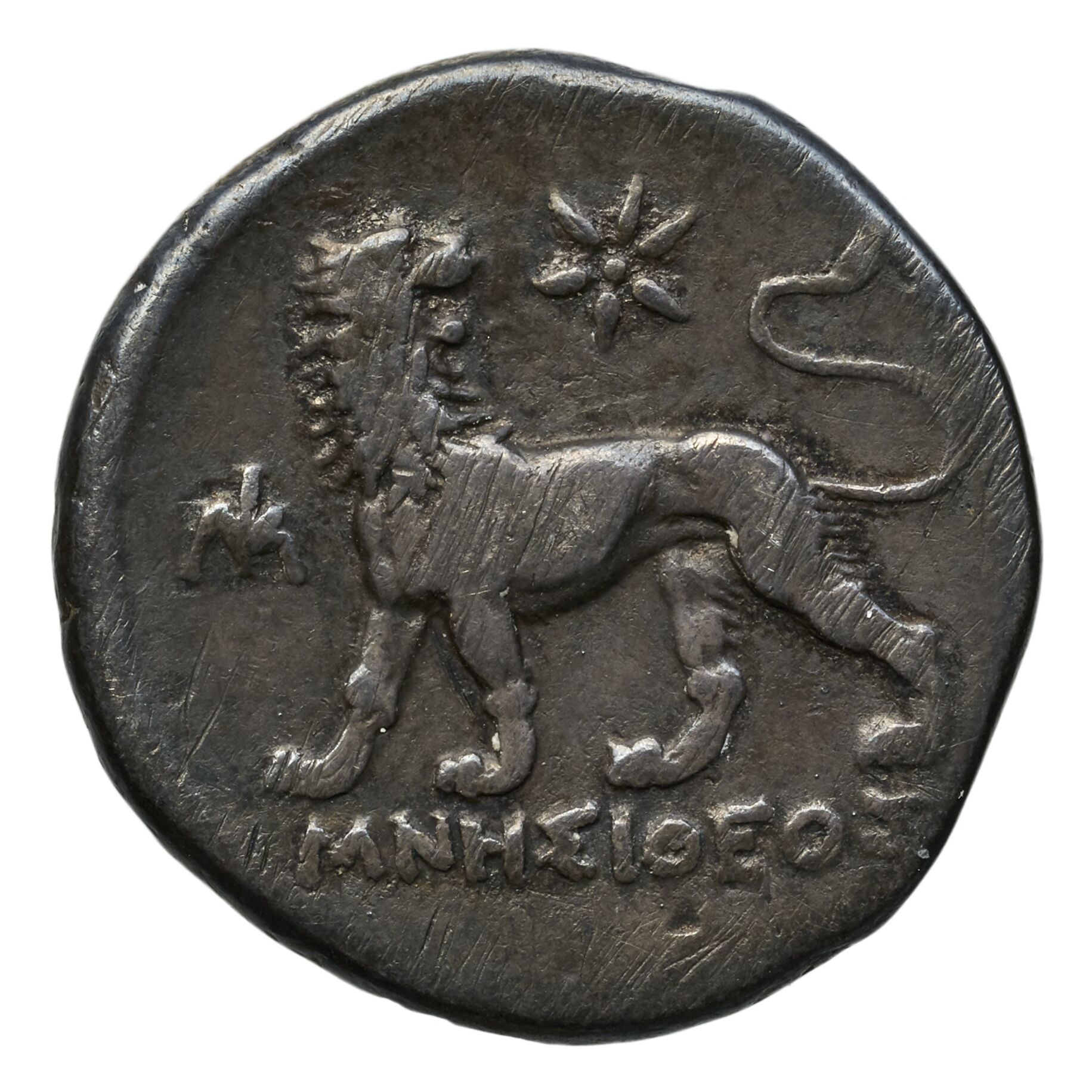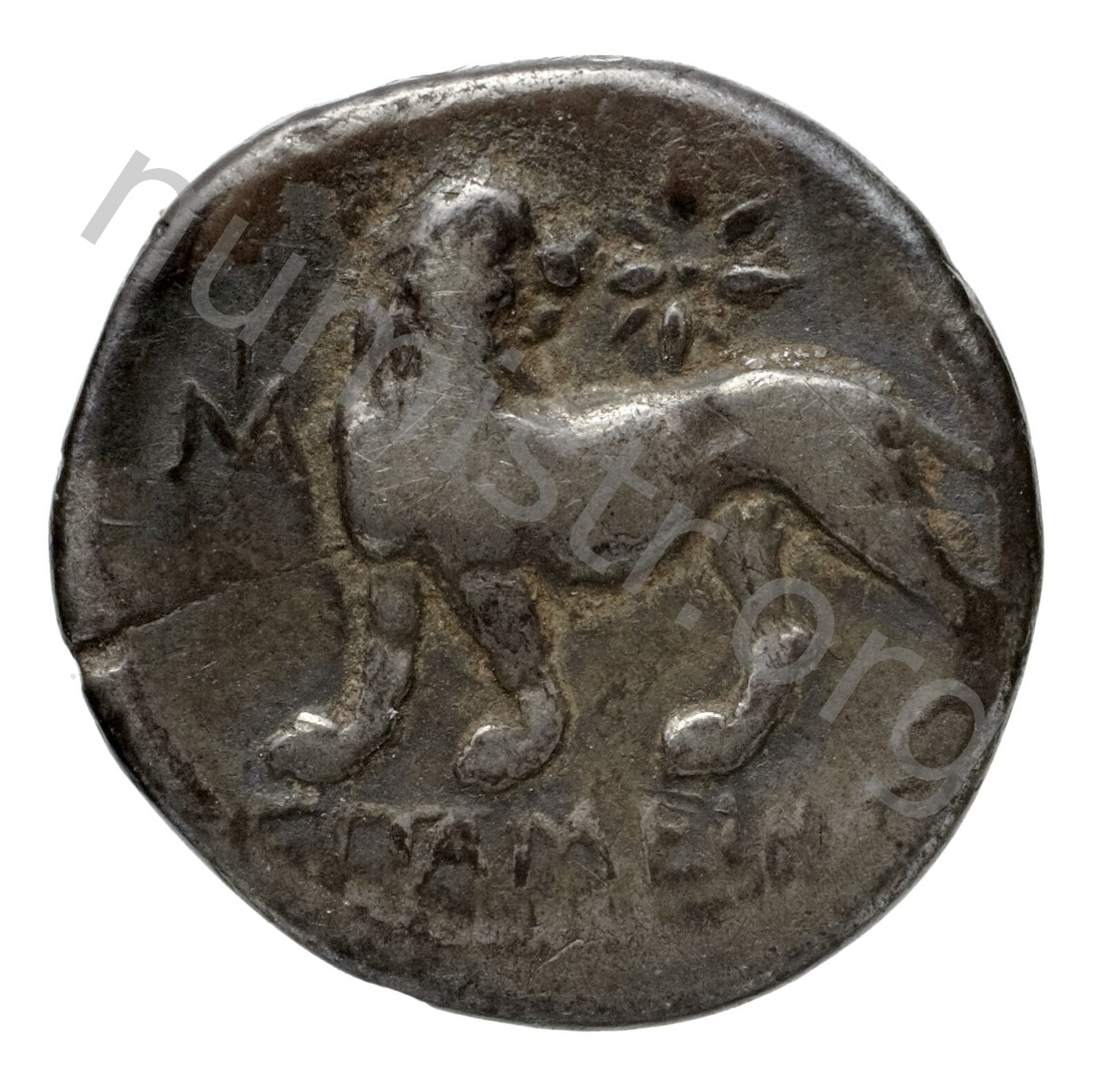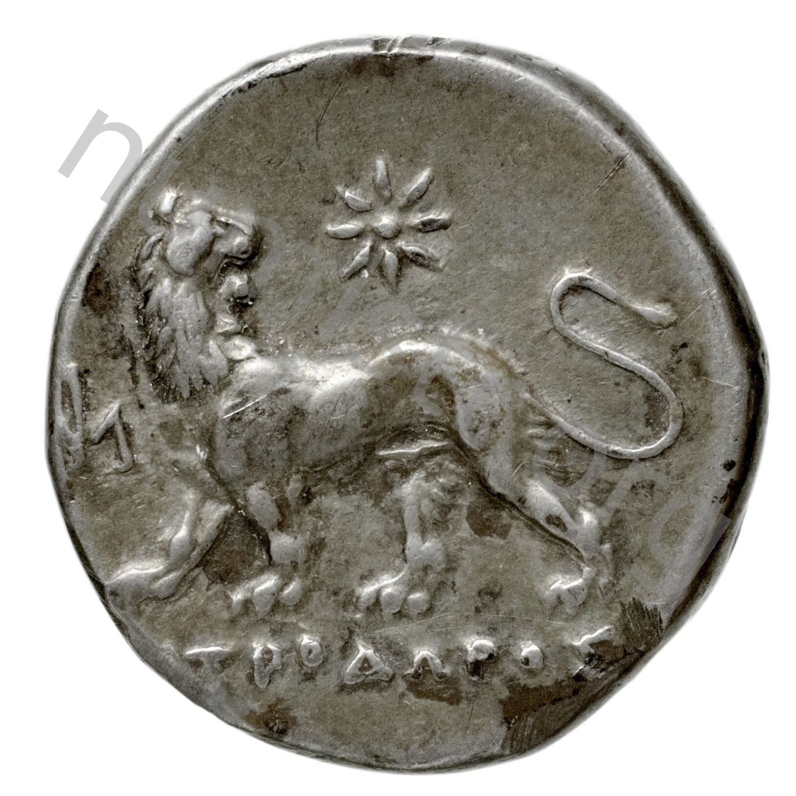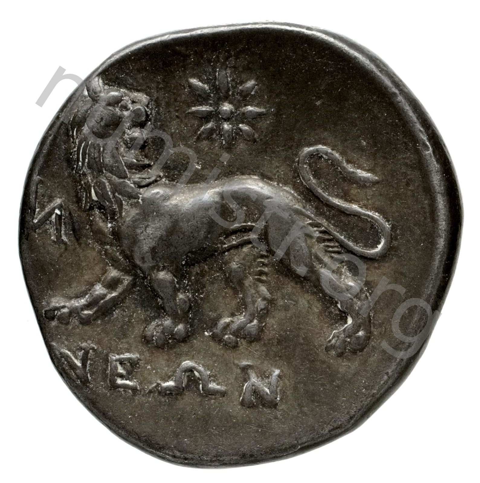 Lion turning his head; in the upper field star -[en]
