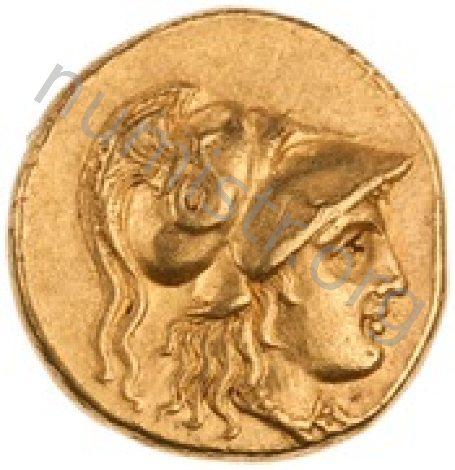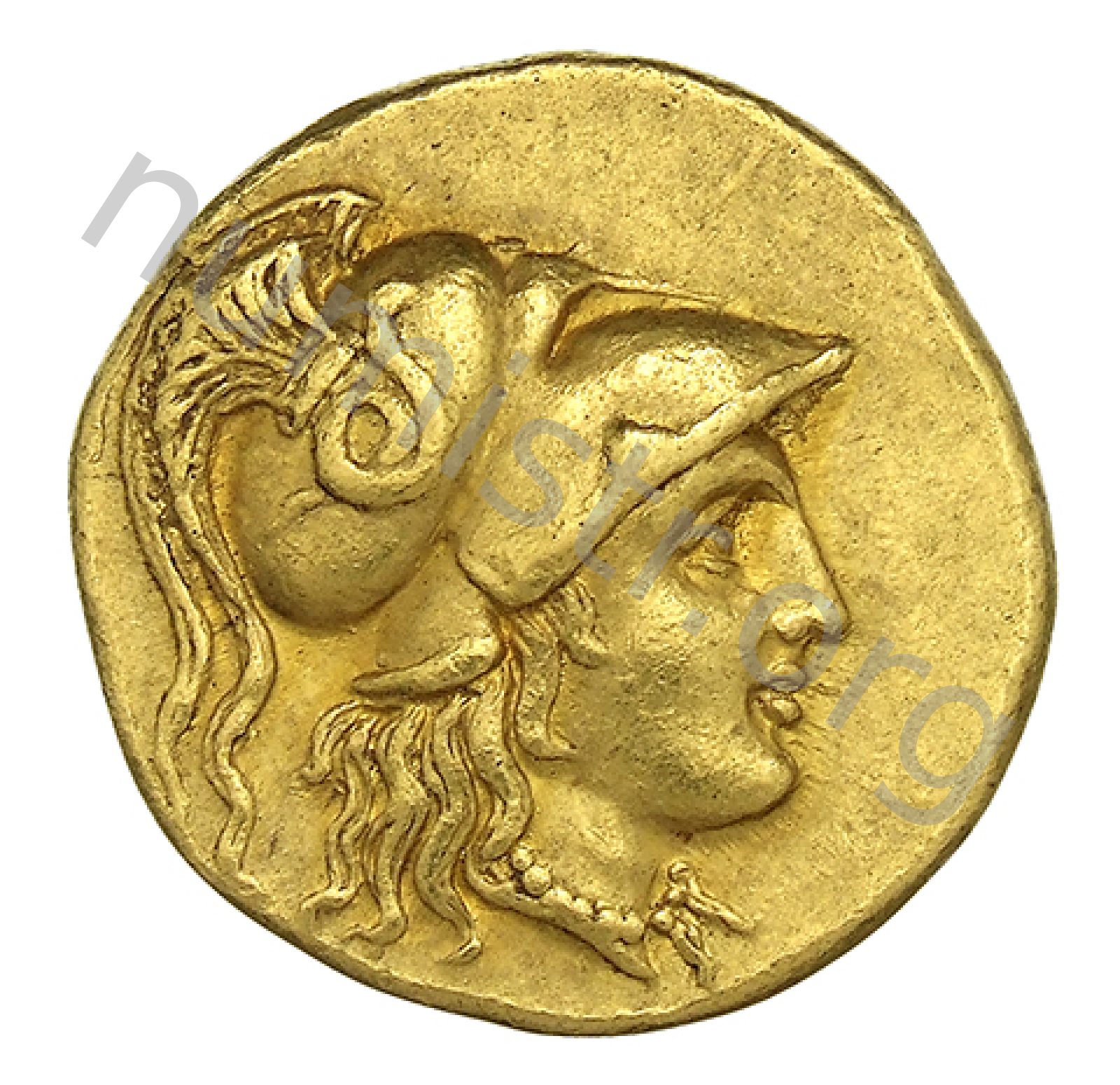 Head of Athena right wearing Corinthian helmet with crest -[en]