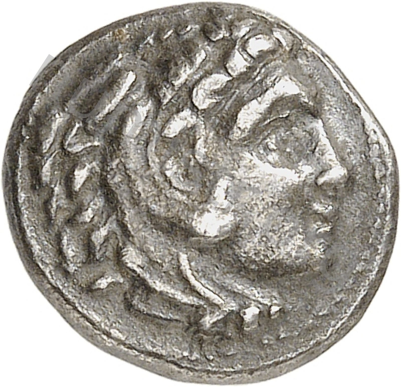 Head of beardless Heracles right wearing lion skin headdress -[en]