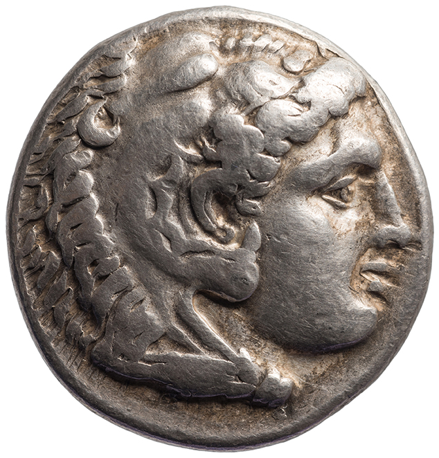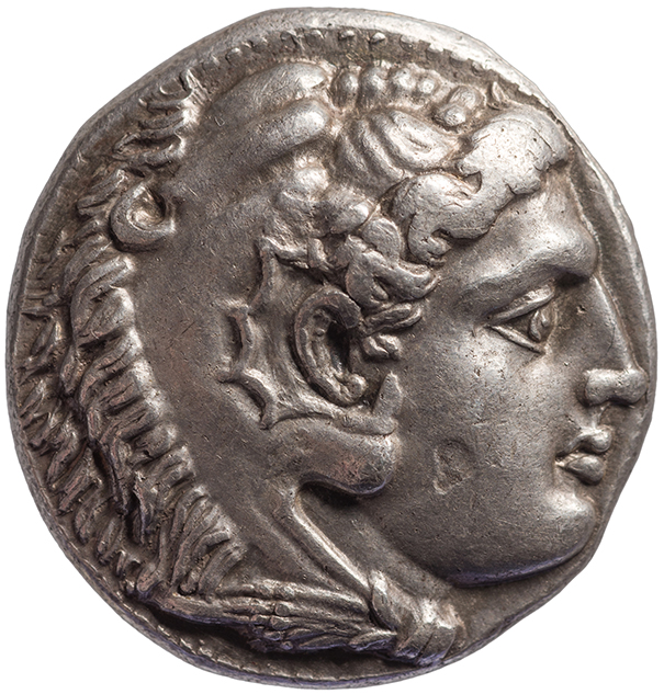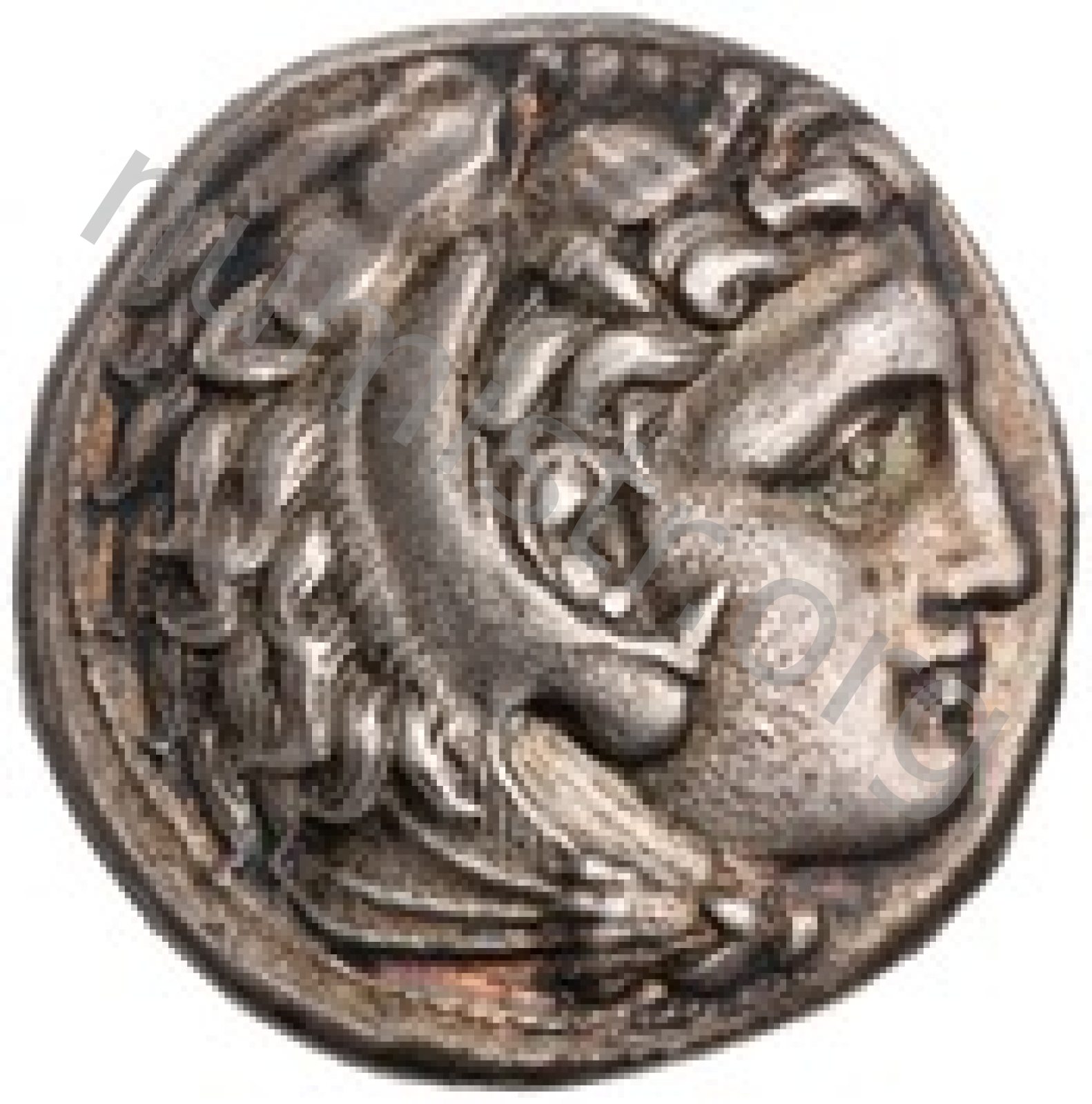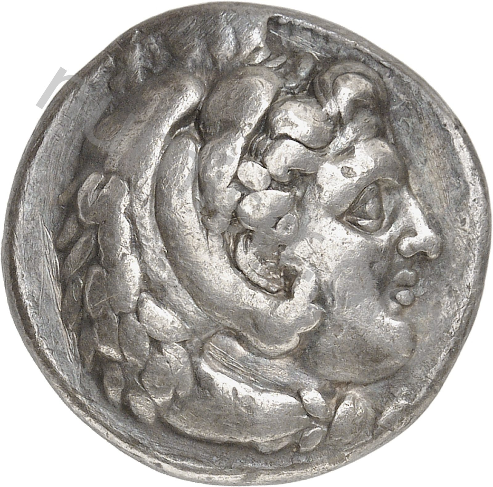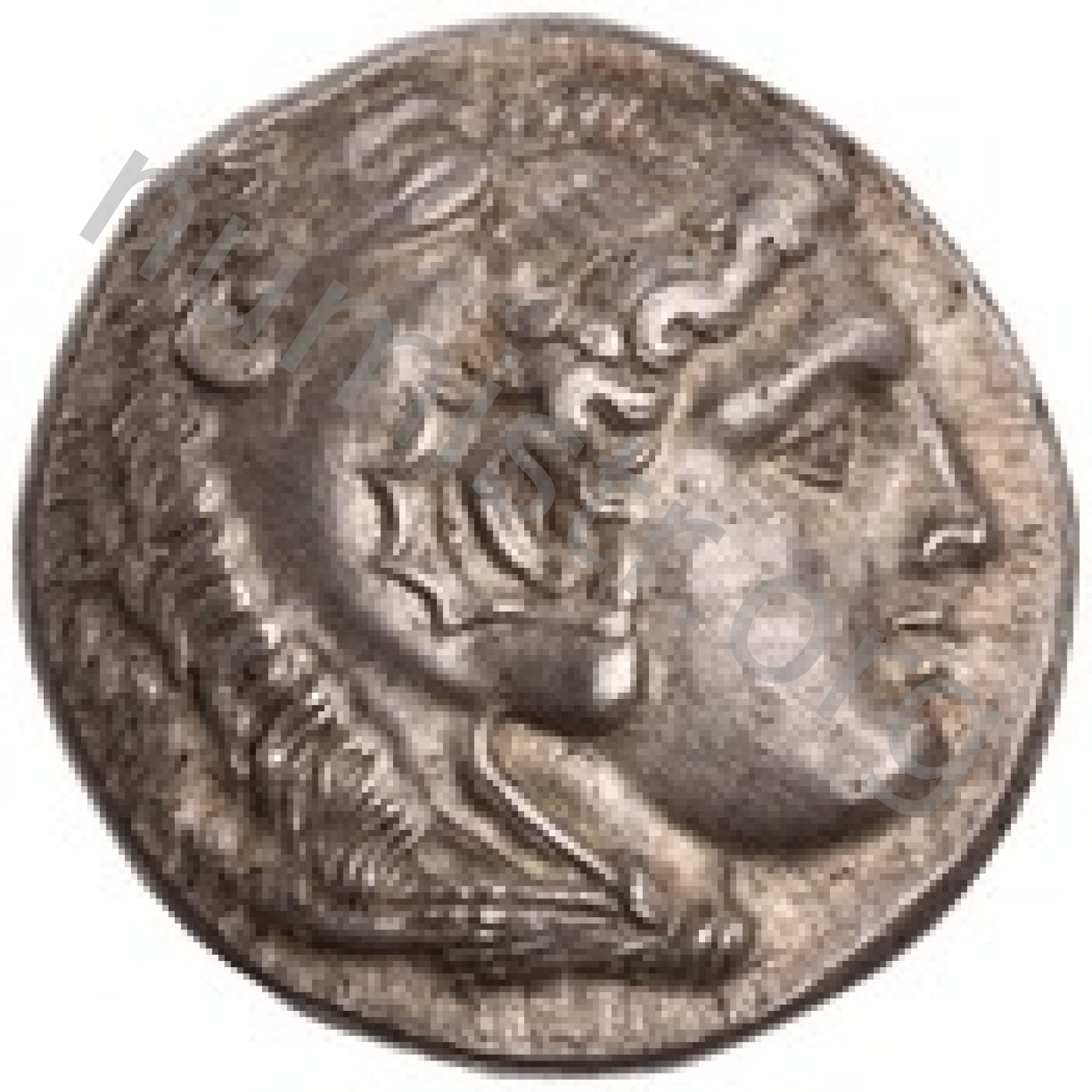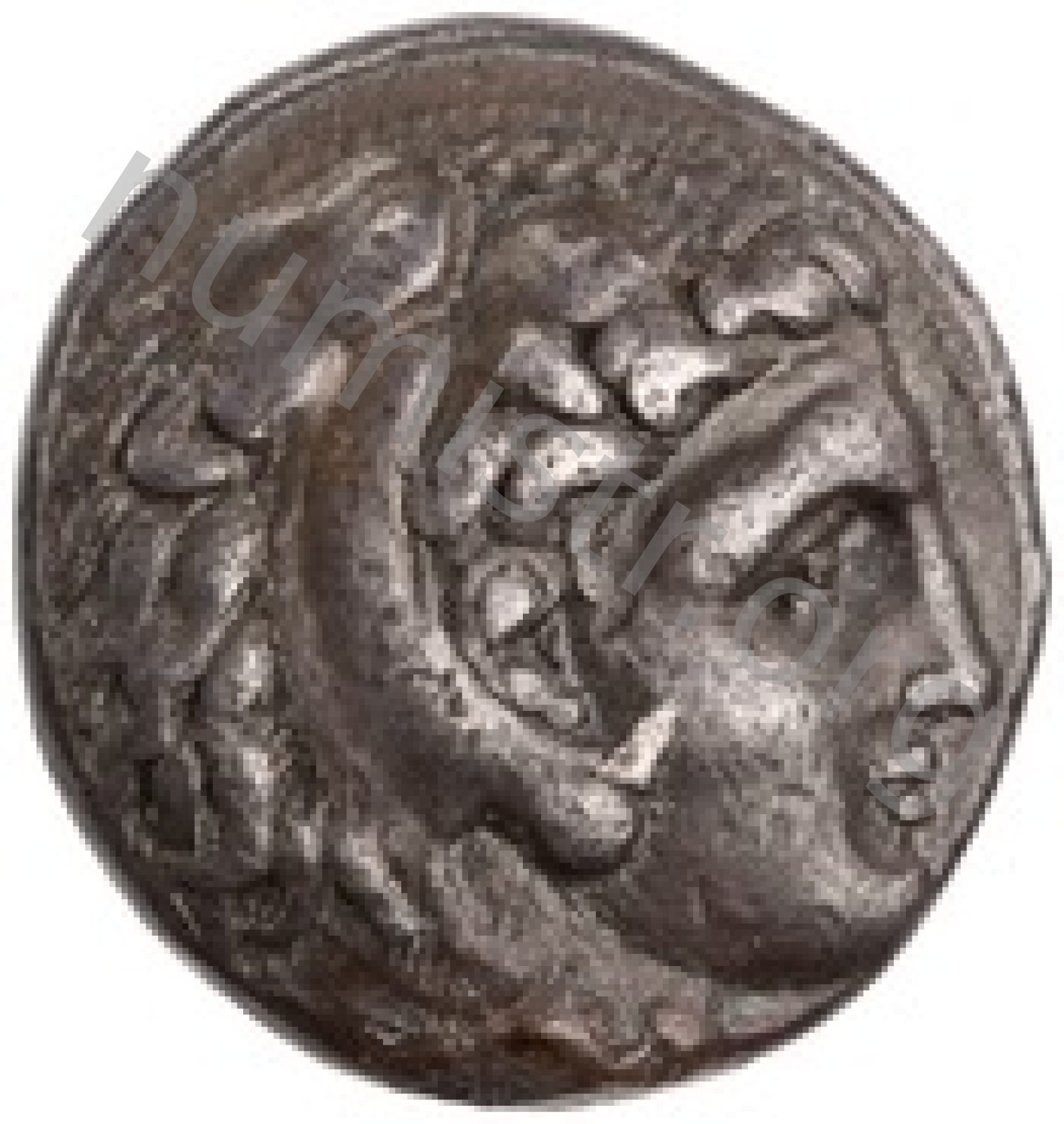 Head of beardless Heracles right wearing lion skin headdress -[en]
