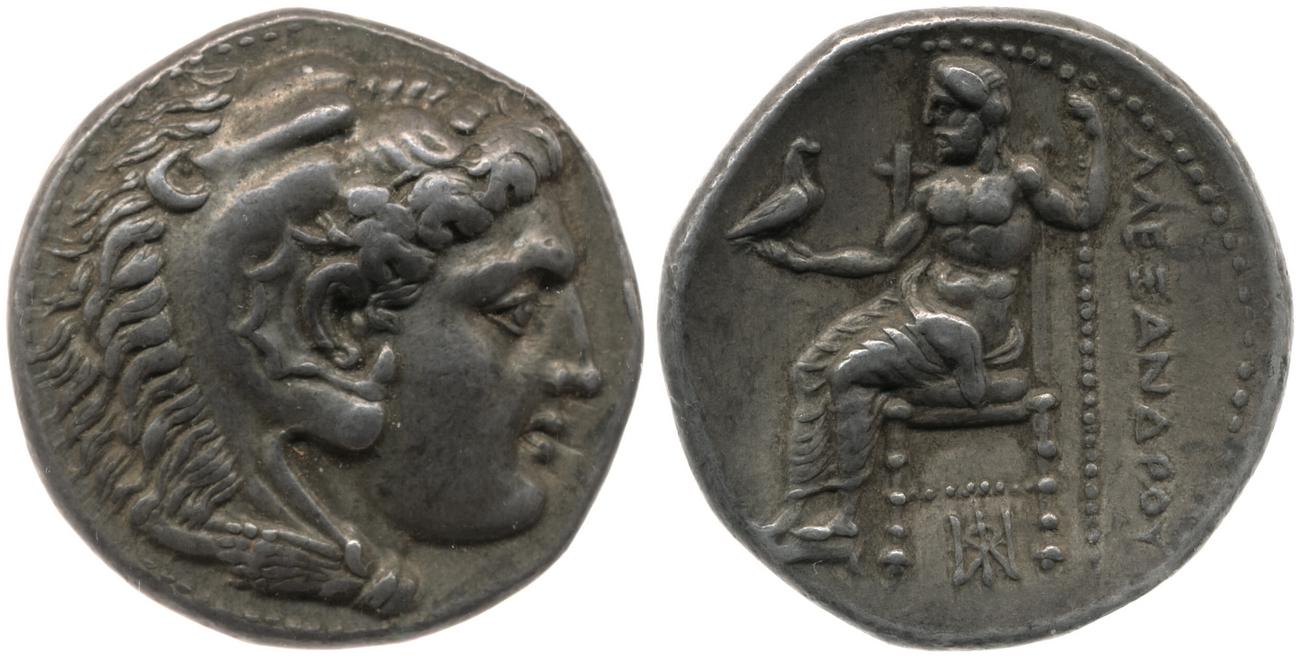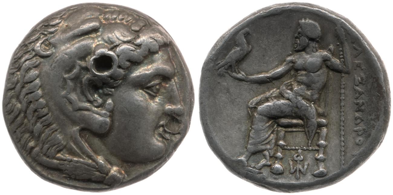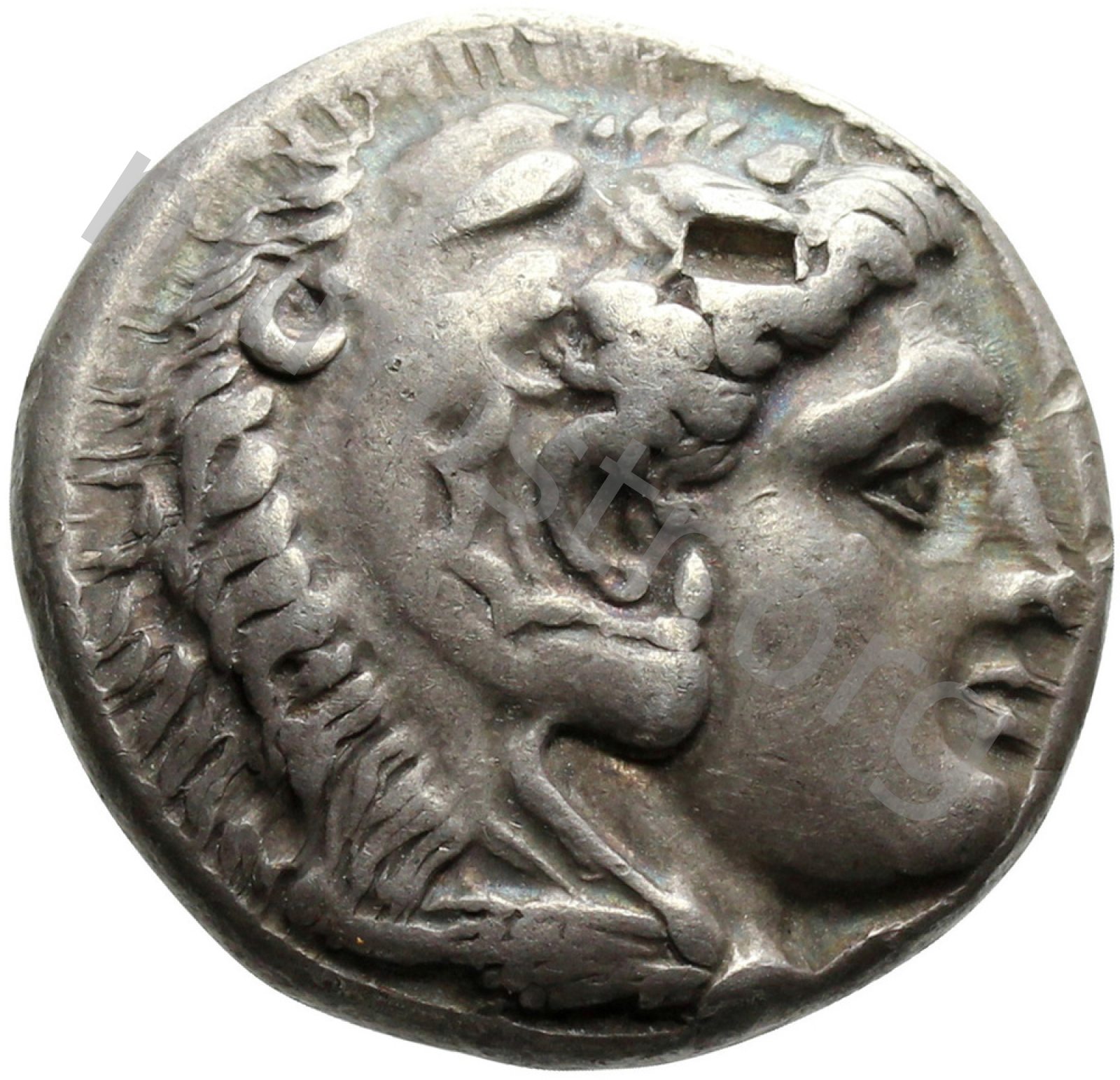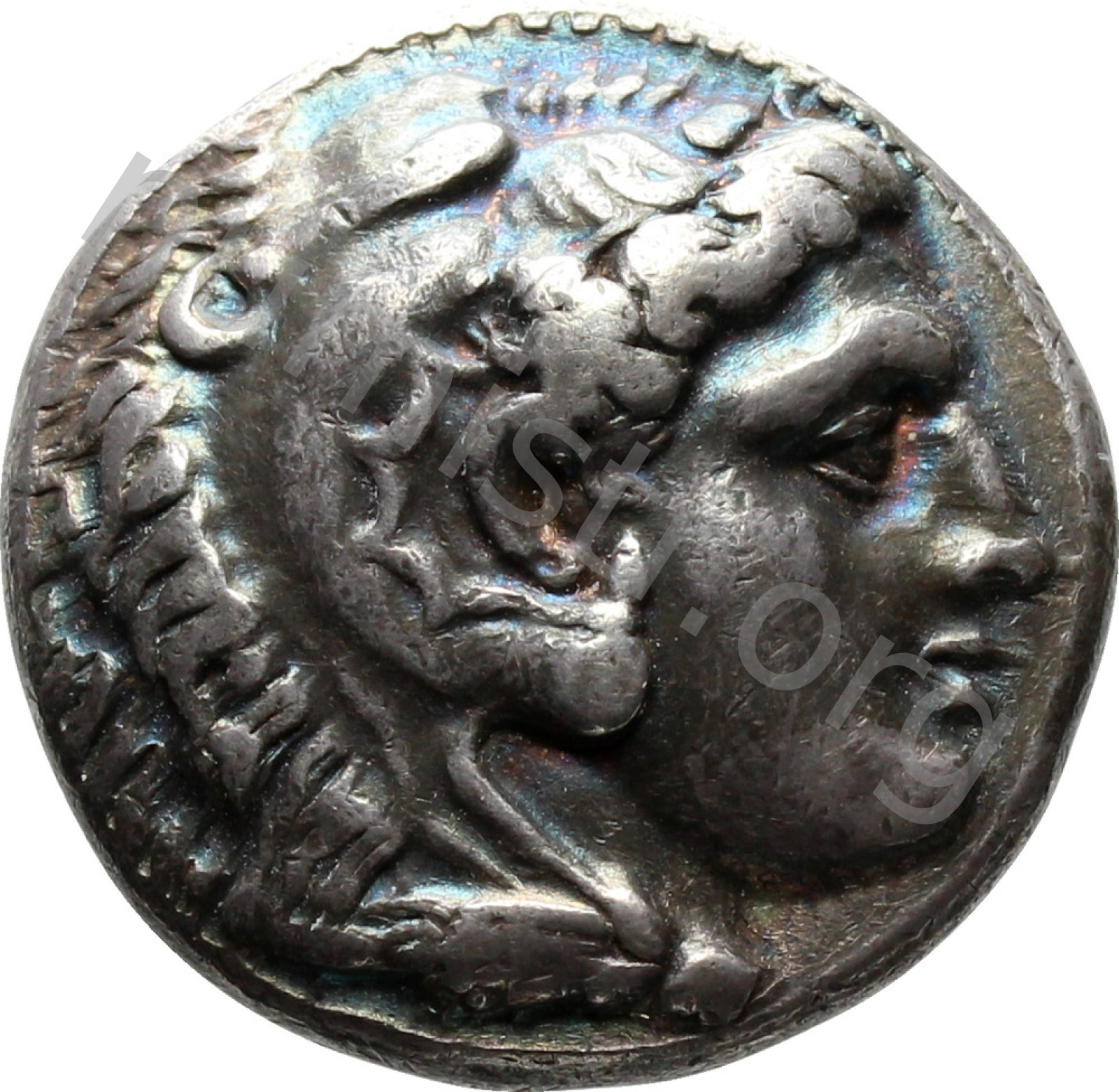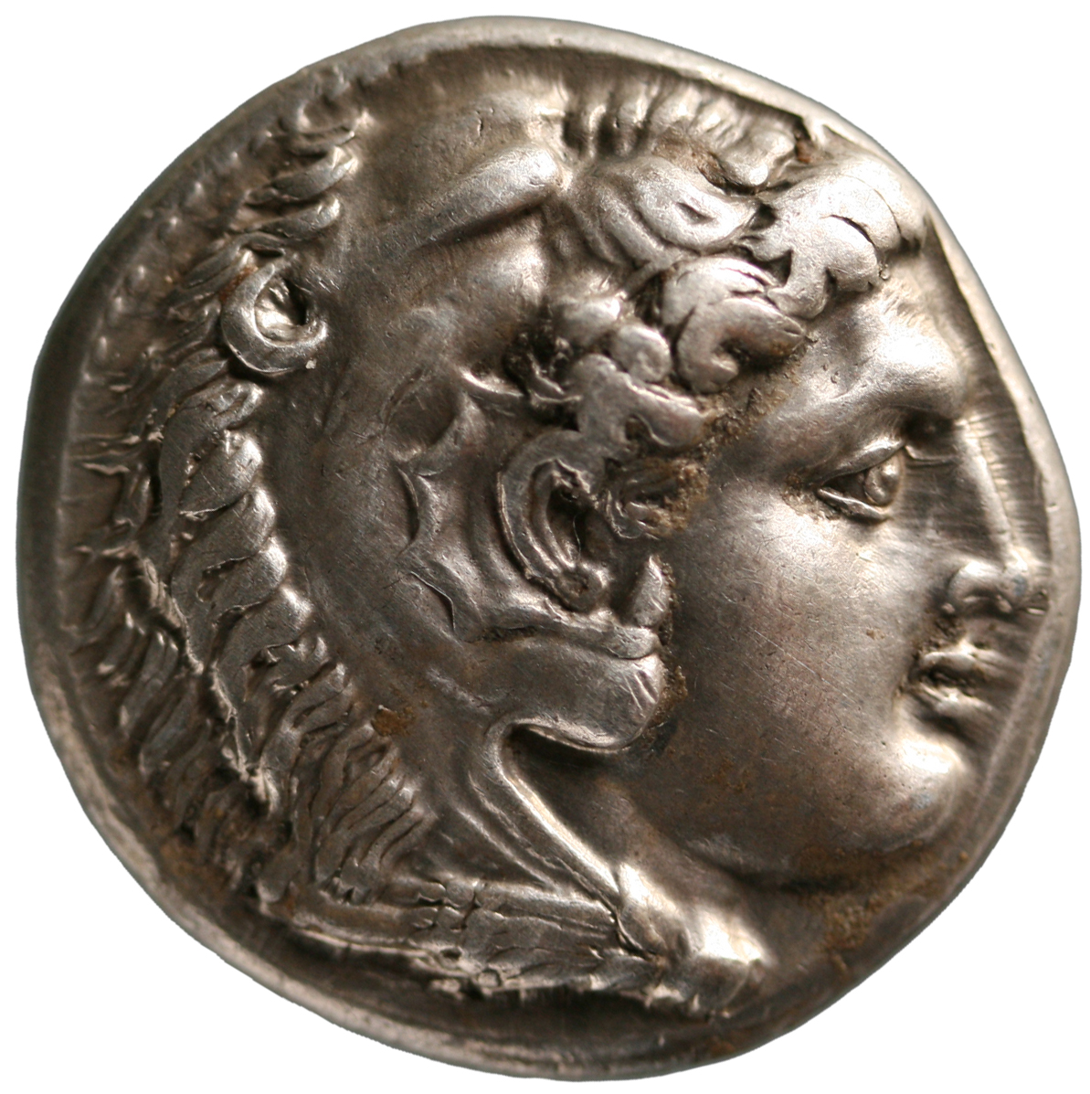 Head of beardless Heracles right wearing lion skin headdress -[en]
