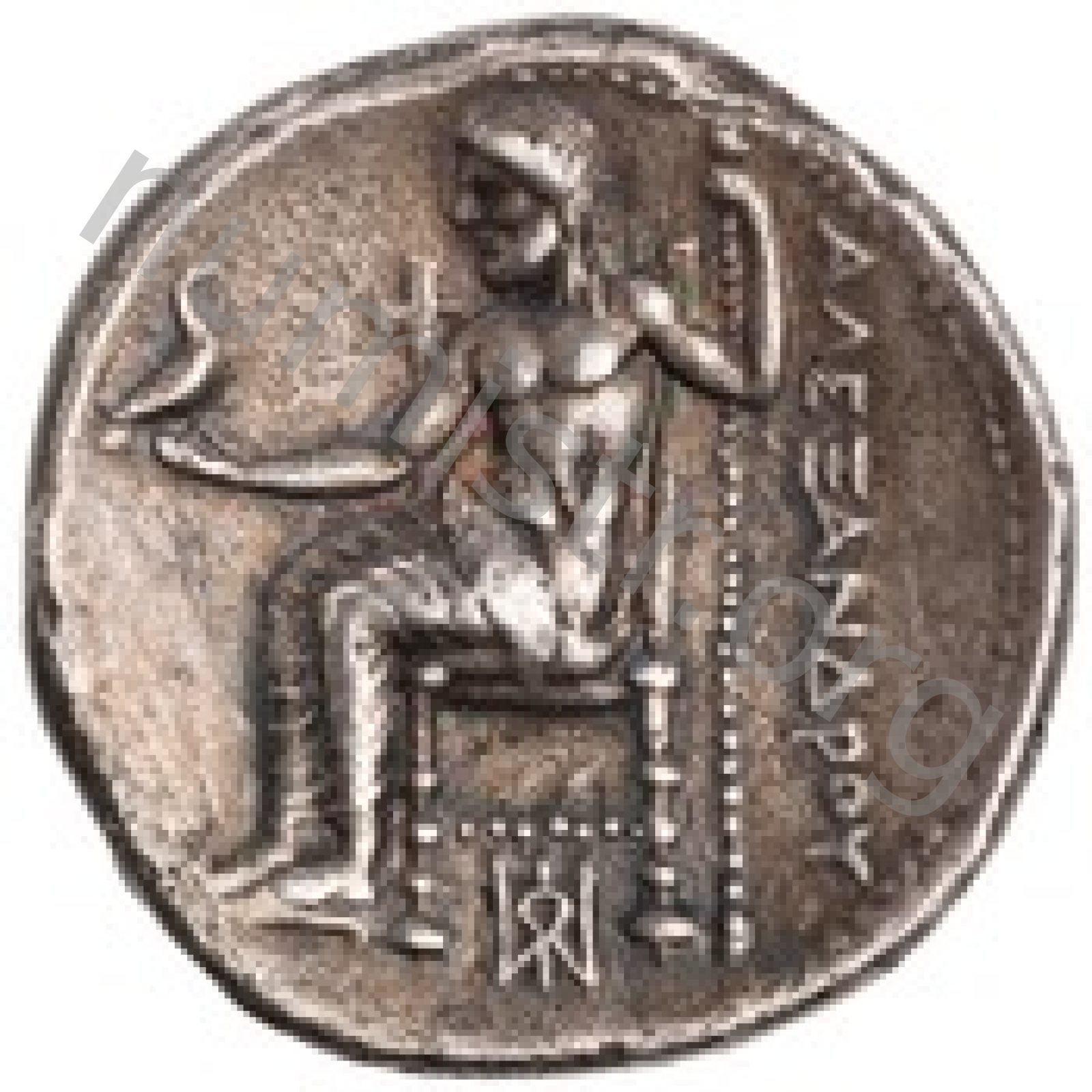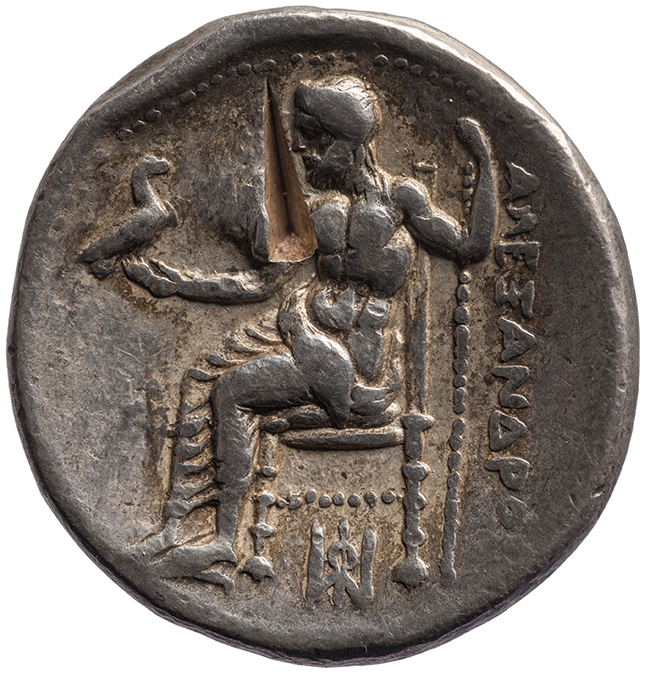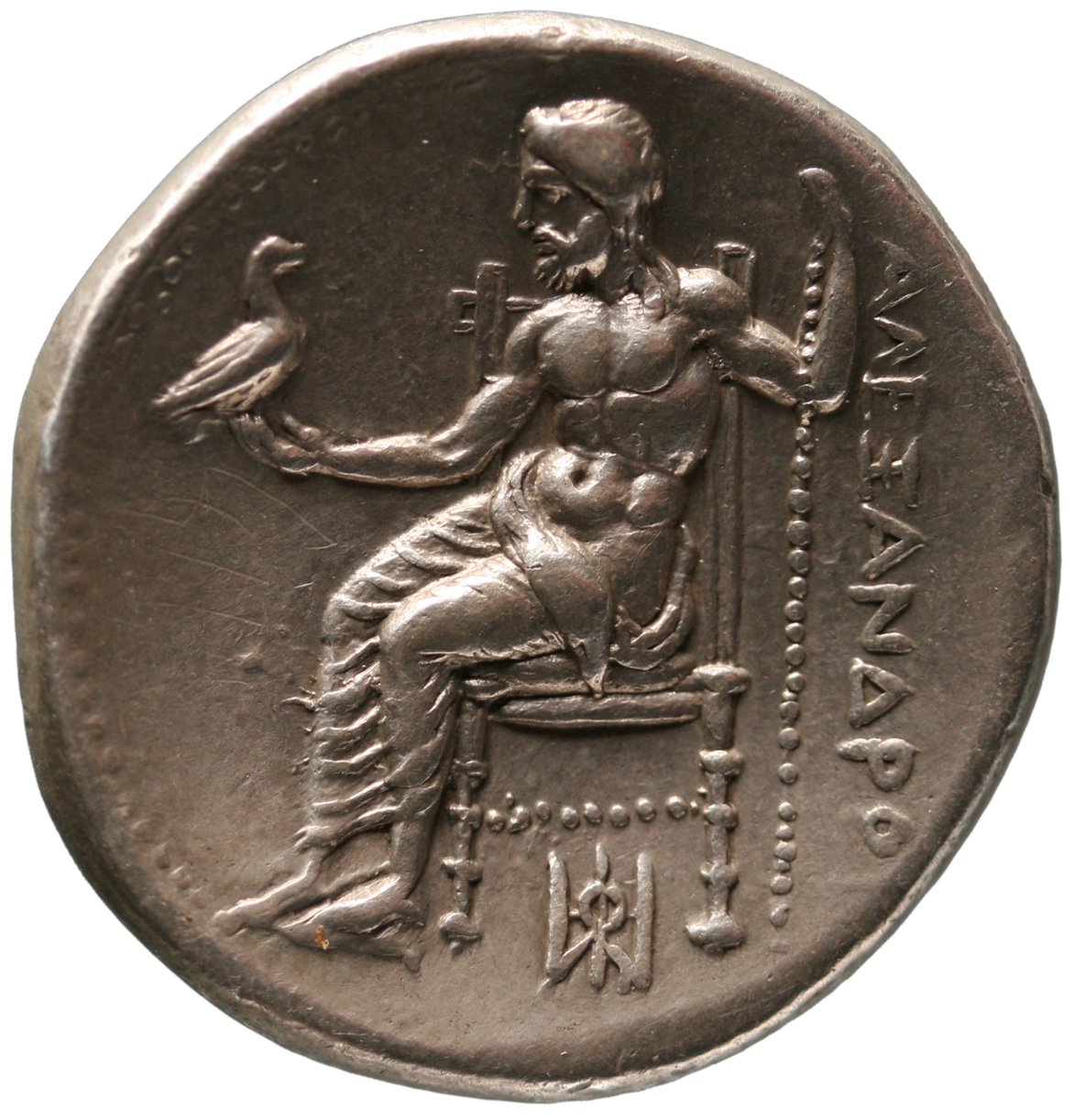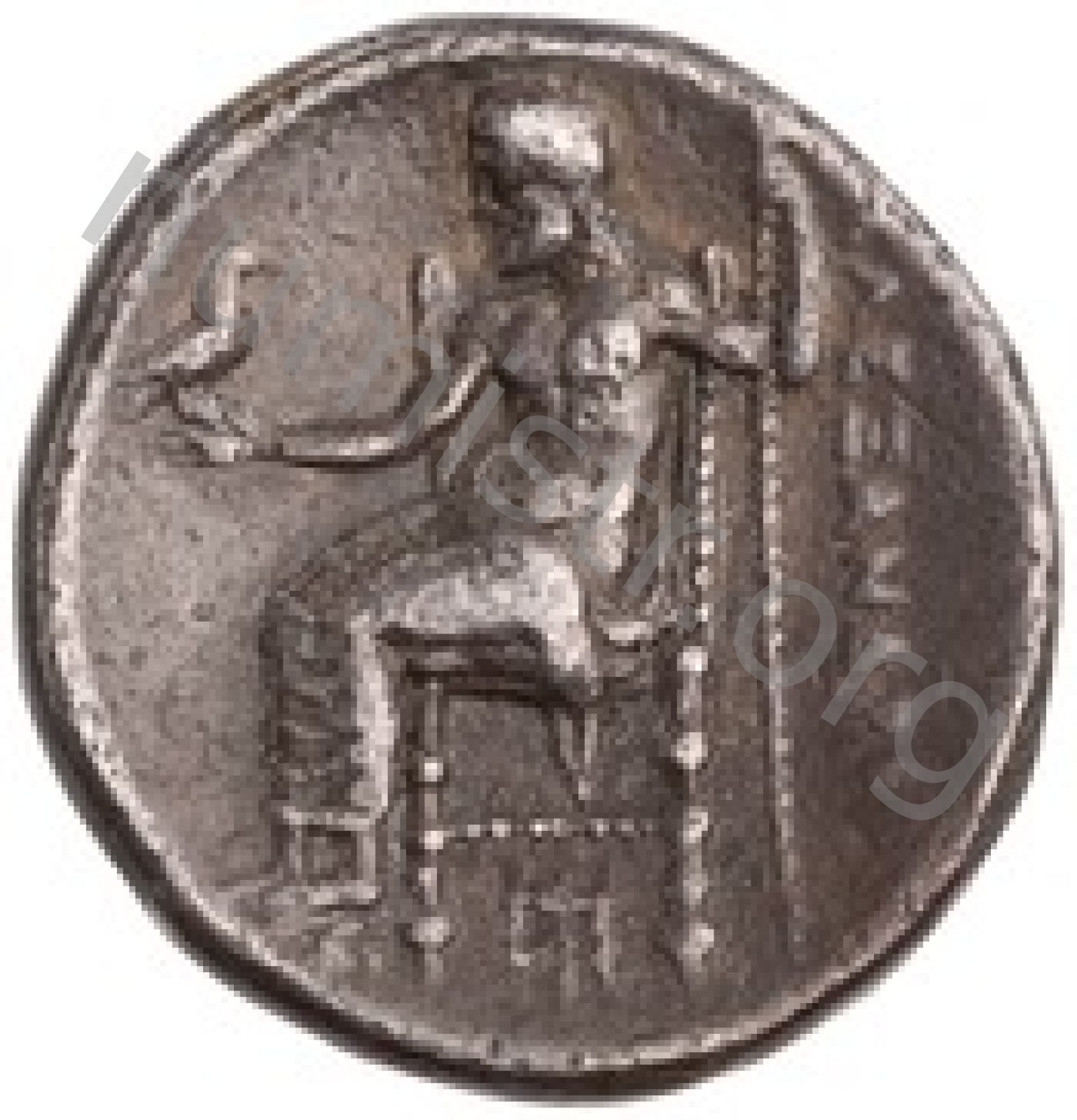 Zeus tabure-tahtta oturuyor sol elinde kartal sağ elinde asa var.