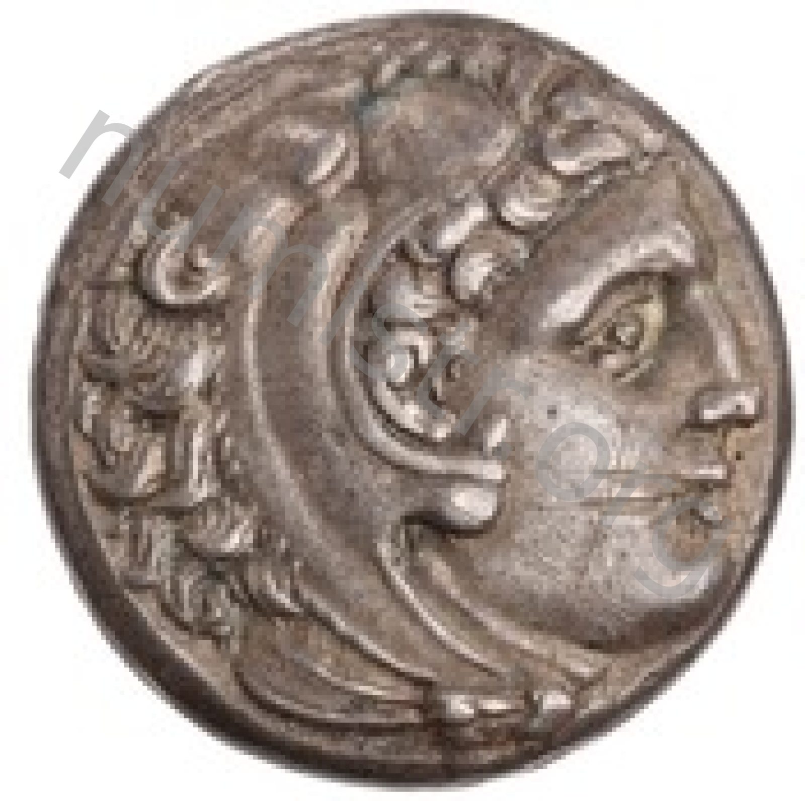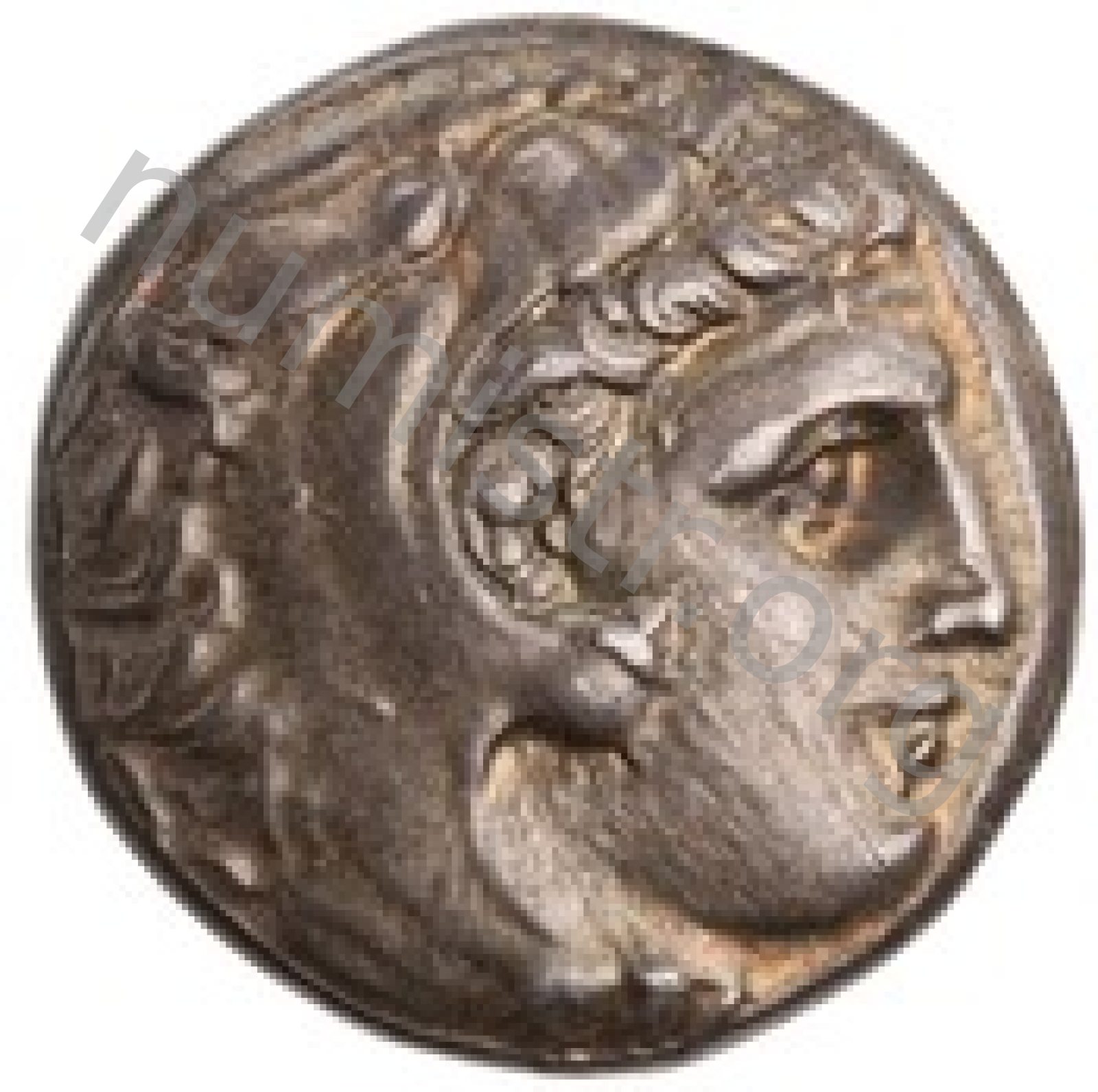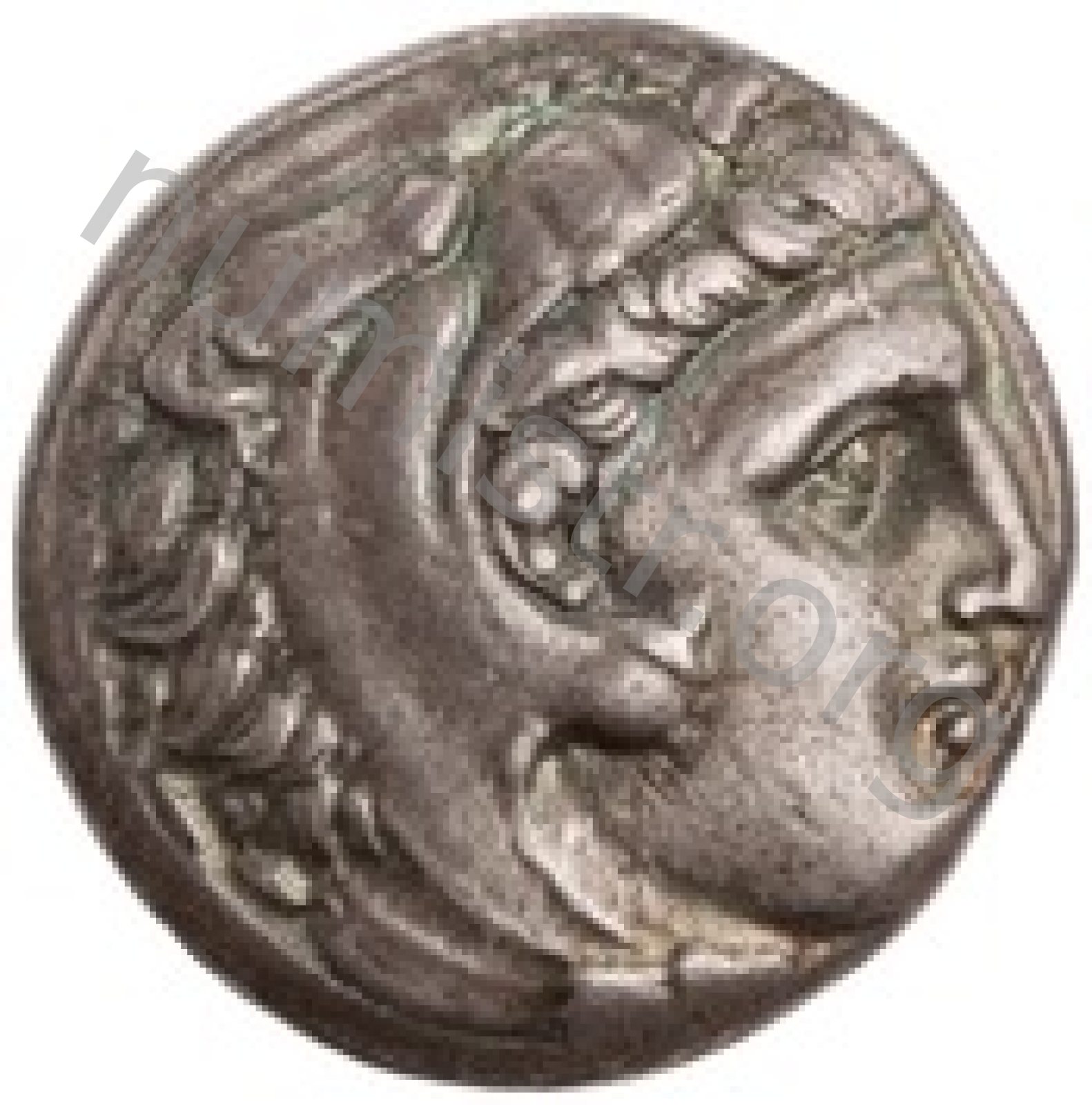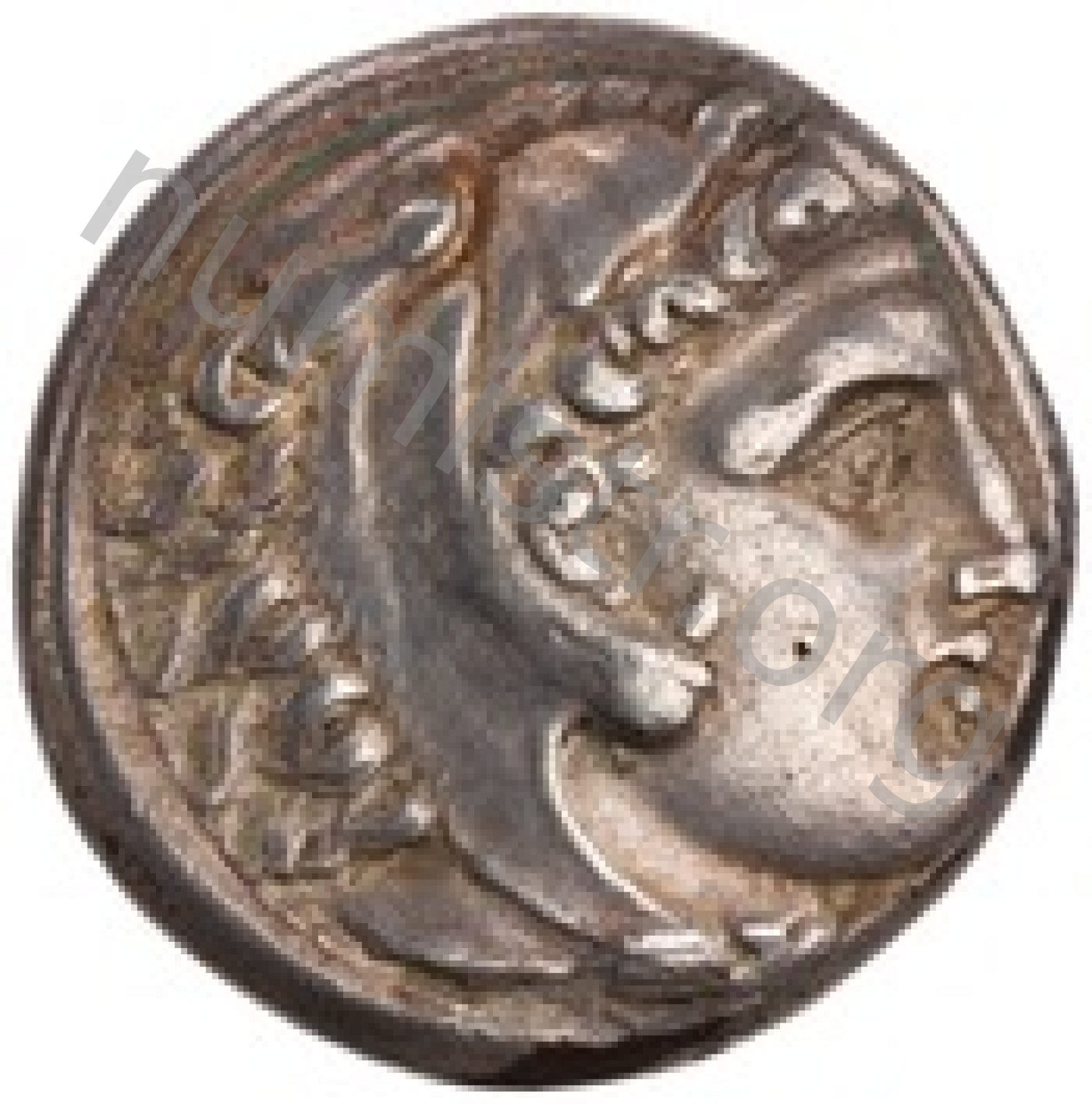 Head of beardless Heracles right wearing lion skin headdress -[en]