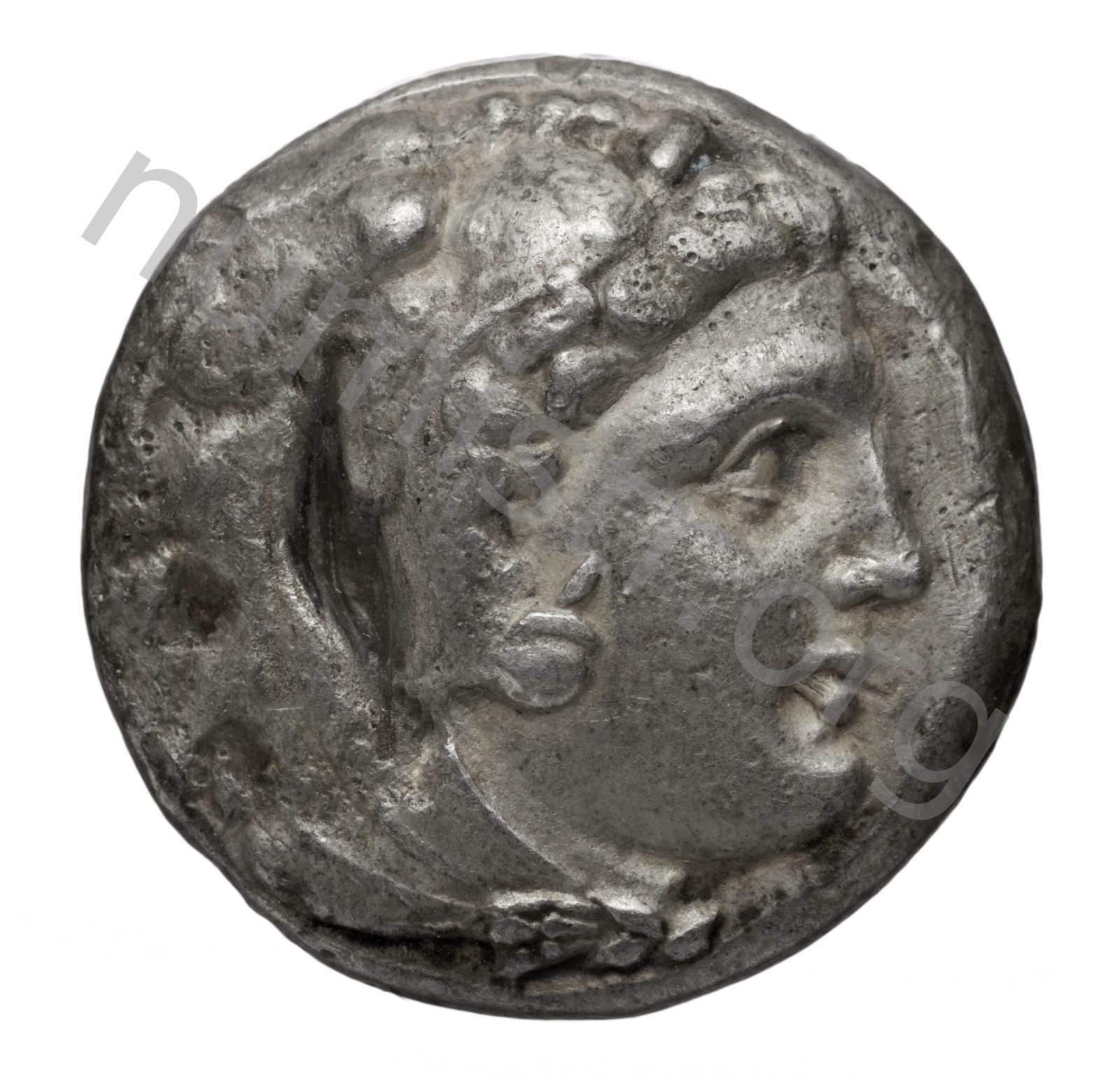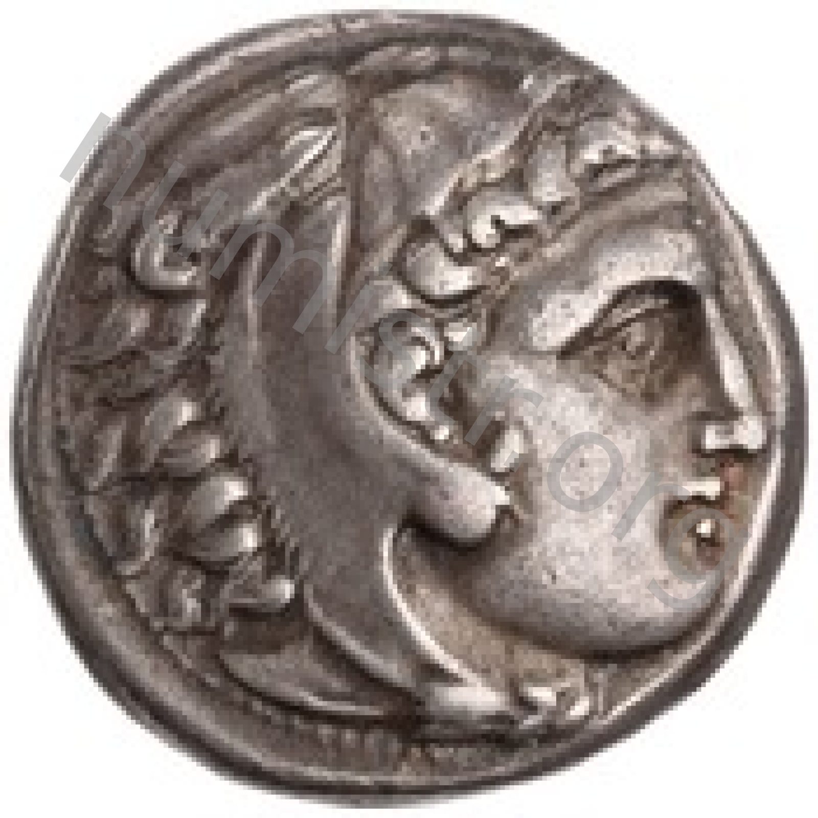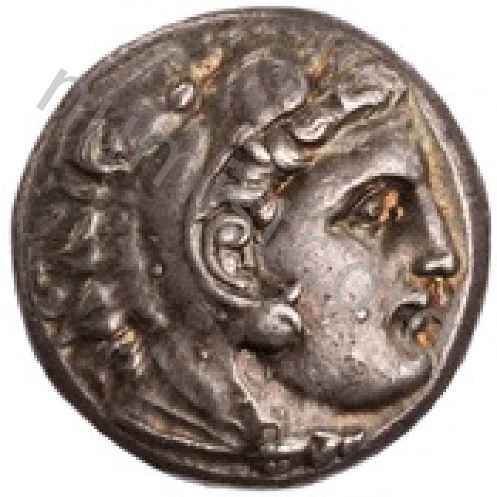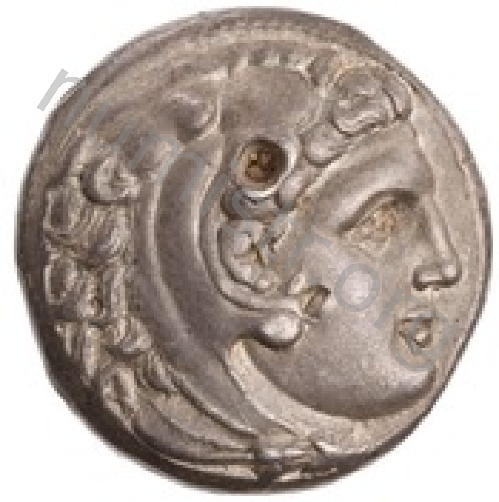 Head of beardless Heracles right wearing lion skin headdress -[en]