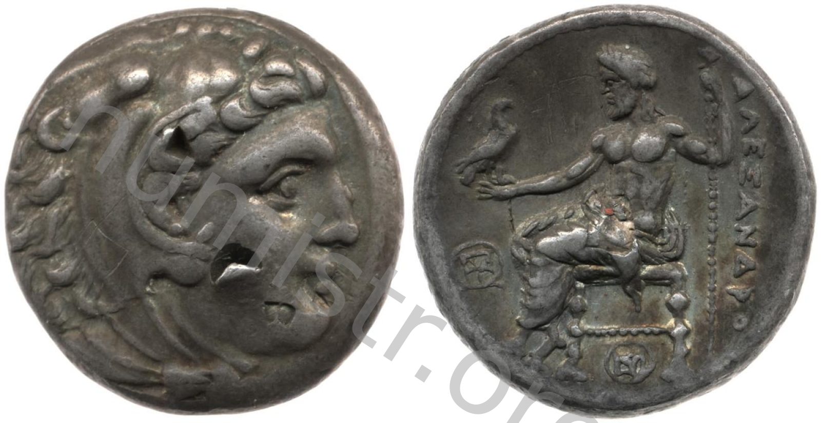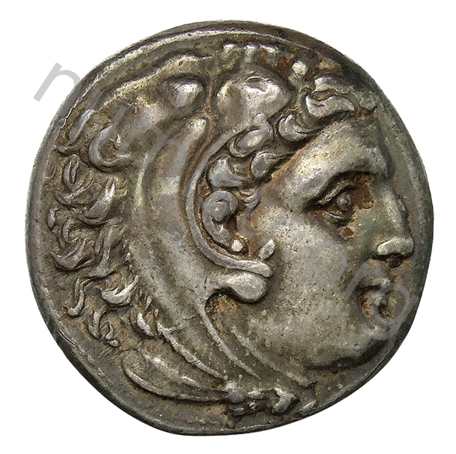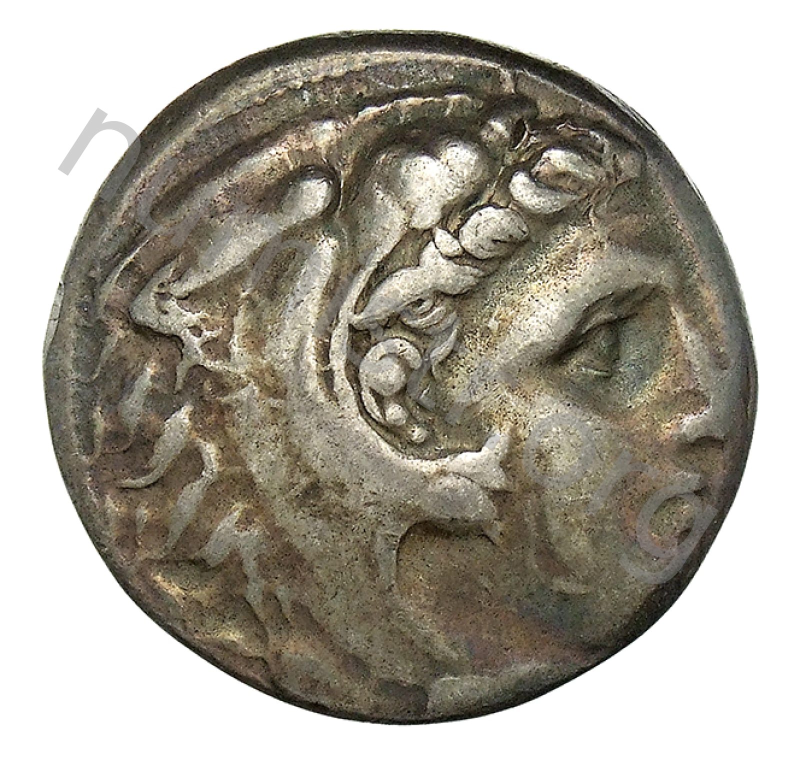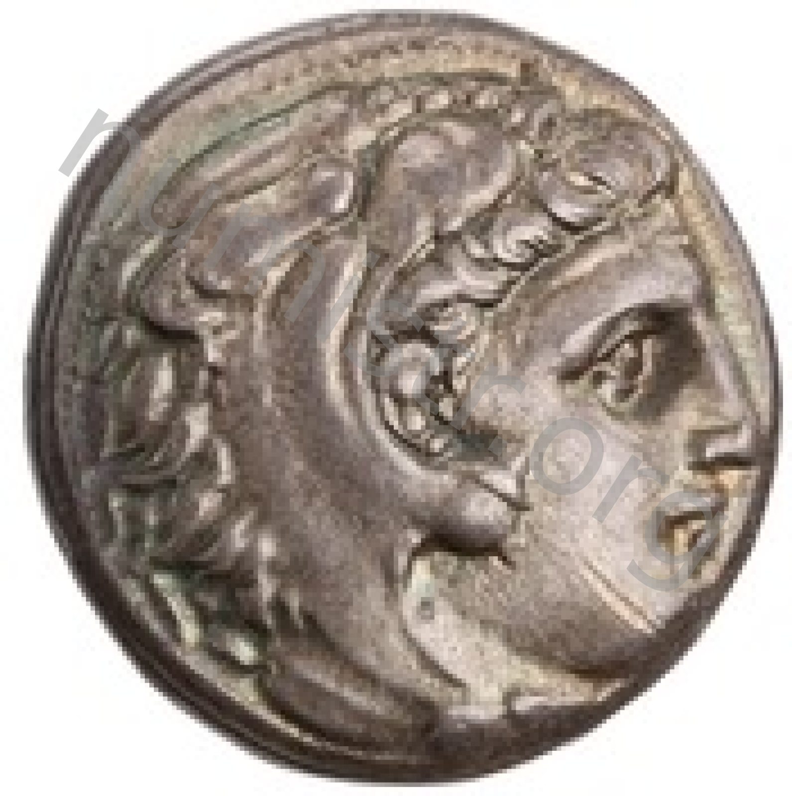 Head of beardless Heracles right wearing lion skin headdress -[en]
