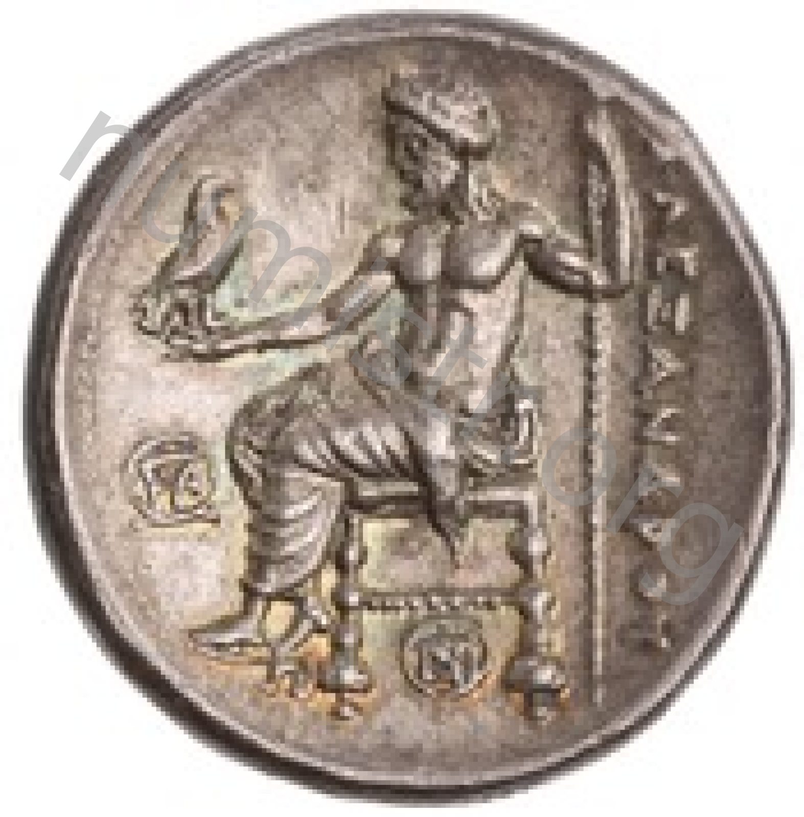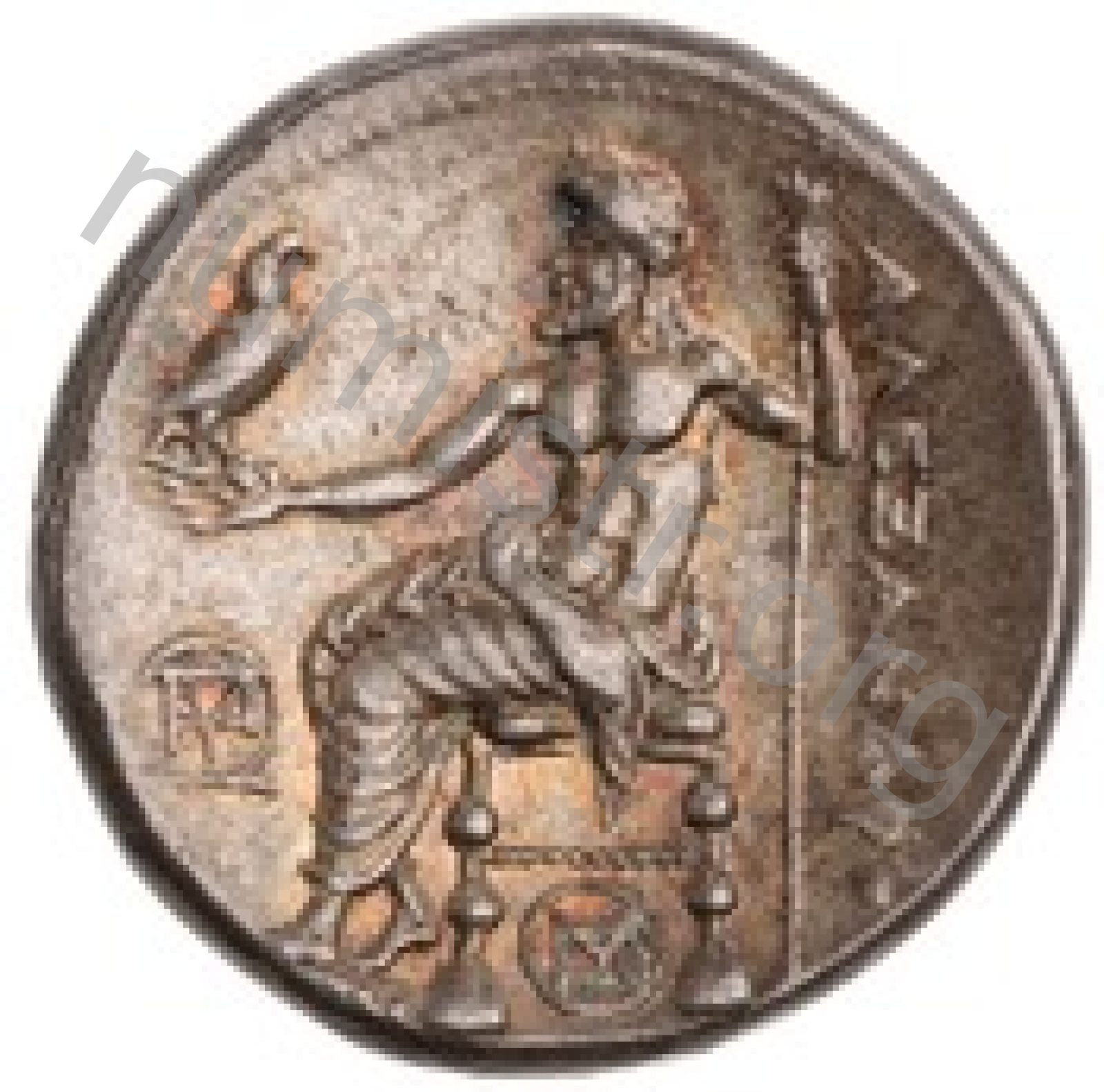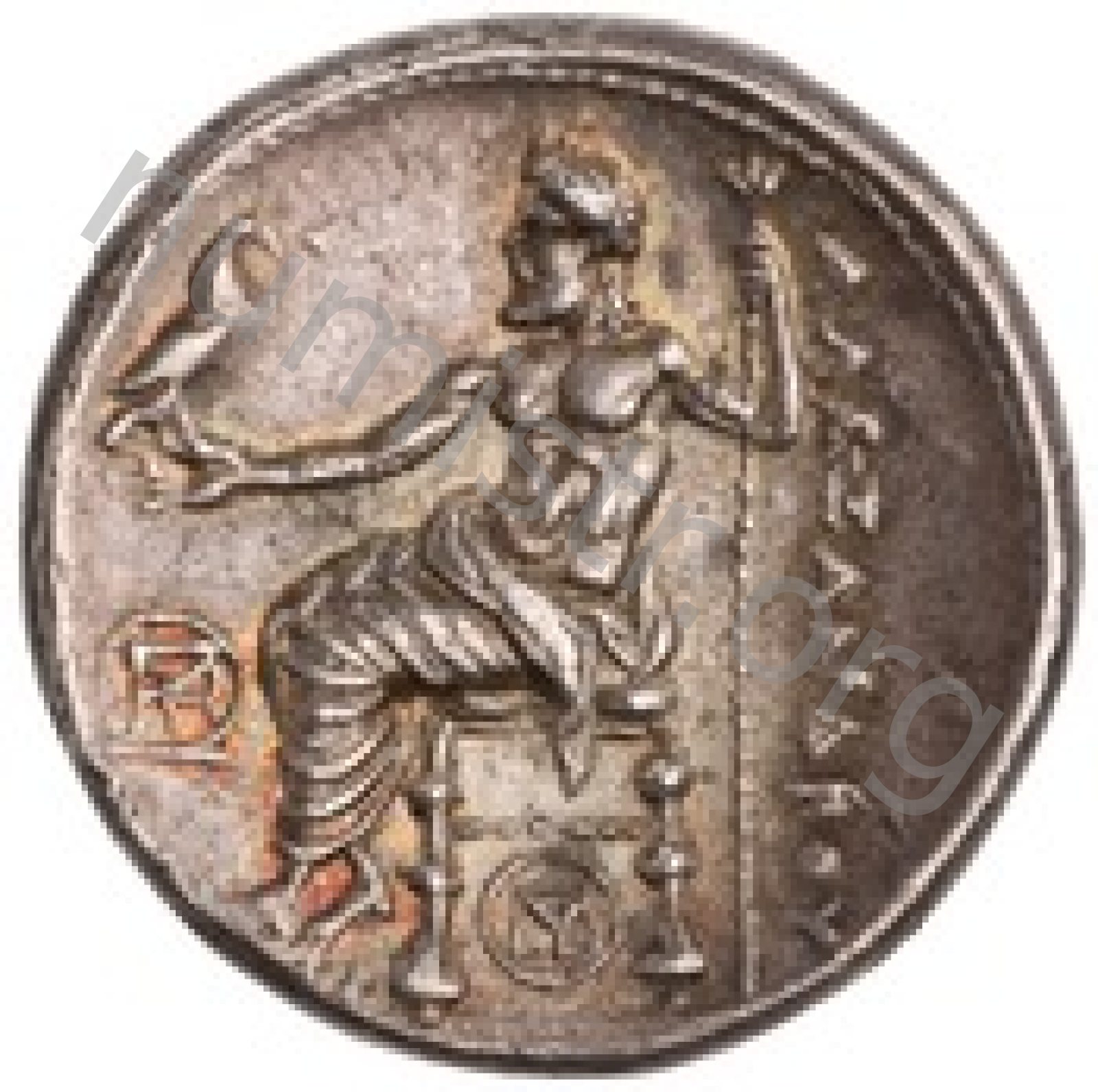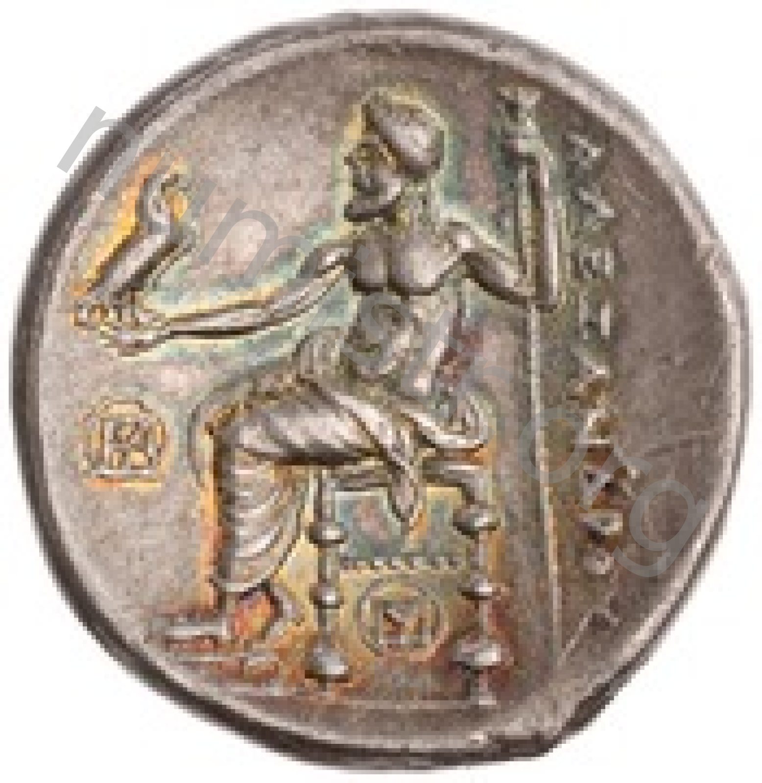 Zeus tabure-tahtta oturuyor sol elinde kartal sağ elinde asa var.