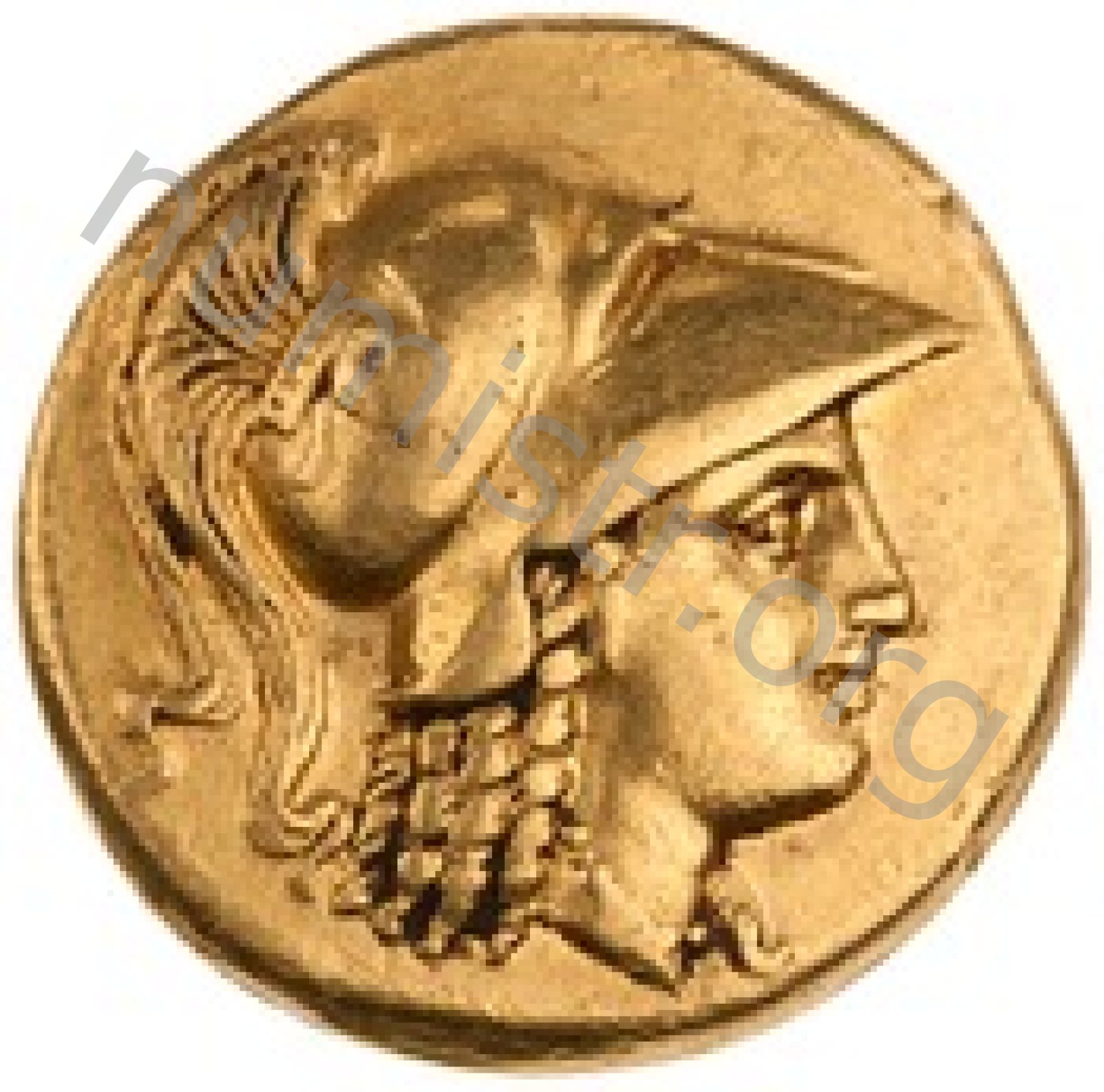 Head of Athena right wearing Corinthian helmet with crest -[en]